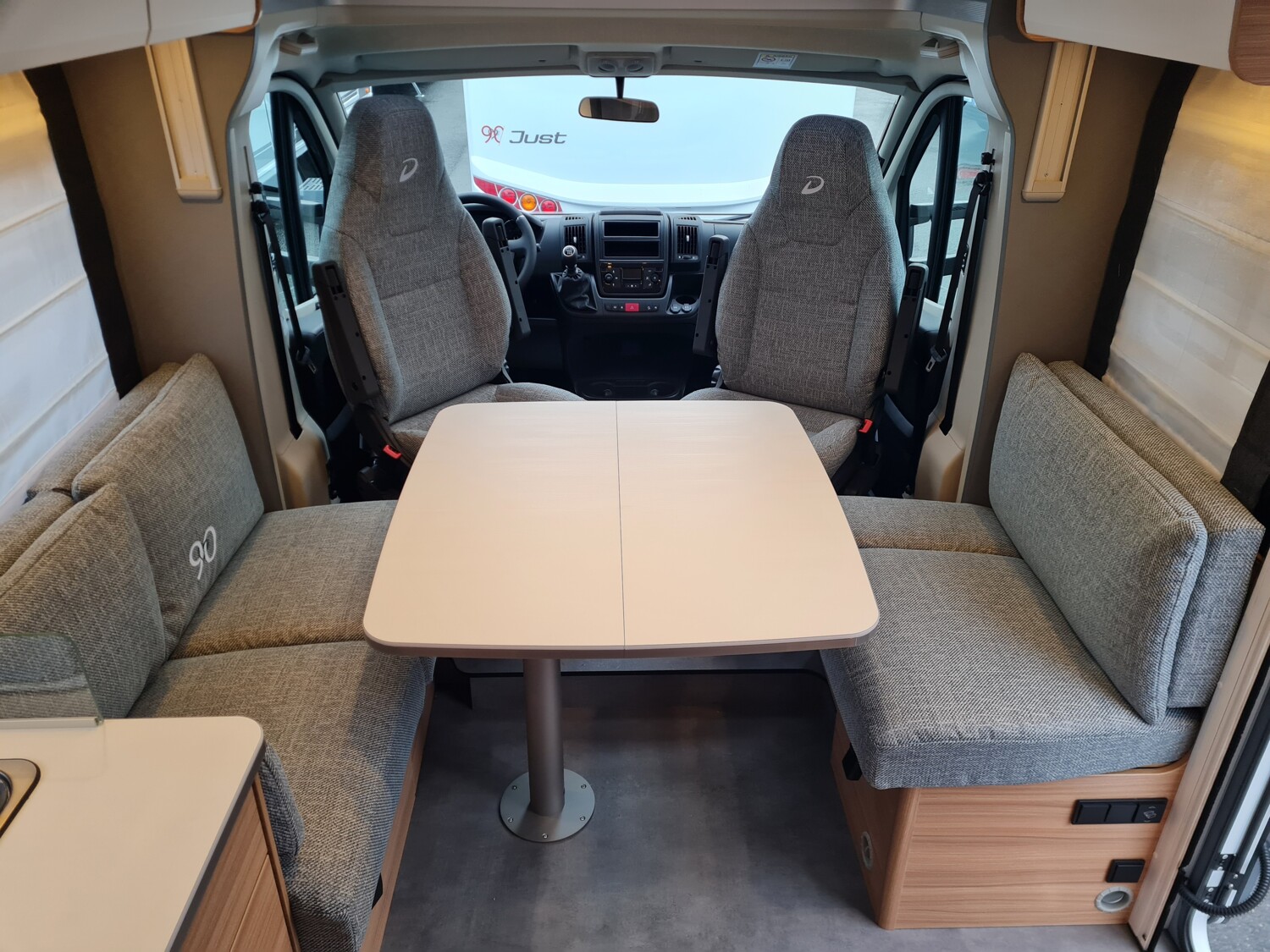 - Just 90 - Jubiläums-Ausstattung ((bereits im Grundpreis Just 90 enthalten) Radioantenne DAB+ im rechten Außenspiegel integriert, Vorbereitung für Radiosystem inkl. Lautsprechern im Fahrerhaus, Verdunklungsjalousien im Fahrerhaus, Höhe- und Neigeverstellung und Doppelarmlehnen für Fahrer- und Beifahrersitz, Fliegengitter-Aufbautür, 70 cm breite Wohnraumtür mit Fenster inkl. Verdunkelung und Zentralverriegelung (inkl. Fahrerhaustüre), Panorama-Dachhaube 70x50 cm im Wohnraum, Ausstellfenster in der T-Haube, Duschrost, Vorzeltleuchte 12 V)