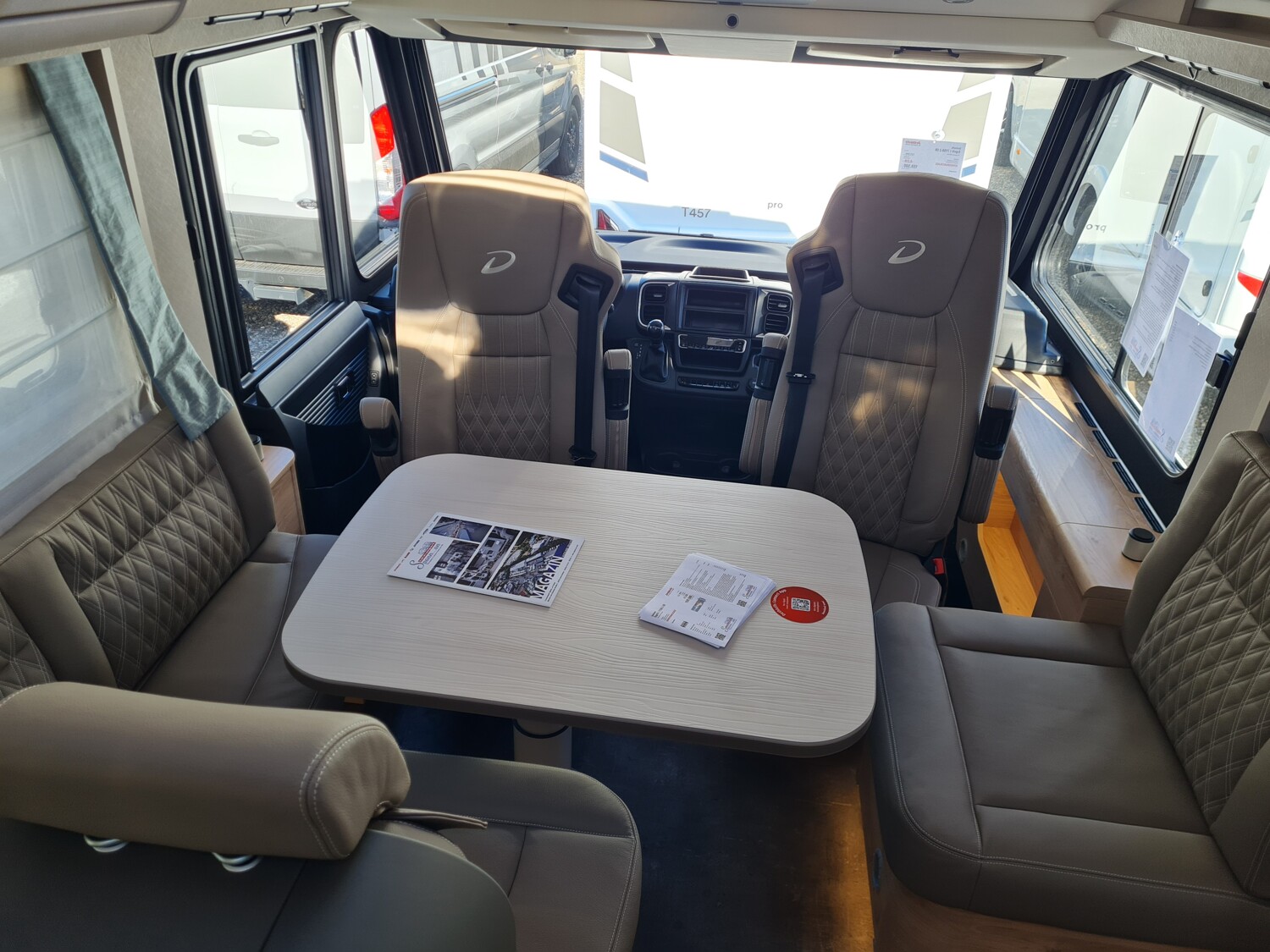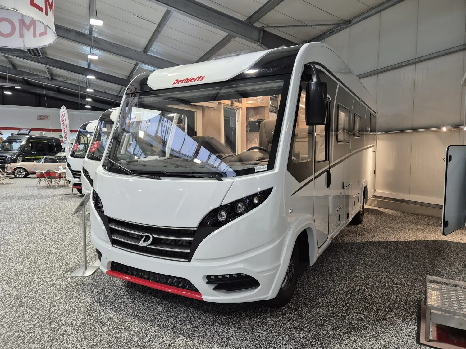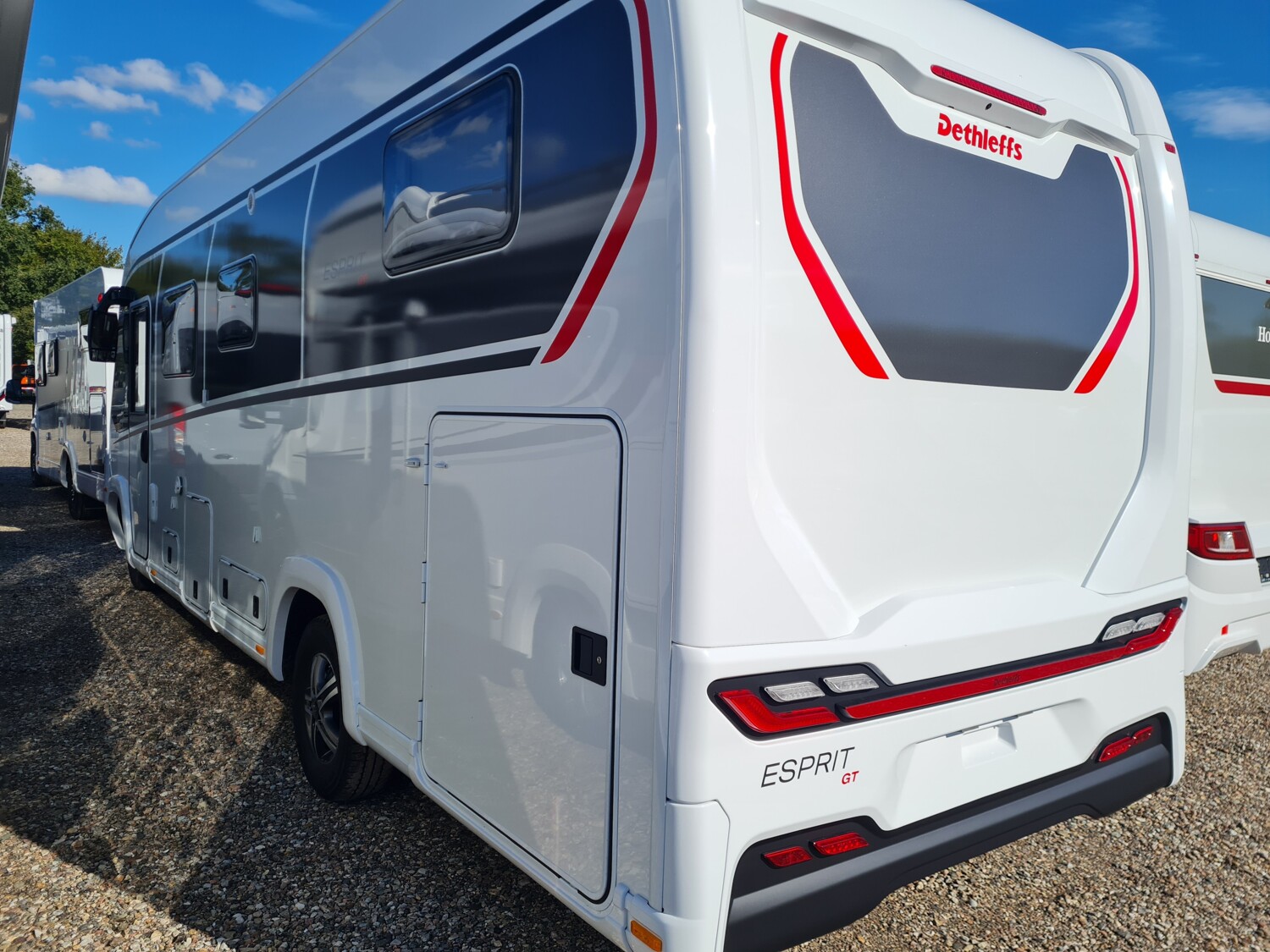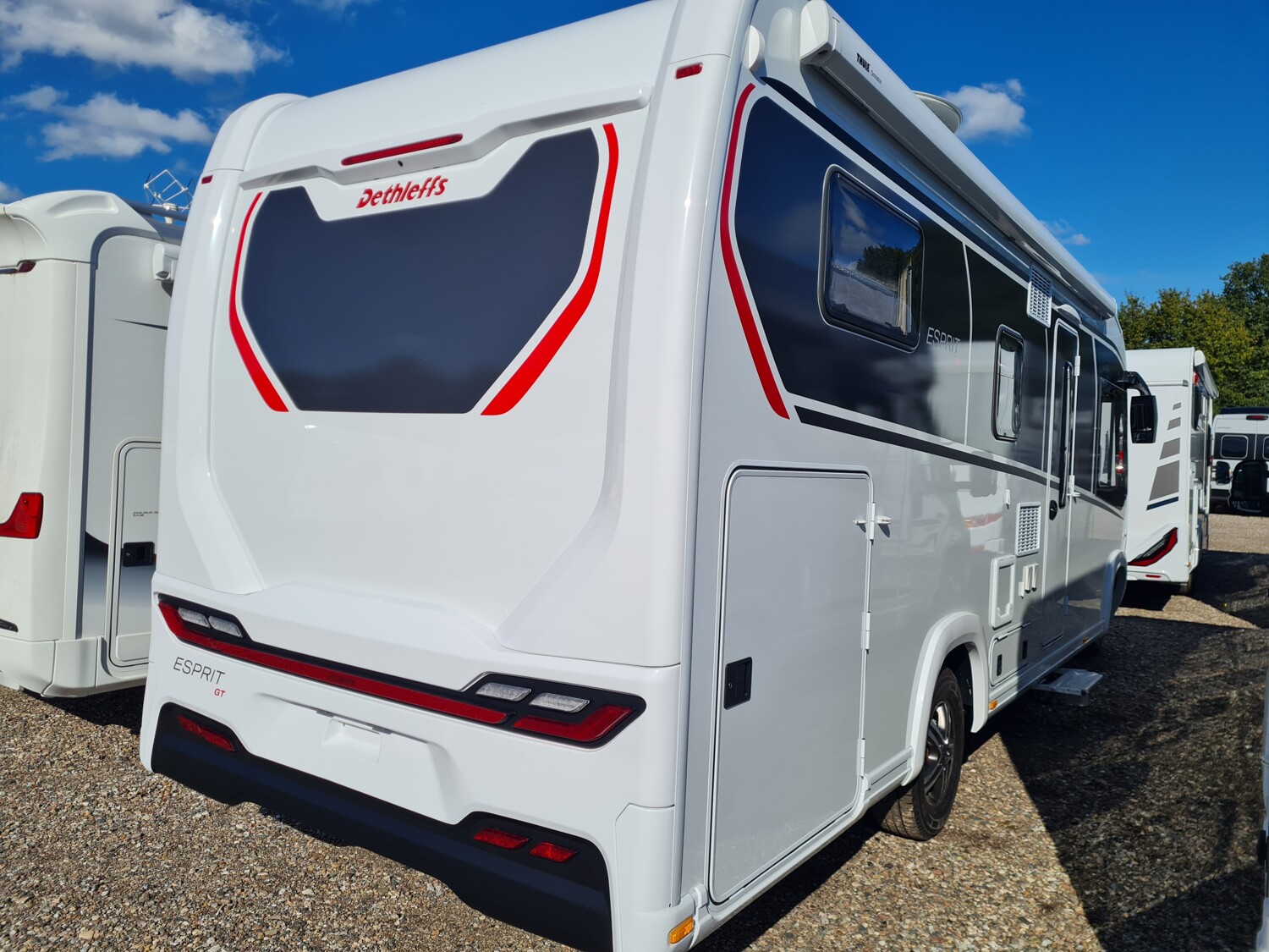 - Esprit GT Advance (Vorbereitung für Radiosystem inkl. Soundpaket im Fahrerhaus, Radioantenne DAB+ auf dem Dach montiert, Fahrerhaustüre links, Panorama-Dachhaube 75x105 cm im Wohnraum, Light Moments: Indirekte Ambientebeleuchtung über den Dachstauschränken, Stützen (2 Stk.) für Anbau hinten, Elektrischer Frontscheiben-Rollo, Automatische Gasflaschenumschaltung inkl. Crash Sensor, EisEx und Gasfilter, Dunstabzugshaube (Abluft) mit Zugluft-Stopper, Integrierte Einlinsen Rückfahrkamera, Zentralverriegelung für Fahrerhaus-, Wohnraumtüre und Garagentüren, LED-Abblendlicht, Sonnenblenden seitlich, als Rollo für Fahrer und Beifahrer, Panorama-Dachhaube 70 x 50 cm im Schlafraum, Innendesign GT inkl. erweiterter Küchenrückwand, Außendesign GT Advance (Heckleuchtenträger mit schwarzem Diffusor, lackierung I-Front teilweise schwarz, Kühlergrill mit Chromkeder, Skidplate "rot"), Alufelgen Dethleffs 16 Zoll, Hoher charakteristischer Dethleffs Exklusiv Heckleuchtenträger mit ShapeLine LED Rückleuchten, in Heckspoiler integrierter 3. Bremsleuchte und eingezogener Heckwand)