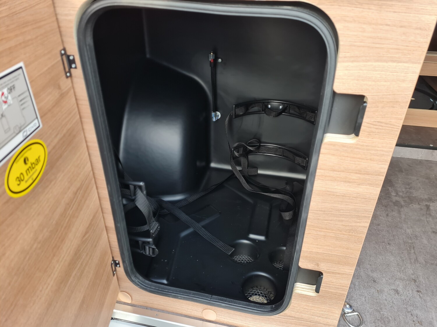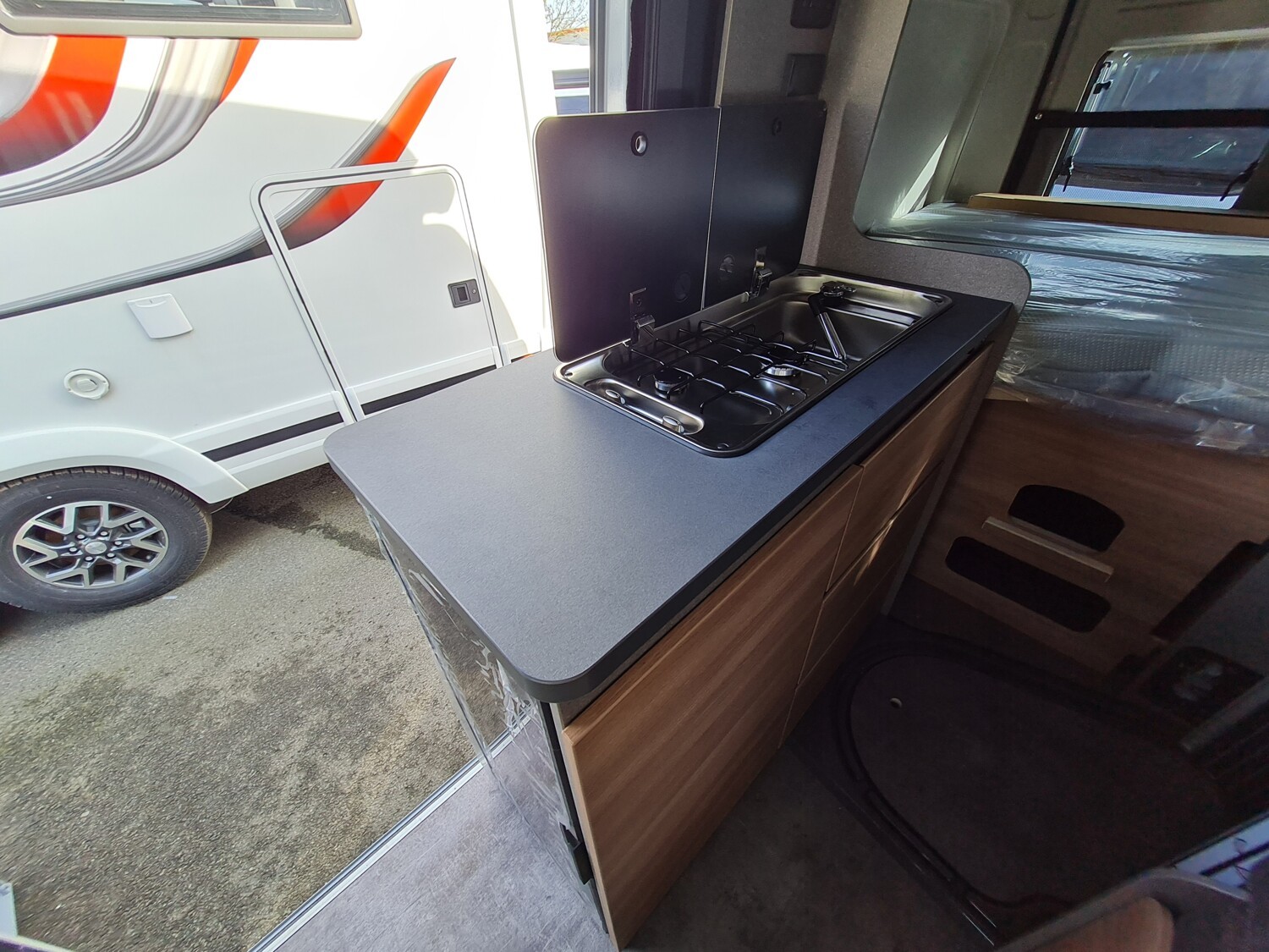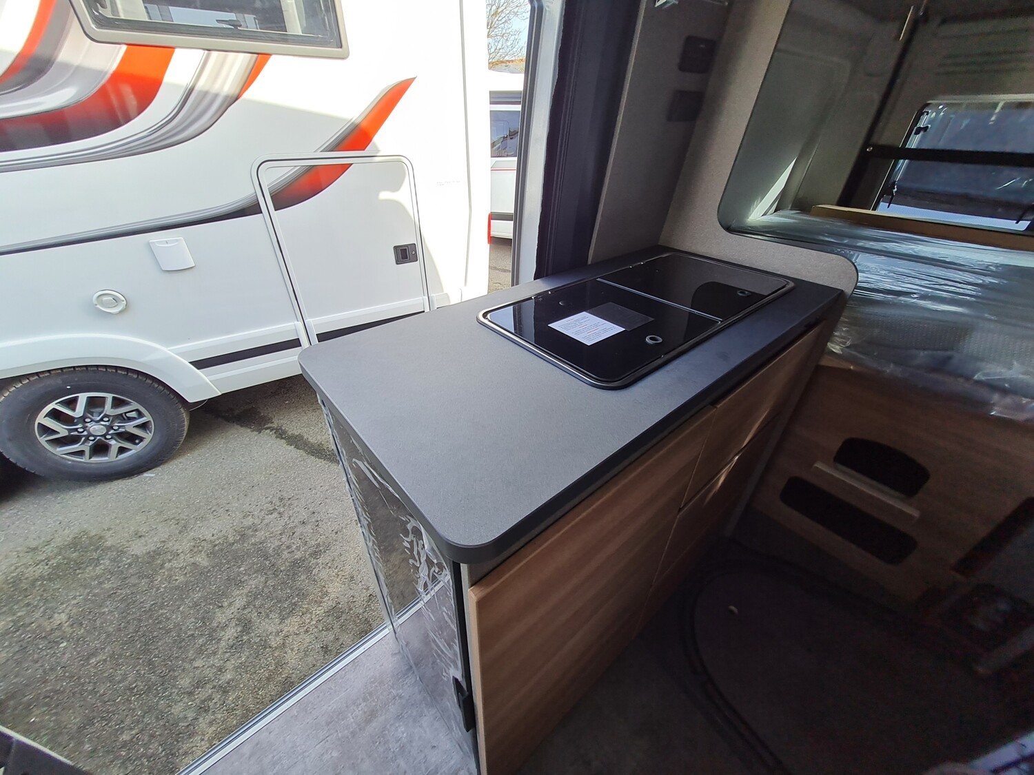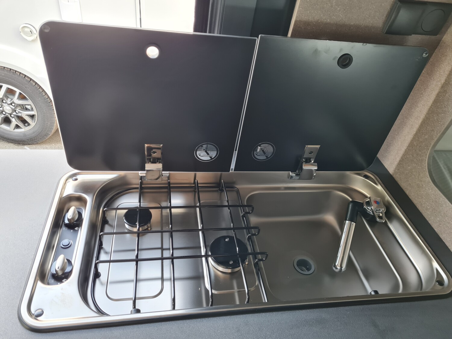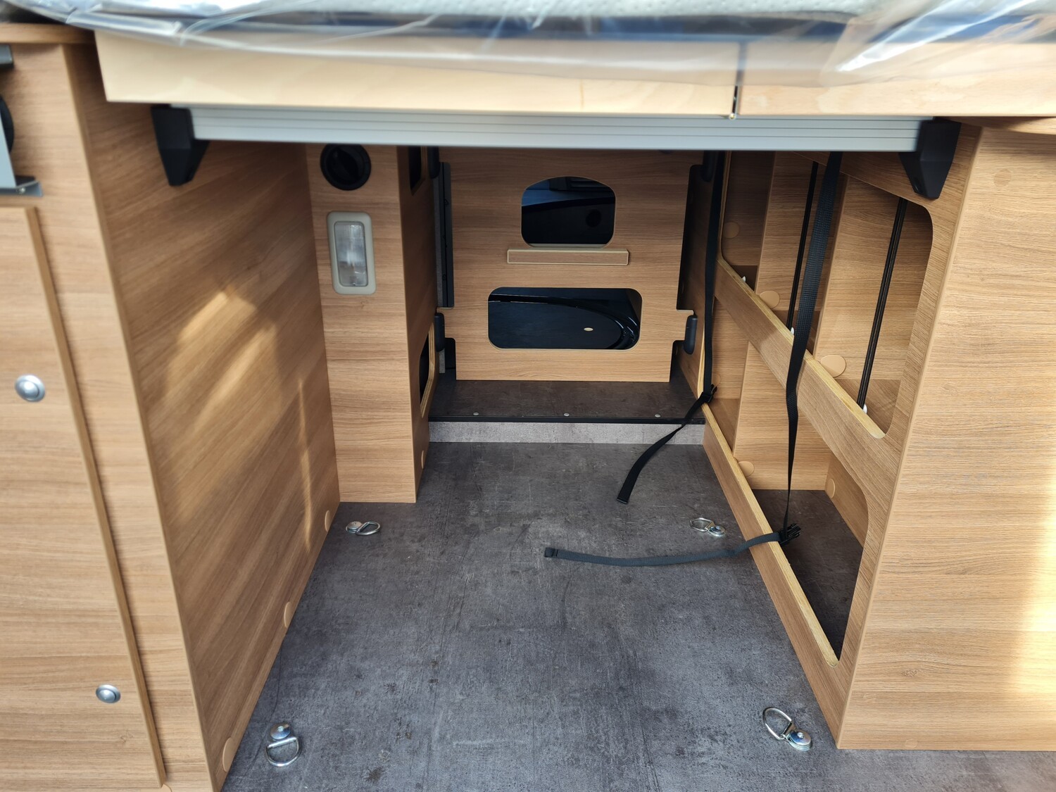 - Elektro Paket (LED-Lichtröhre in der Küche, Zusätzliche Doppel-USB-Steckdose im Bug links, 230-V-Steckdose im Oberschrank Bug links (Sitzgruppe), 12-V-Steckdose im Heckbereich links unten)