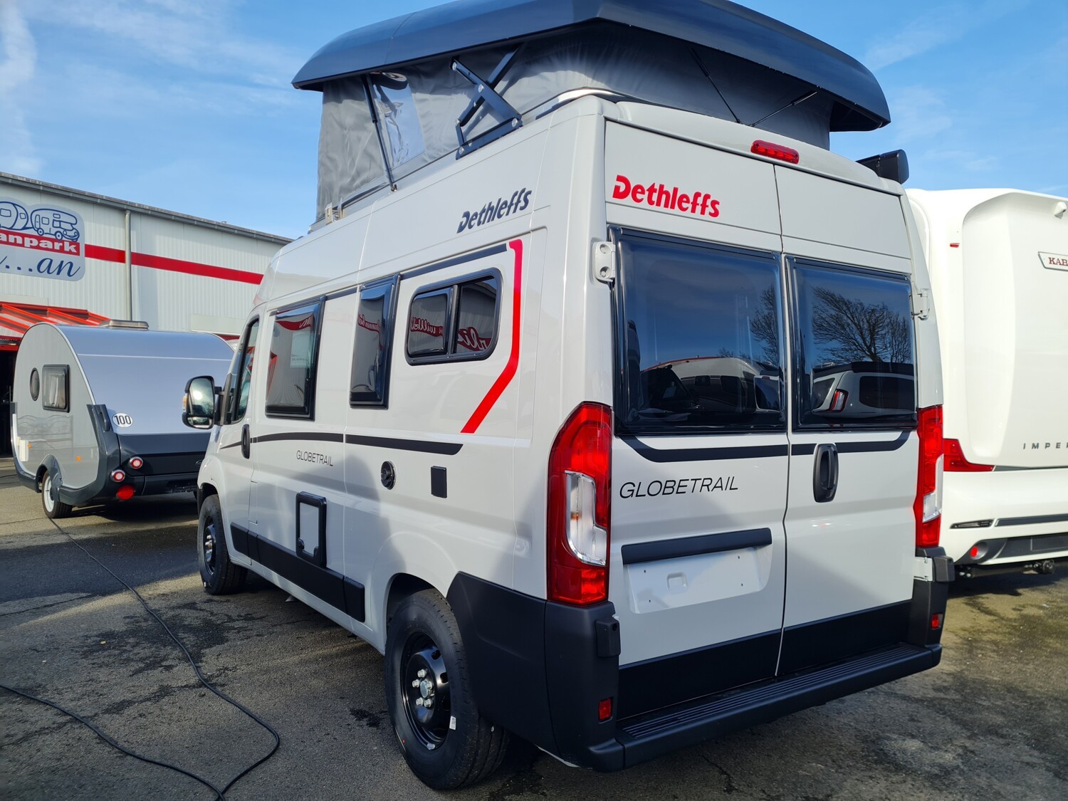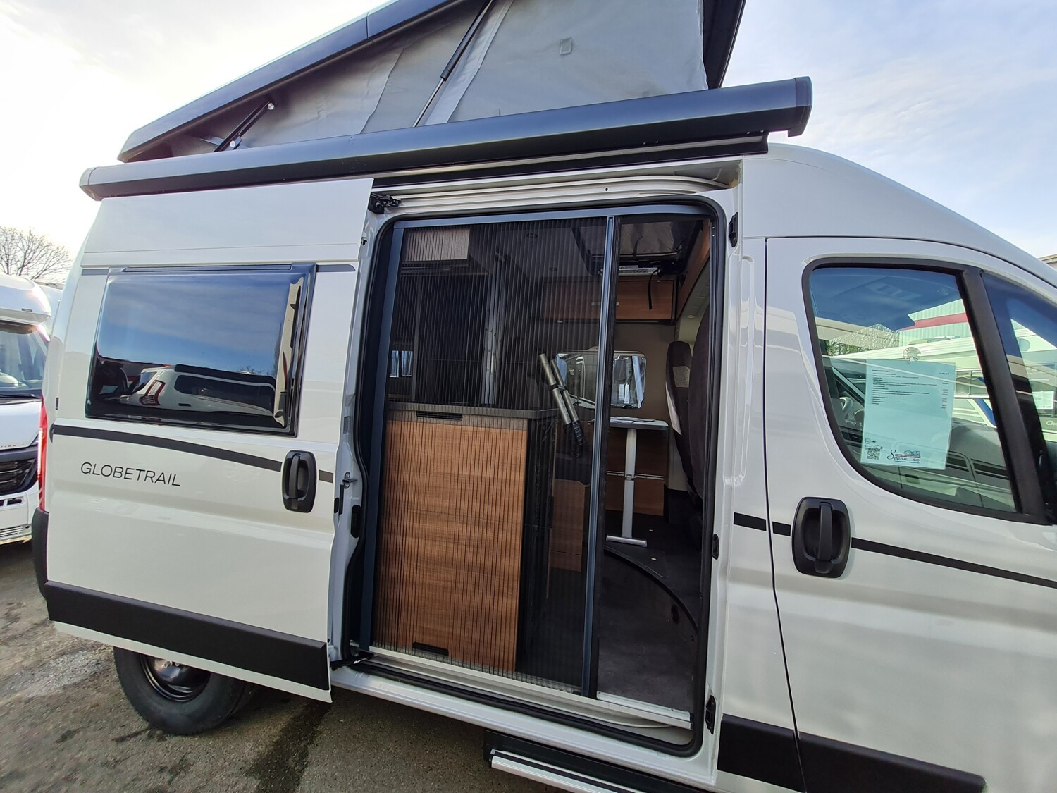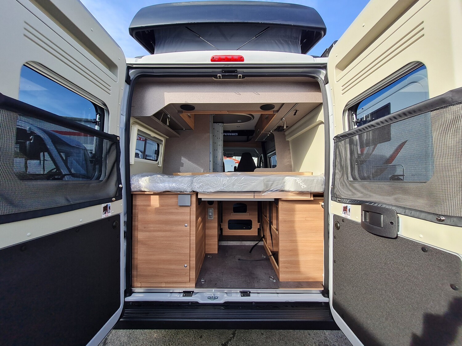 - Aufstelldach schwarz, vorne komplett zu öffnen inkl. elektrischem Schließassistenten, Fliegengitter, Schwanenhalsleuchte und USB-Steckdose, mit hochwertiger Matratze