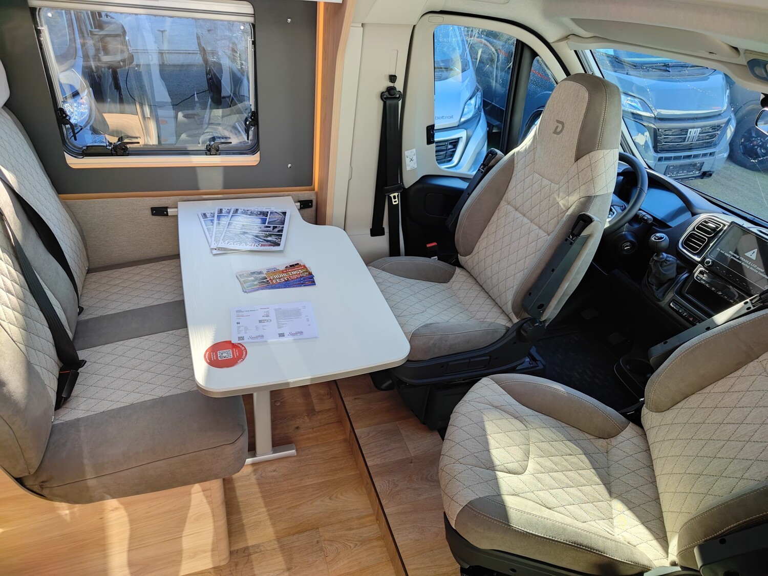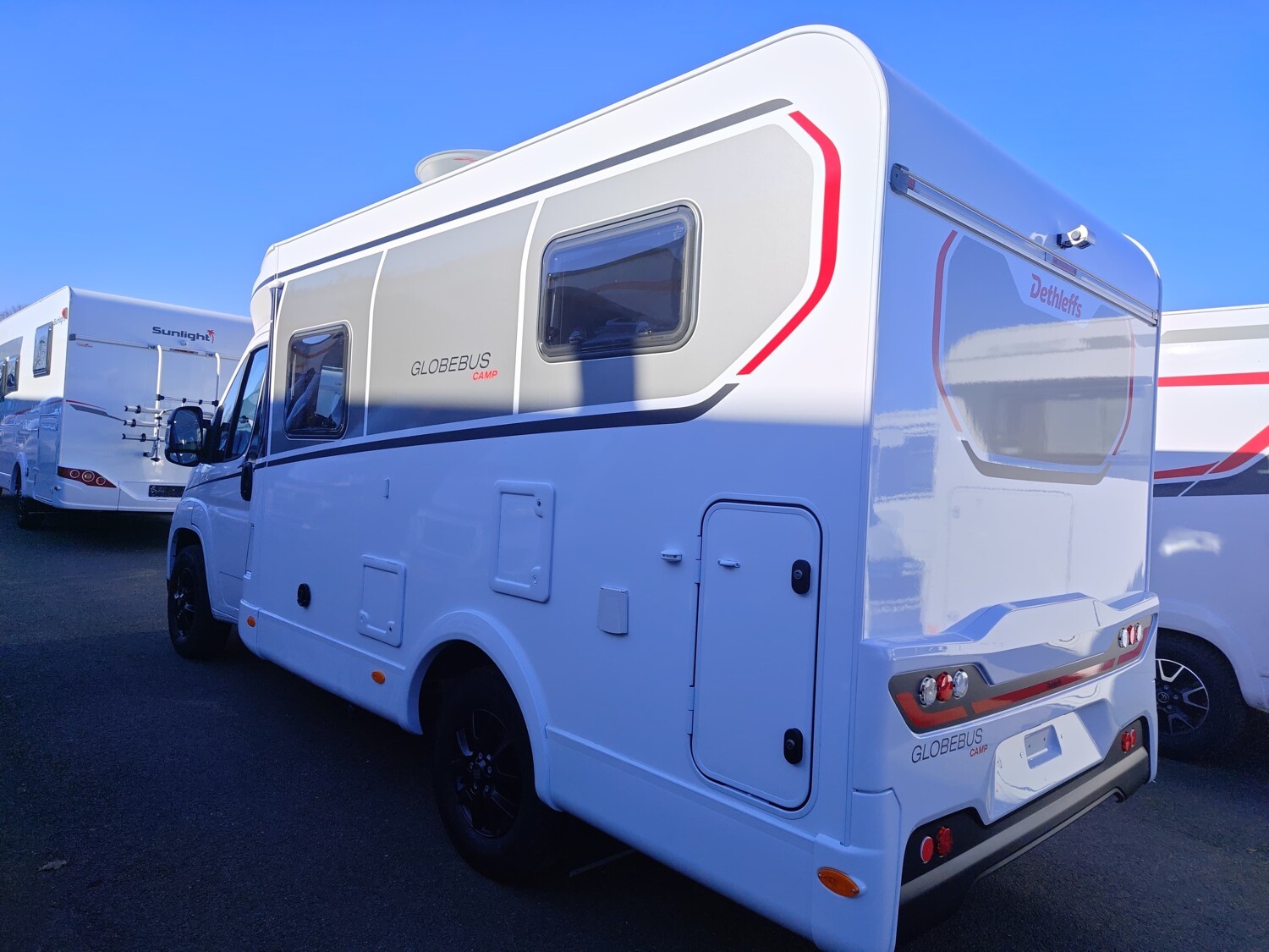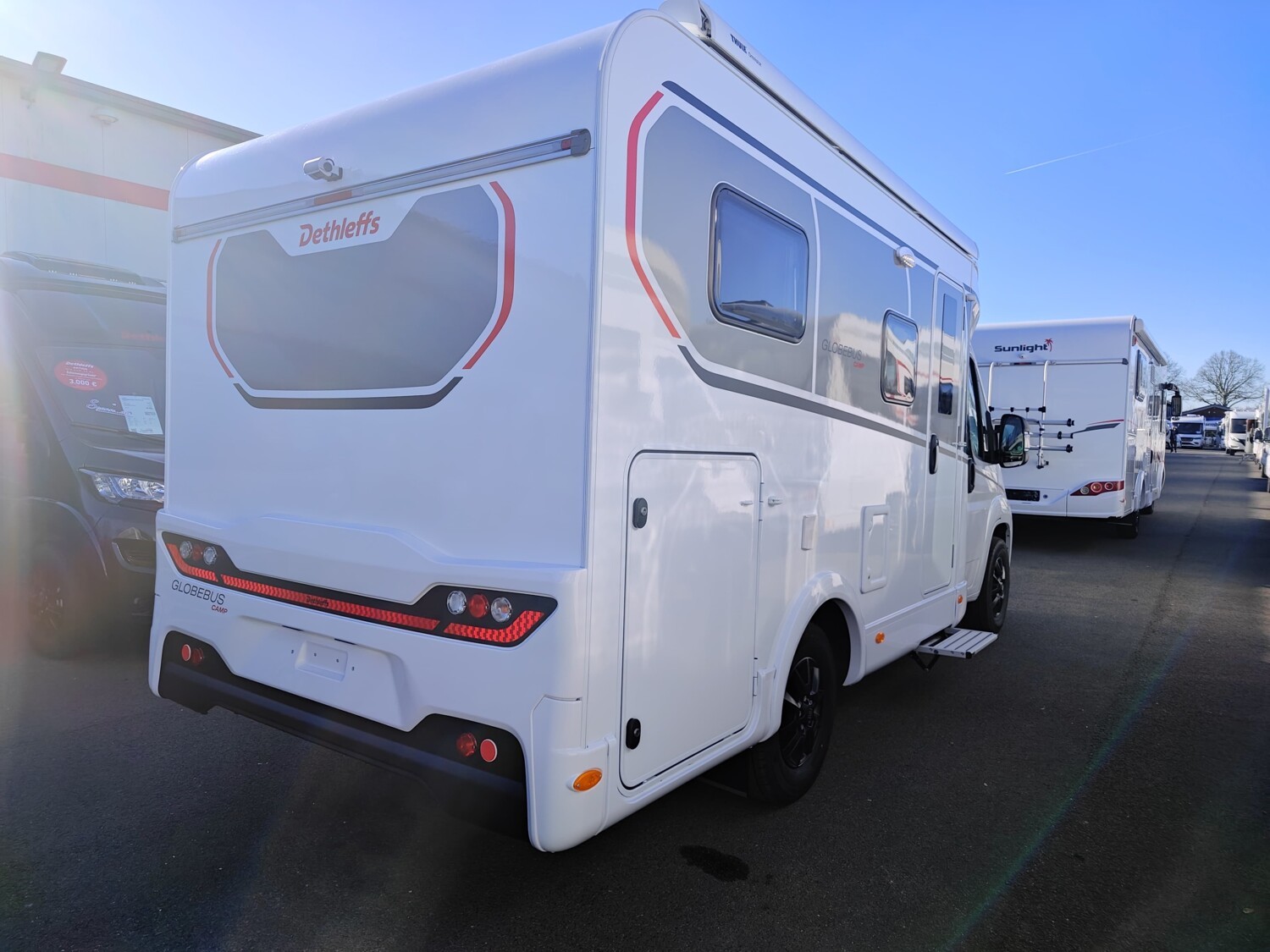 - Active-Paket T1 (Verdunklungsjalousien im Fahrerhaus, Wohnraumtür mit Fenster inkl. Verdunkelung und Zentralverriegelung (inkl. Fahrerhaustür), Panorama-Dachhaube 70 x 50 cm im Wohnraum, Küchenrückwand, Light Moments: Küchenrückwand beleuchtet, Light Moments: Fensterverkleidung im Wohnraum beleuchtet, Light Moments: Indirekte Ambientebeleuchtung über den Dachstauschränken, Light Moments: Indirekte Wandflächen-Ambientebeleuchtung, Fahrerhaus Klimaanlage automatisch, Digitaler Tacho mit 7"-Kombiinstrument und Wireless Phone Charger in der Mittelkonsole, Voll LED Frontscheinwerfer, Elektrische Feststellbremse, Rückfahrkamera (Einfachkamera), Dethleffs Naviceiver inkl. DAB+, Truck Navigation, Wireless Apple CarPlay und Android Auto, Doppelverglaste Rahmenfenster mit Verdunklung & Mückenschutz, Raumhoher Kompressor Kühlschrank mit separatem Frosterfach (131 l), Duschrost, Digitales Bedienelement für Warmluftheizung, Vorbereitung Solar, Vorbereitung Dach-Klimaanlage, Vorbereitung zweite Rückfahrkamera, Vorbereitung SAT-Anlage, Wohnwelt Jupiter, Active Außendesign (Heckleuchtenträger mit schwarzem Diffusor, erweiterte Beklebung, Skidplate "rot"), Sitzgruppe mit Gurtbank inkl. zwei 3-Punkt-Gurten und einhängbarem und erweiterbarem Tisch, Stauraum-Türe links, Dachmarkise Omnistor 3.25 m (manuell), Abwassertank isoliert)