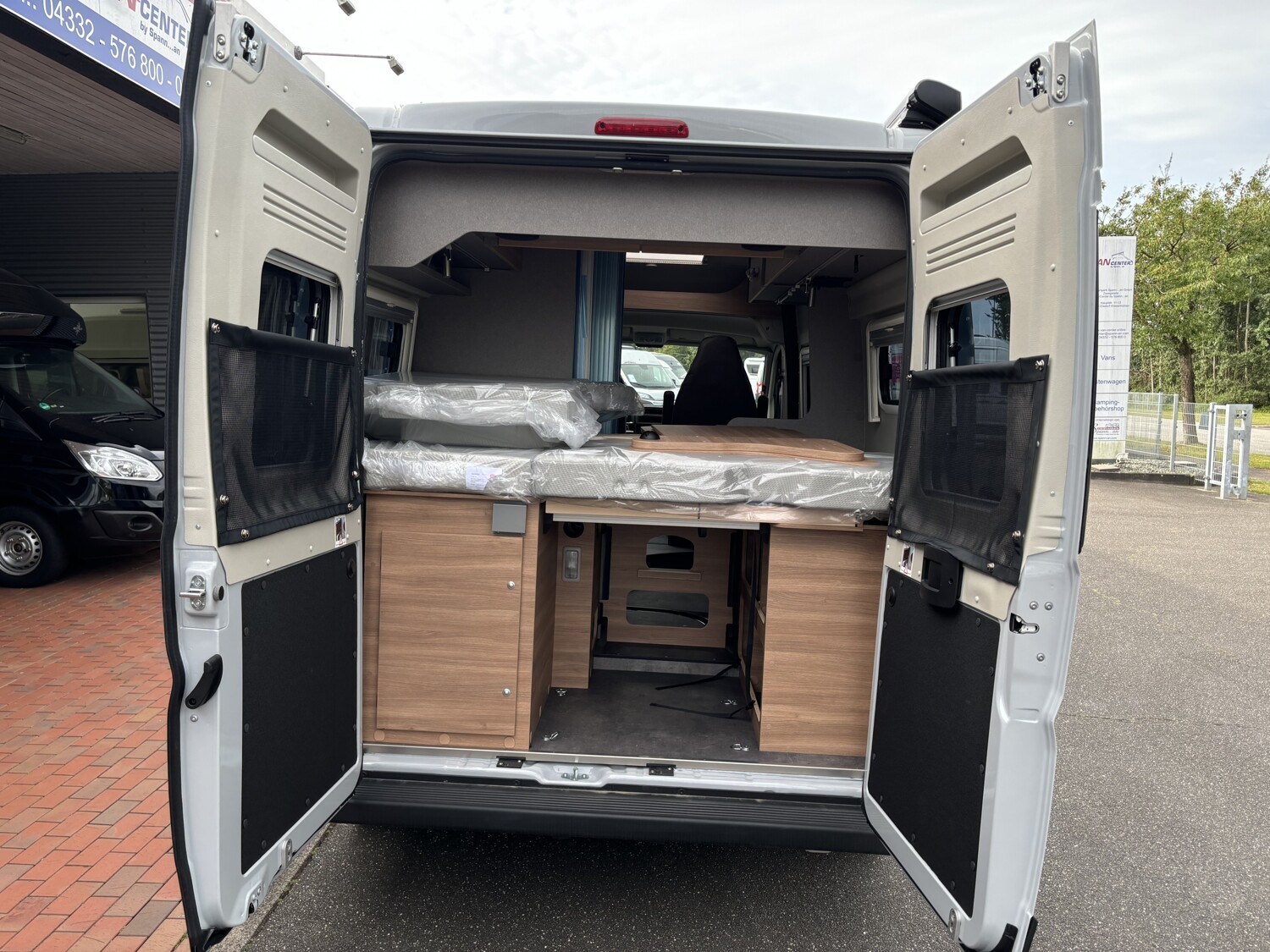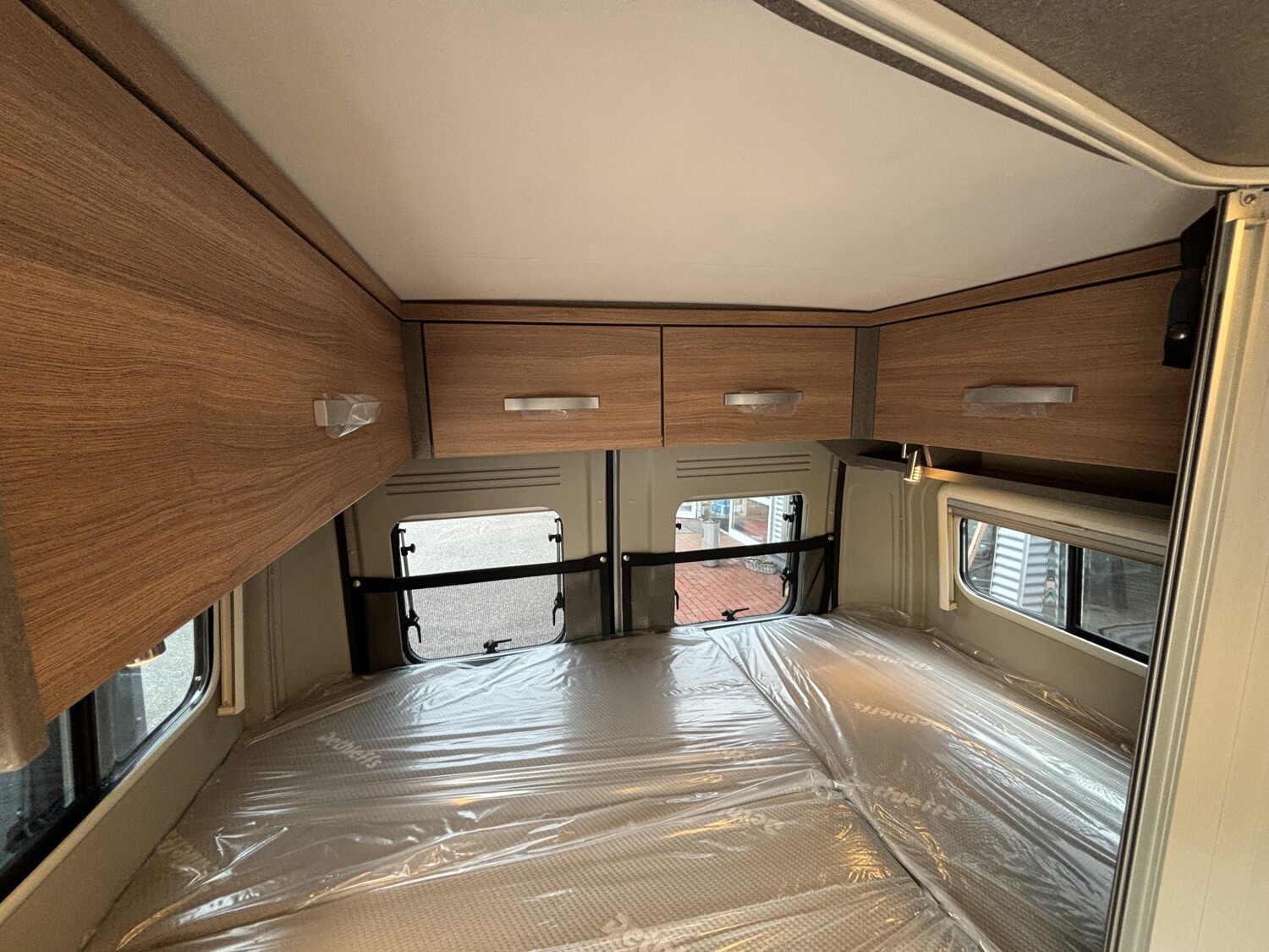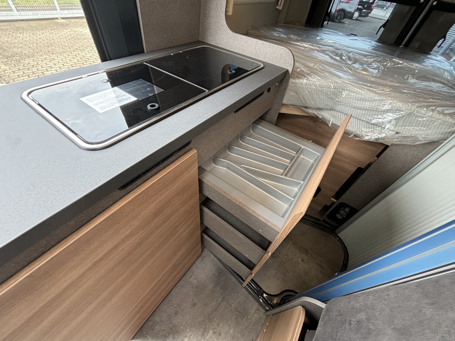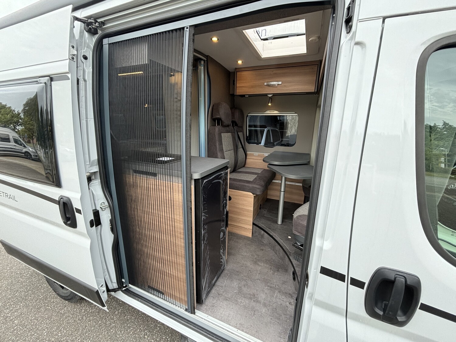- Schiebefenster mit Fliegenschutz und Verdunklungsrollo im Heck links