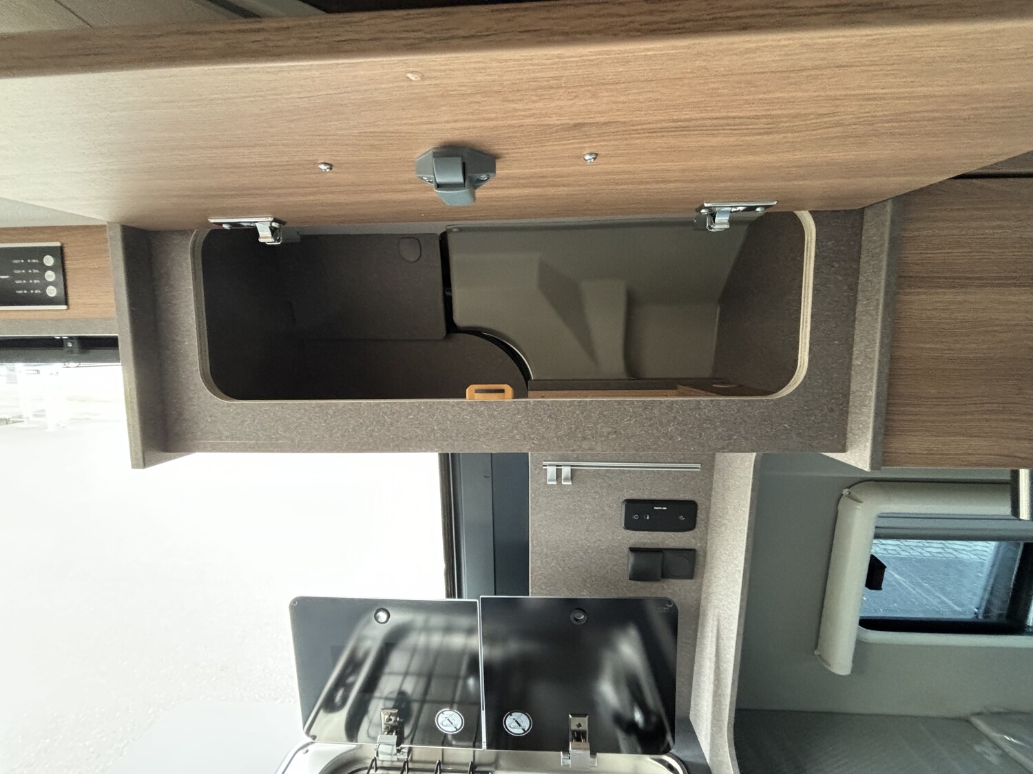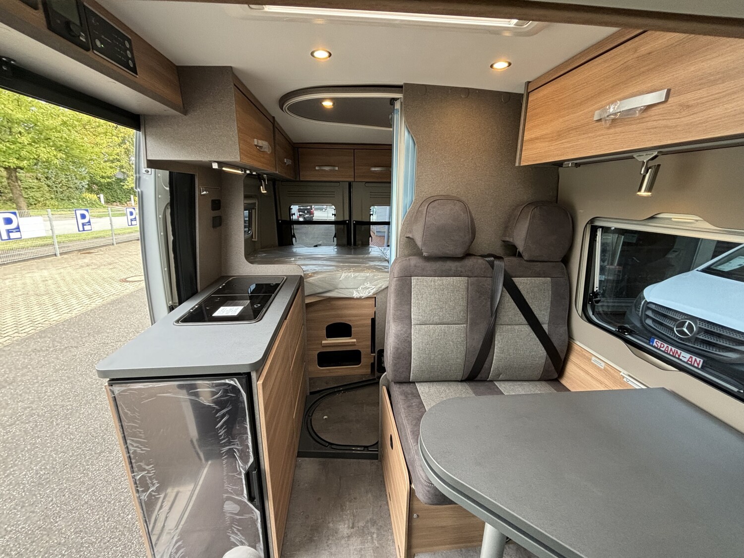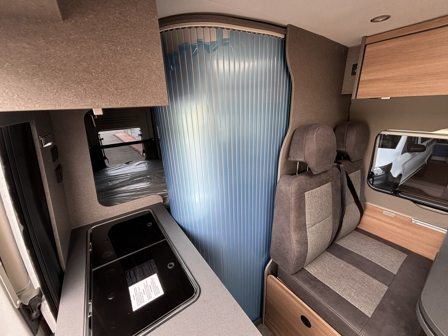- Schiebefenster mit Fliegenschutz und Verdunklungsrollo im Heck links
