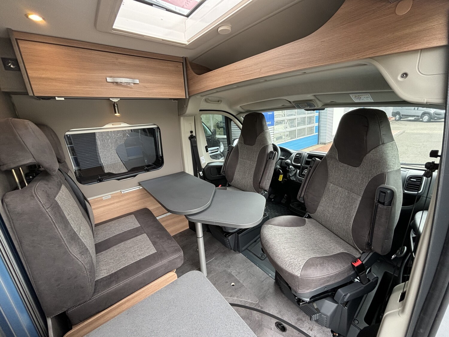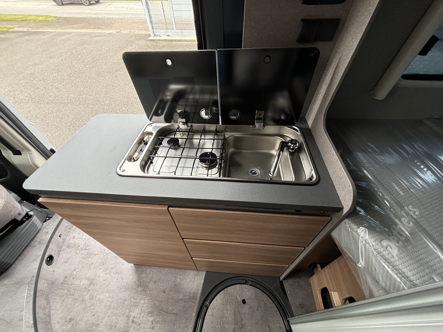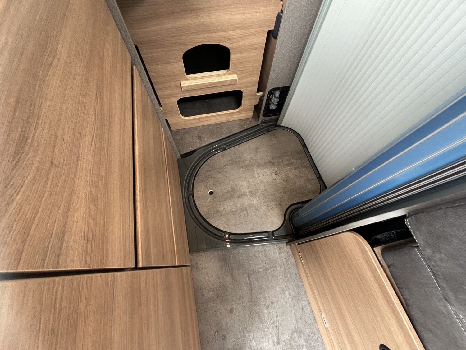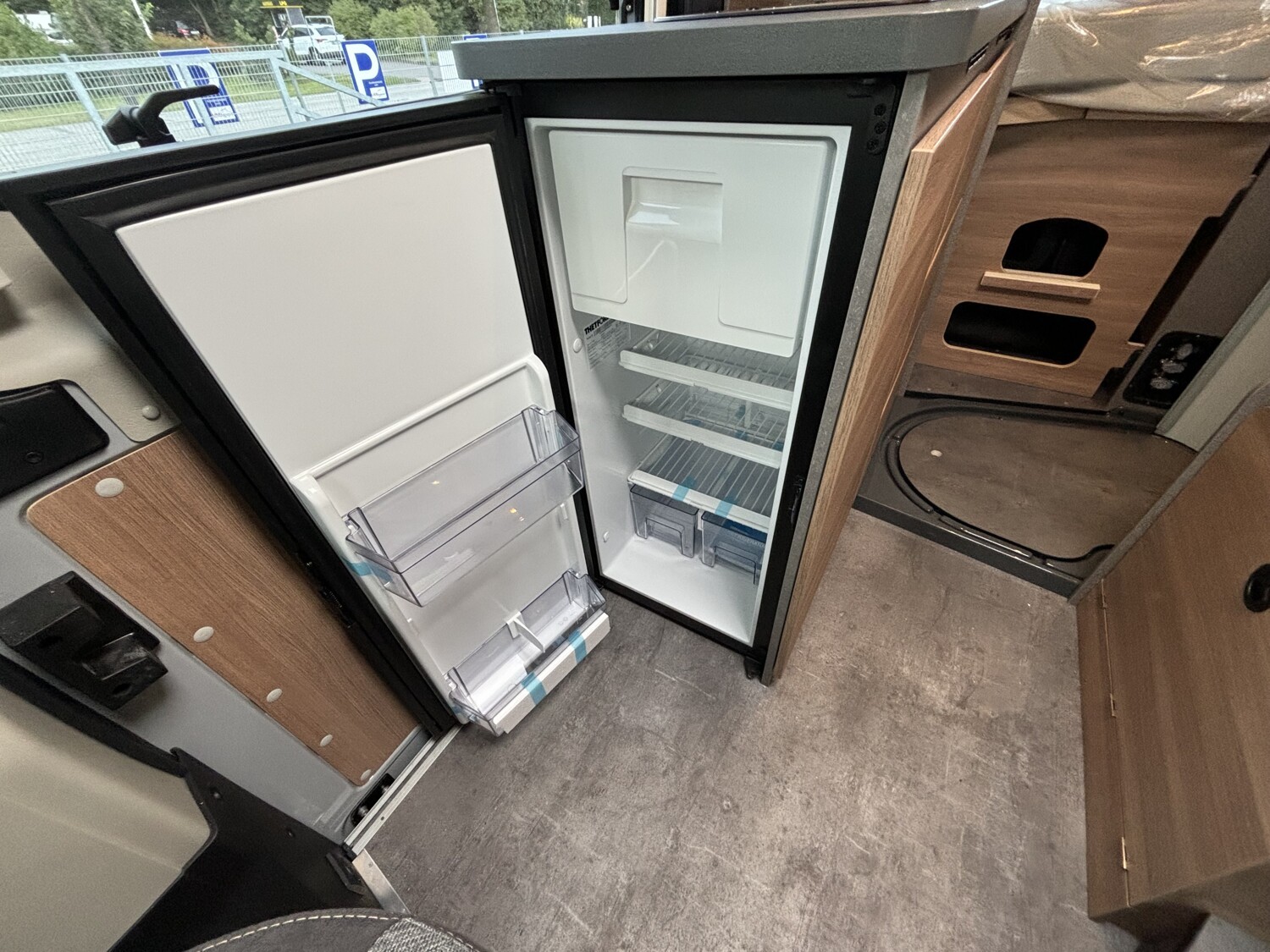 - Schiebefenster mit Fliegenschutz und Verdunklungsrollo im Heck links