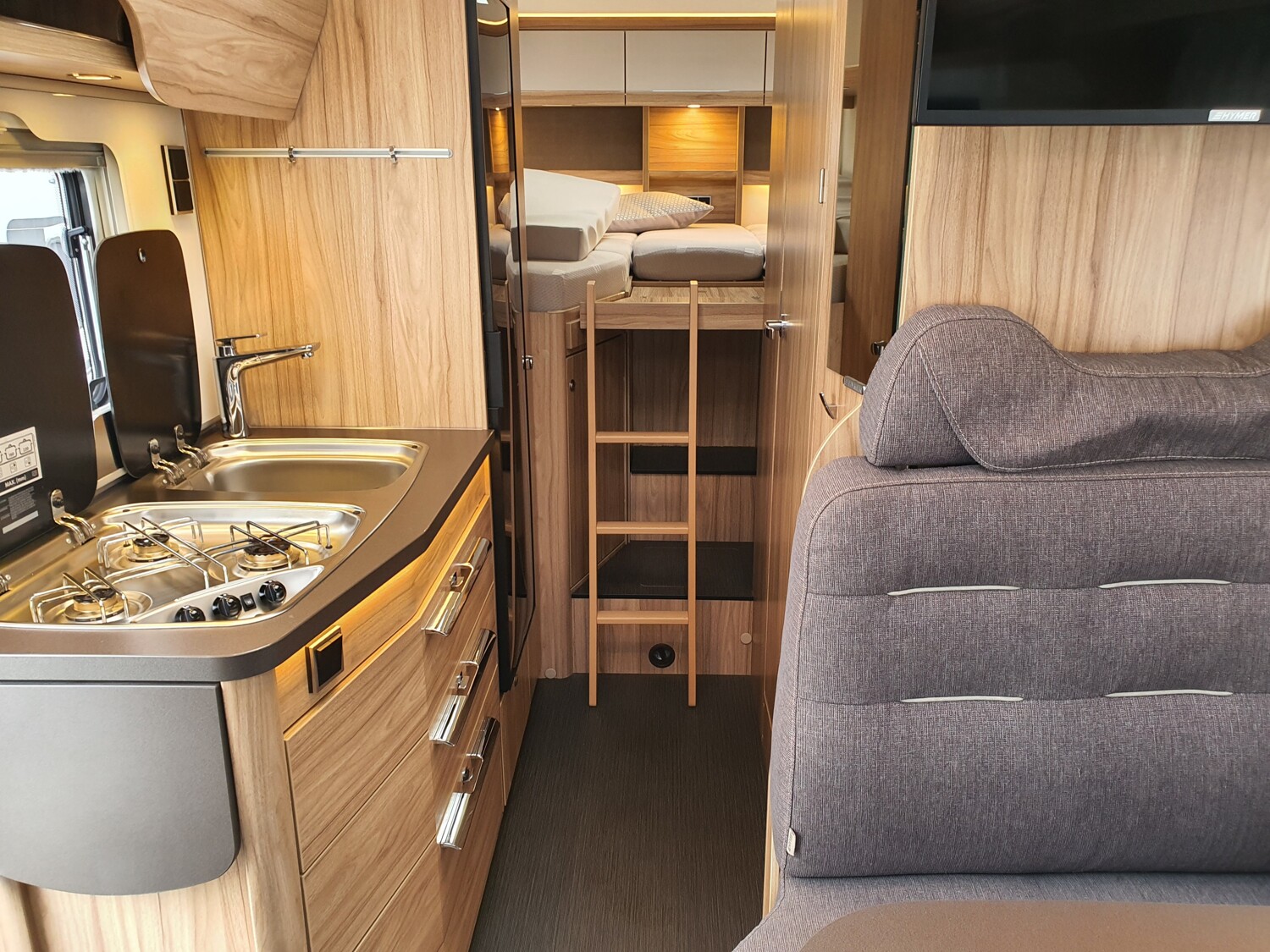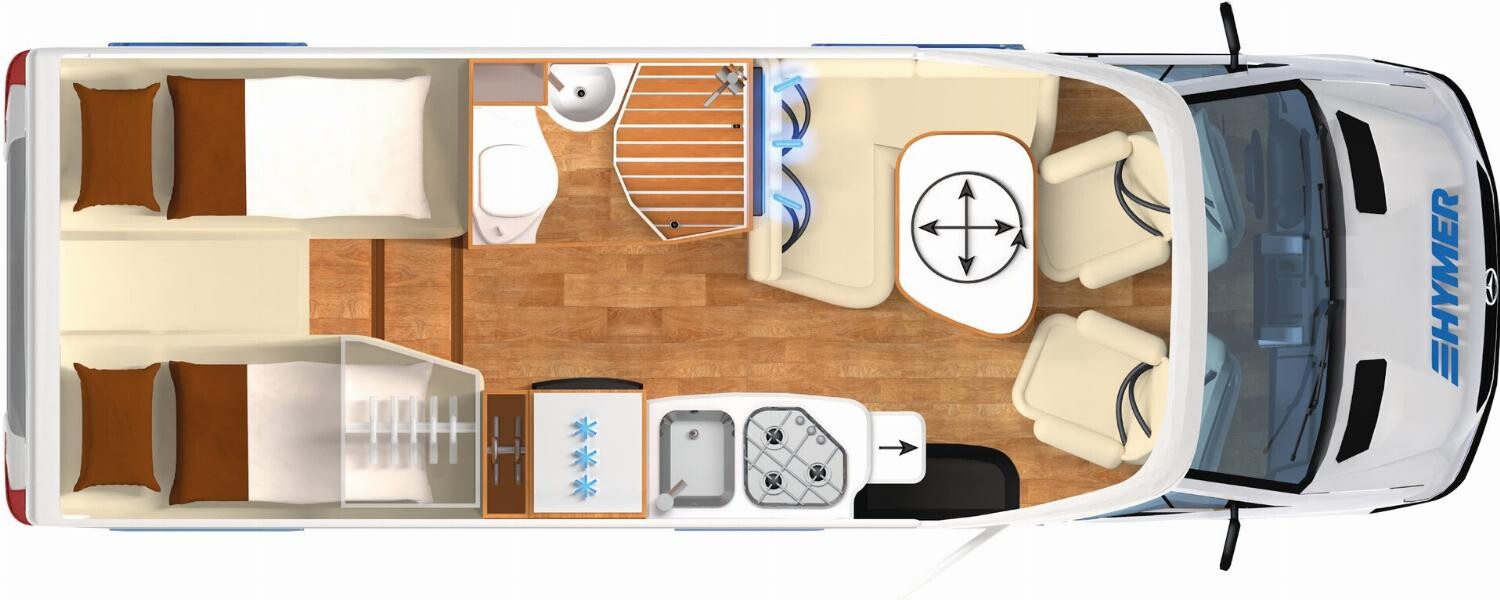 - Einzelbetten im Heck inkl. Bettverbreiterung mit umliegenden Dachstauschränken, Trennvorhang zum Schlafbereich