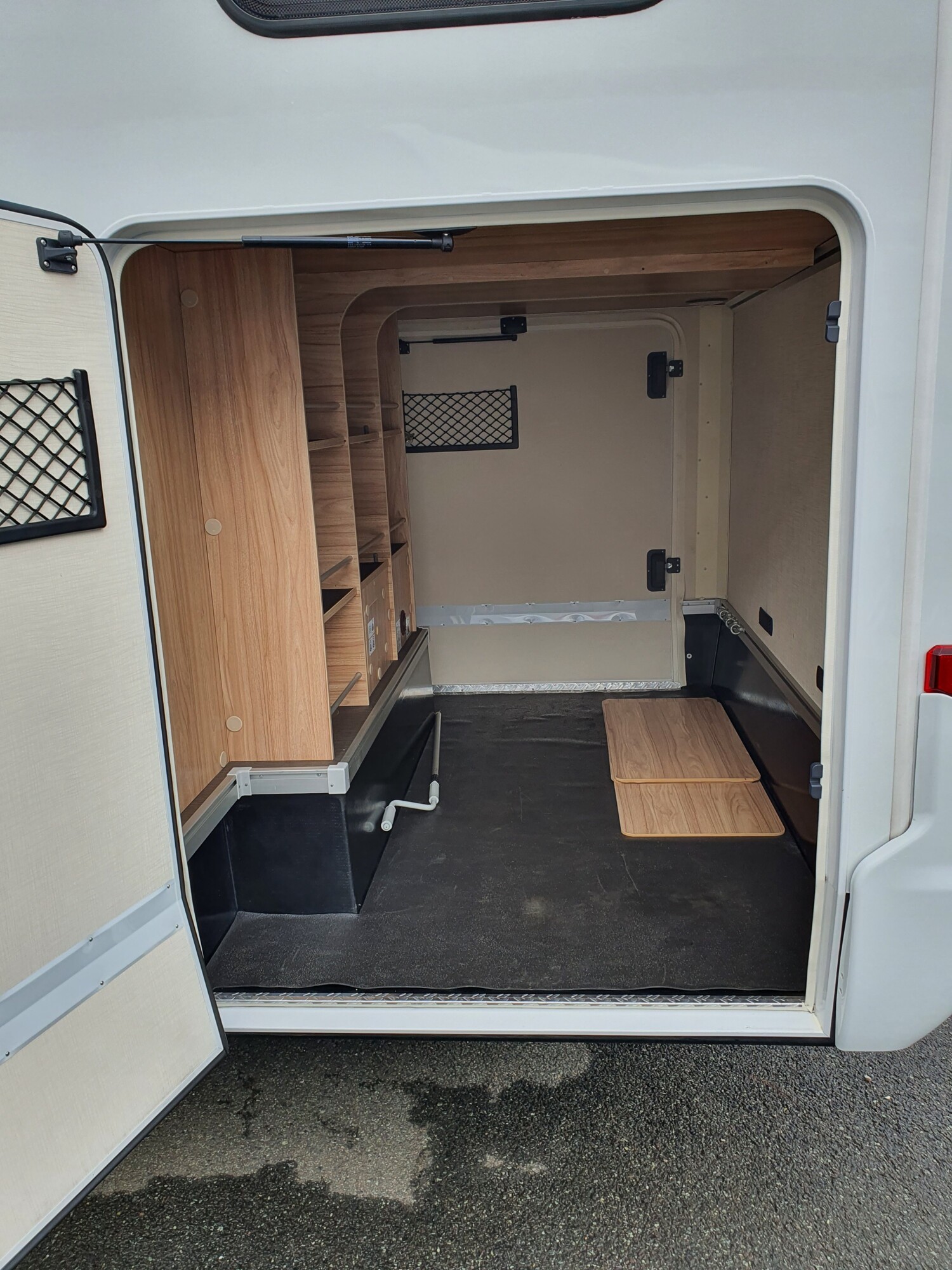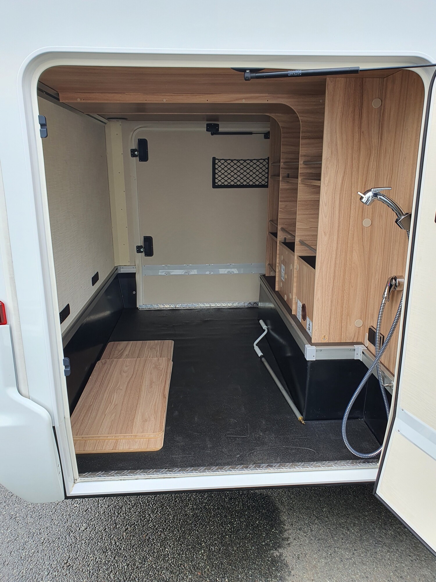 - große Heckgarage mit Türen rechts und links, Außendusche und Verzurrösen