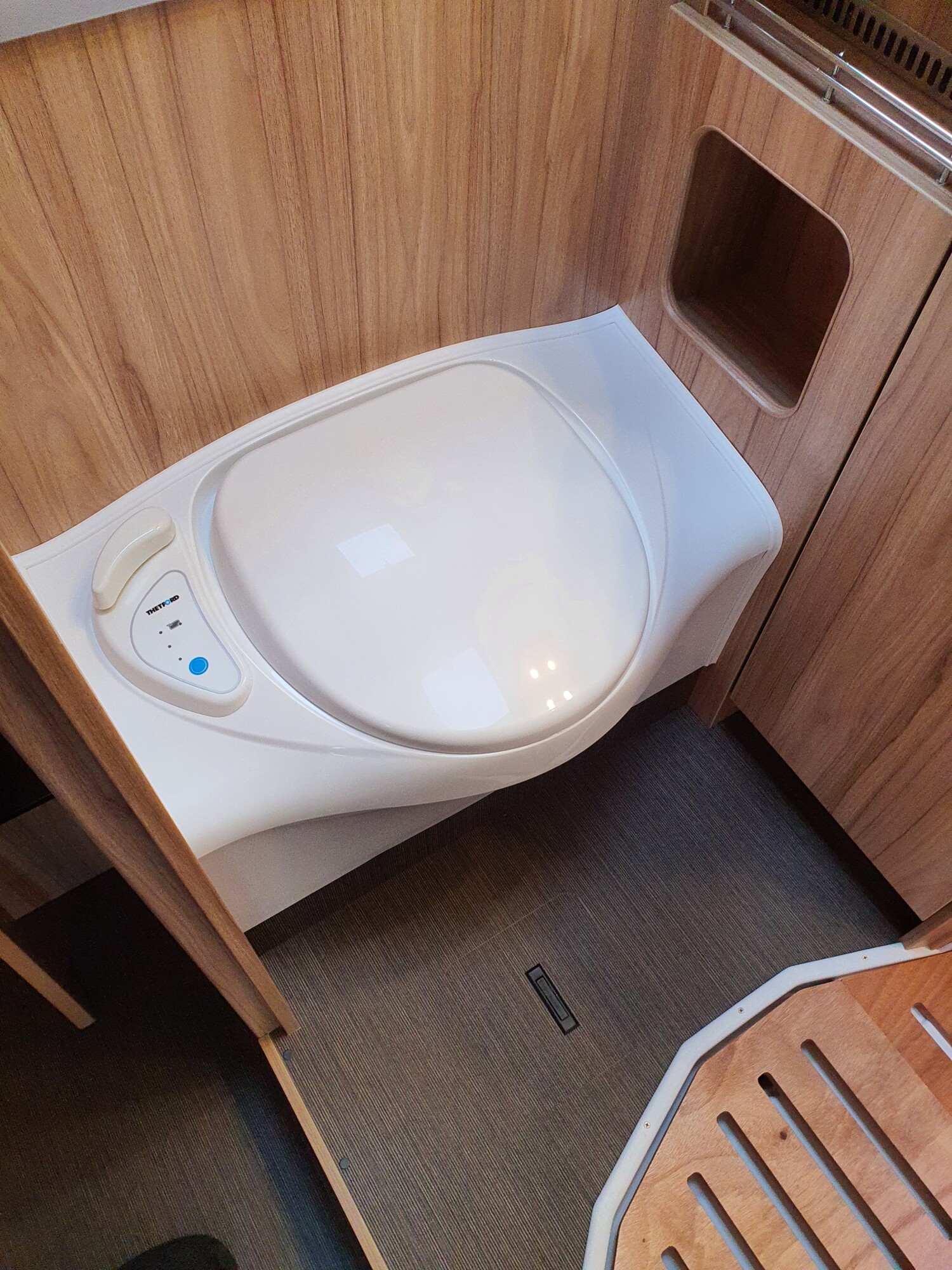 - Nasszelle mit einer Banktoilette von Thetford, einem Waschbecken, einer Duschausstattung, Spiegeln, Stauschränken und Holzrost