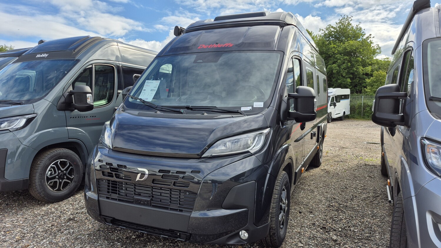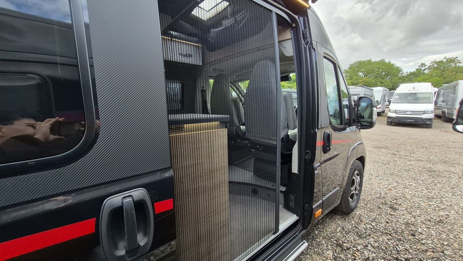 - Aufstelldach schwarz, vorne komplett zu öffnen inkl. elektrischem Schließassistenten, Fliegengitter, Schwanenhalsleuchte und USB-Steckdose, mit hochwertiger Matratze