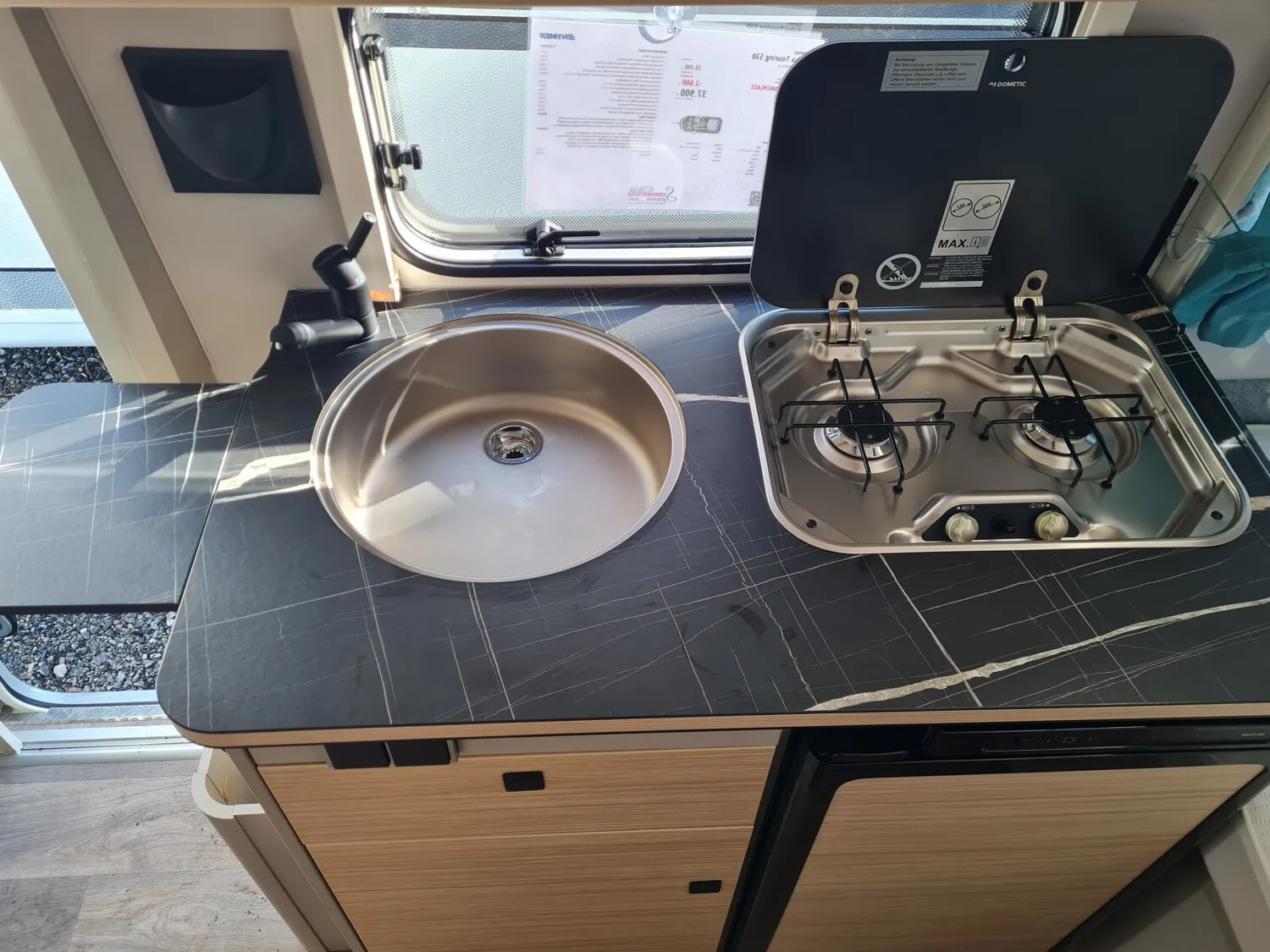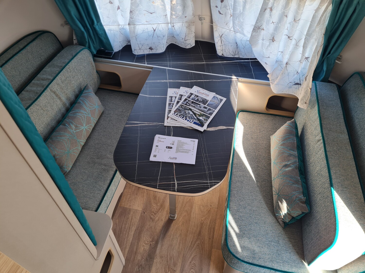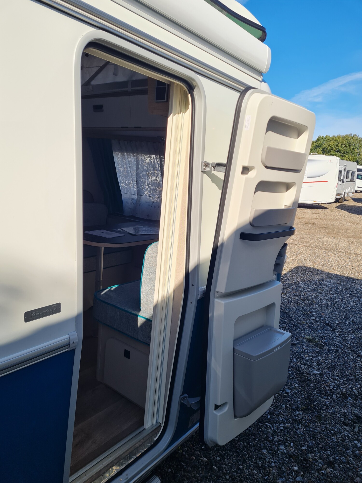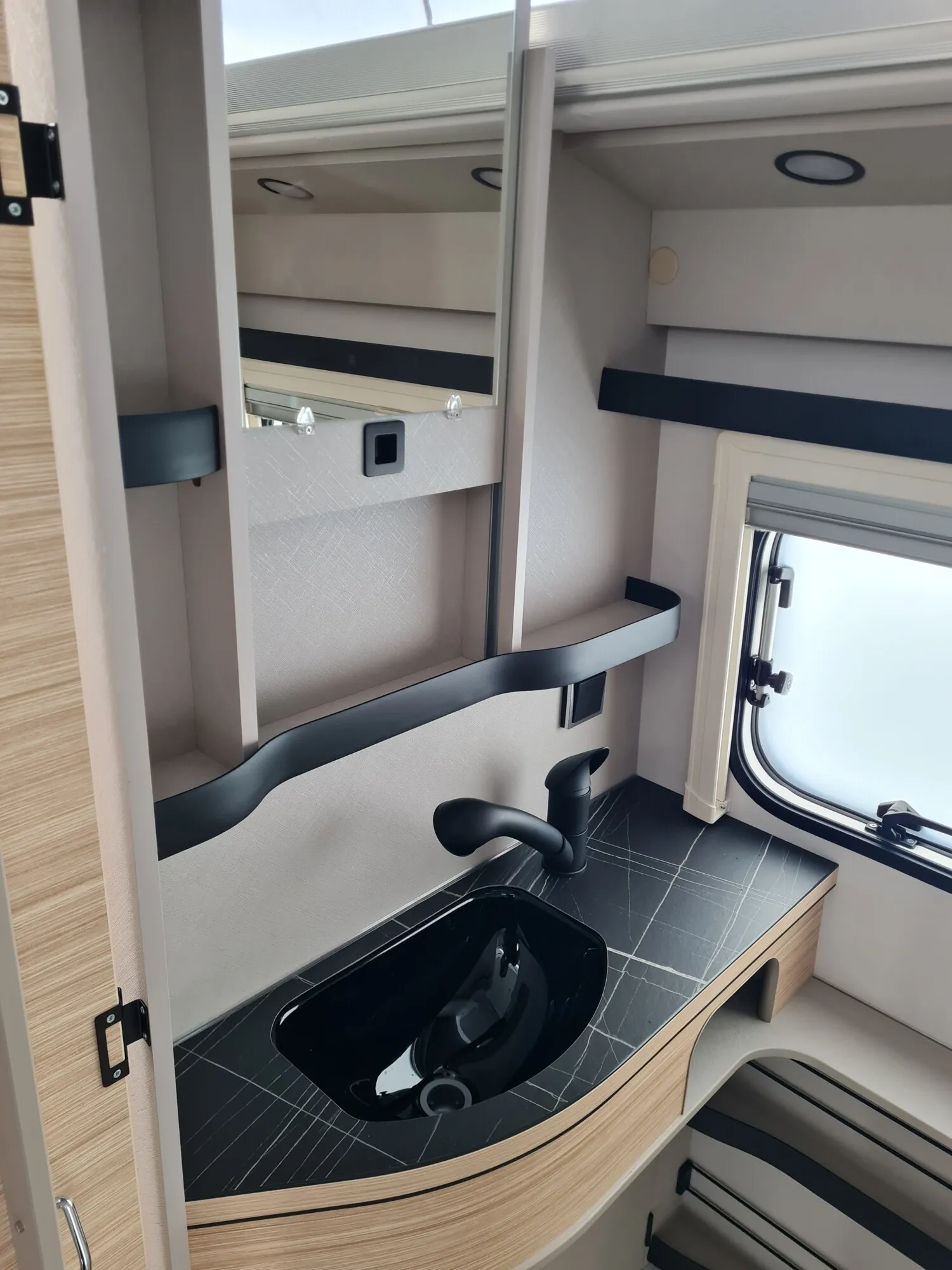- Komfort-Paket (Fliegenschutz-Rolltür (gesamte Türhöhe), bedienfreundlich durch seitliche Führung, Komfort-Plissee-Rollos, Steckdosenpaket (2 x 230 V Steckdosen und 1 x USB-Doppelsteckdose), Abfalleimer in Eingangstür integriert, Spülenabdeckung mit Schneidebrett für Edelstahlspüle, Zusätzlicher Vergrößerungsspiegel mit Magnethalterung)