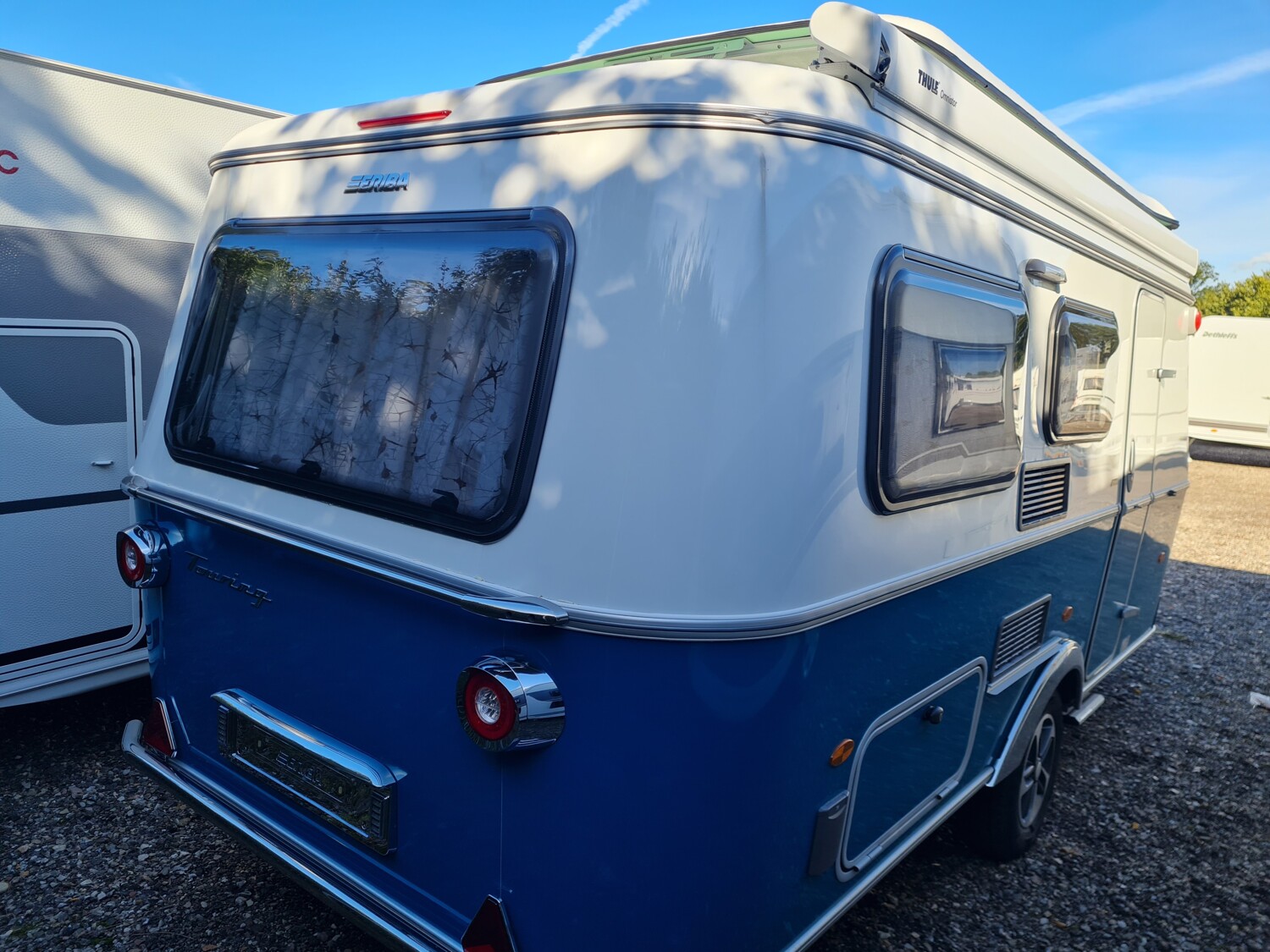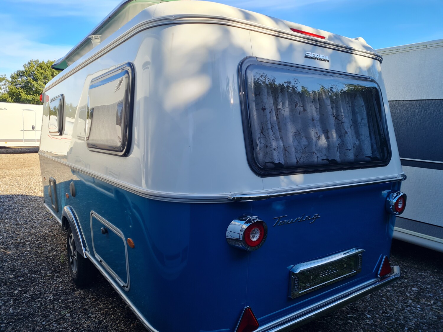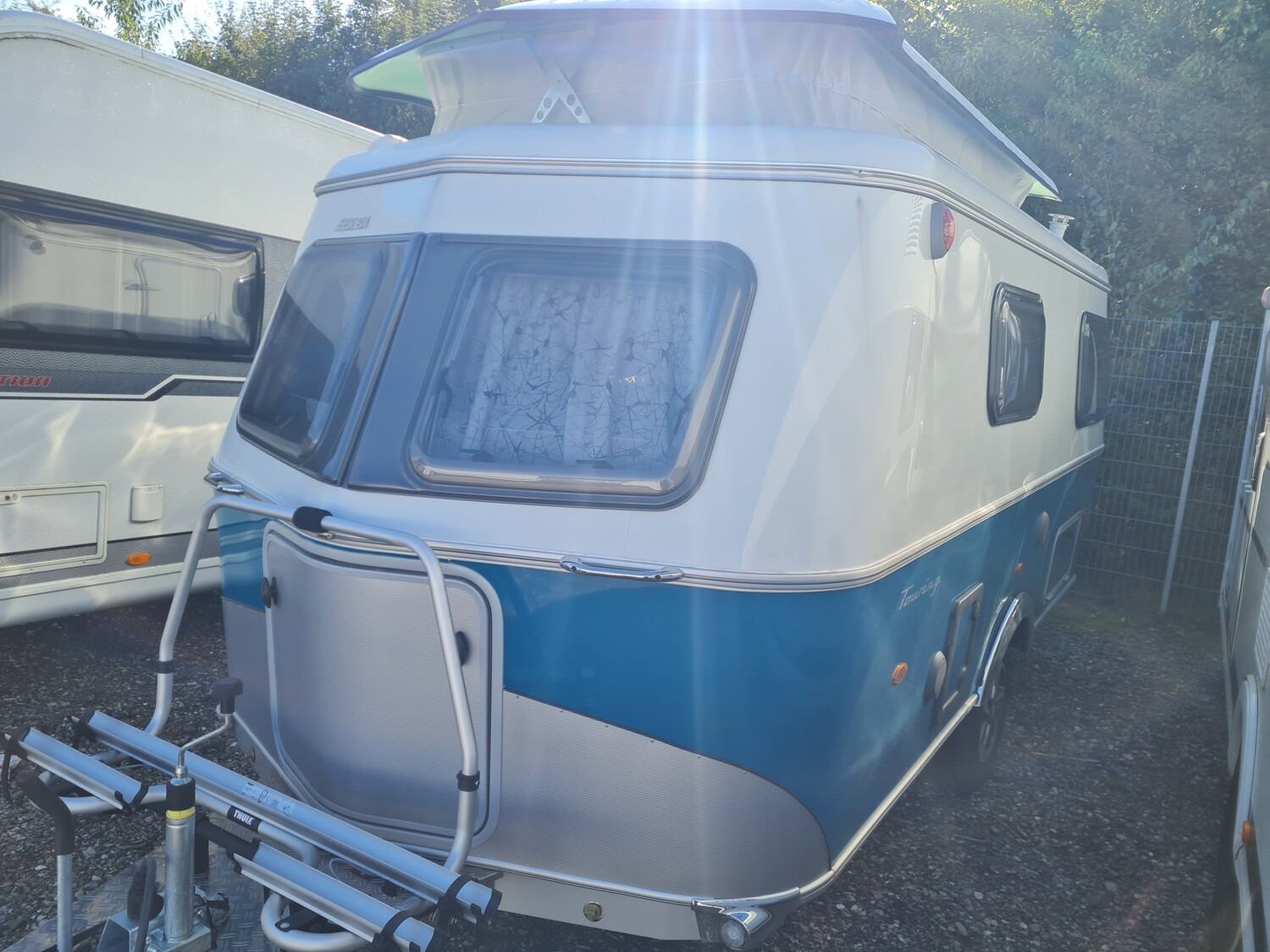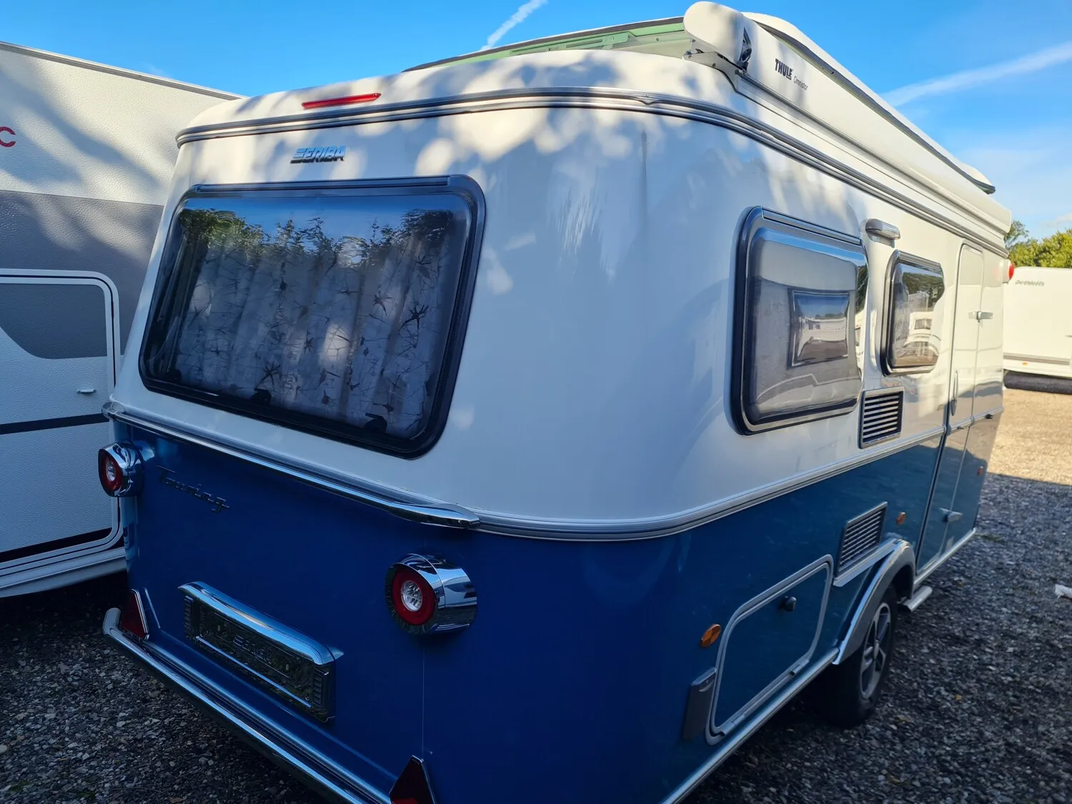 - Harbour Blue Edition (Seitenwände, Bug und Heck in Glattblech, Farbe White Harbour Blue, Stoffkombination Orlando für Ausstattungslinie Urban, Möbeldekor Tindari, Chrompaket mit Außenanbauteilen in Chrom und Radlaufblende sowie Rückleuchten in Retrodesign, Leichtmetallfelgen ERIBA 5-Stern-Doppelspeiche, anthrazit, Steinschlagschutzblech, Bumper aus Edelstahl, Ambientelicht XL mit indirektem Licht oberhalb der Dachstauschränke und zwei zusätzliche ERIBA Multifunktions-Akkuleuchten, 2 Kissen mit Bezug)