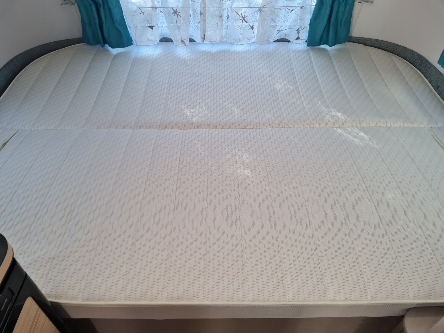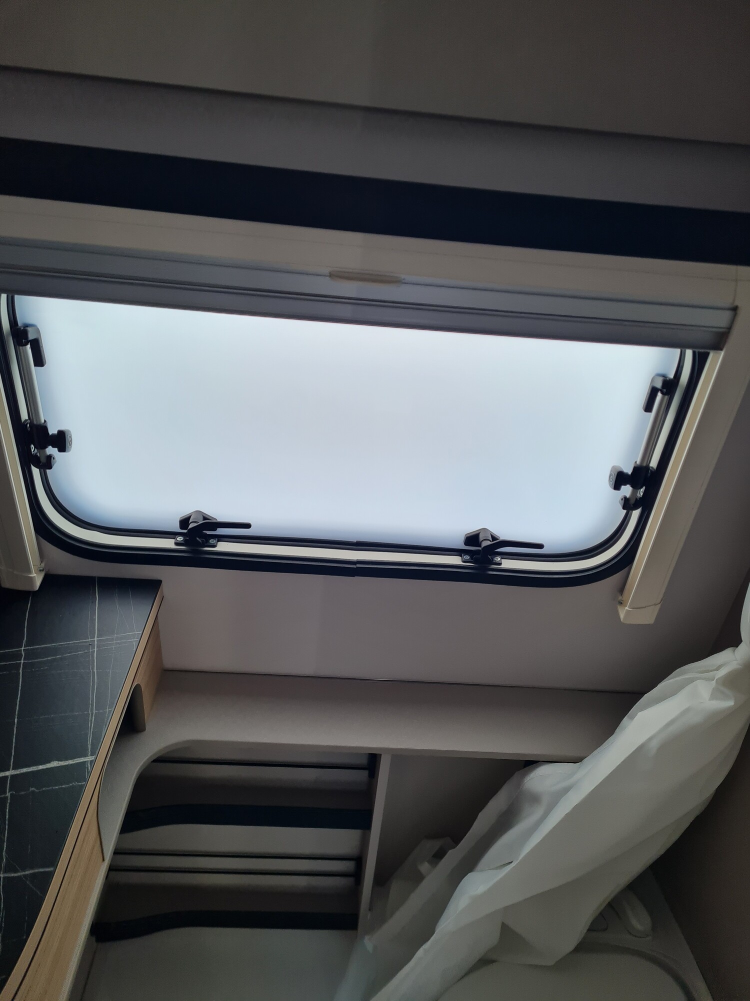 - Fenster ausstellbar mit Verdunkelungsrollo und Moskitonetz (Heck links)