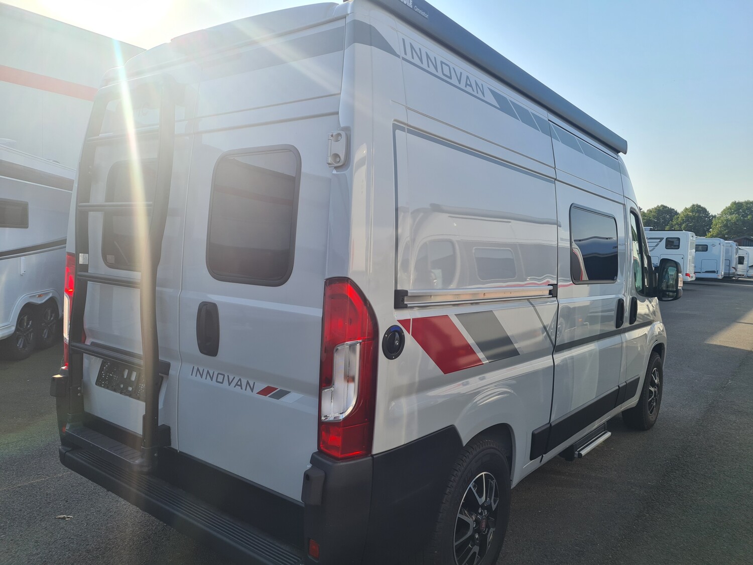 - Innovan Fiat Paket (Breite Einstiegsstufe, Aluminiumfelgen 16", Traktion Plus, Multifunktionslenkrad, Stoßfänger in Wagenfarbe, Markise, Rückfahrkamera in 3ter Bremsleuchte, Duschwanneneinlage aus Holz, Dachhaube Midi-Heki 700 x 500 mm über Sitzgruppe, Duschausstattung (Brausekopf ausziehbar, Duschvorhang, Führungsschiene, Brausehalter), Fenster im Bad, Faltrollosystem Fahrerhaus, Kleiderstange in der Nasszelle, Fliegenschutztür, Drehplatte für Tischerweiterung an der Sitzgruppe, Radiovorbereitung mit Lautsprechern und Dachantenne (DAB), Captain-Chair inkl. 2 Armlehnen, Lenkrad und Schaltknauf in Lederausführung, Armaturenbrett mit Aluminium-Applikationen, Scheinwerfer mit schwarzem Rahmen, Kühlergrill schwarz glänzend, Abwassertank isoliert, Zusatzpolster für Notbett, TV-Vorbereitung, Abwassertank elektrisch beheizt)
