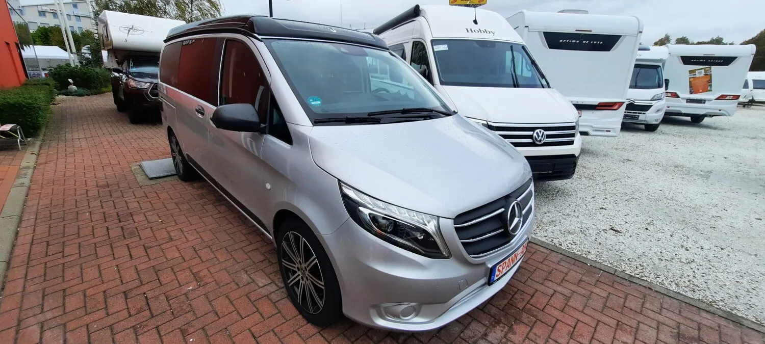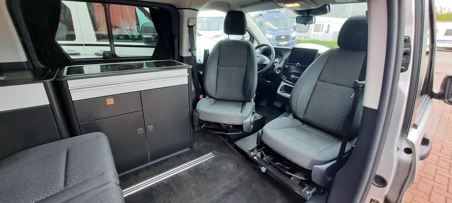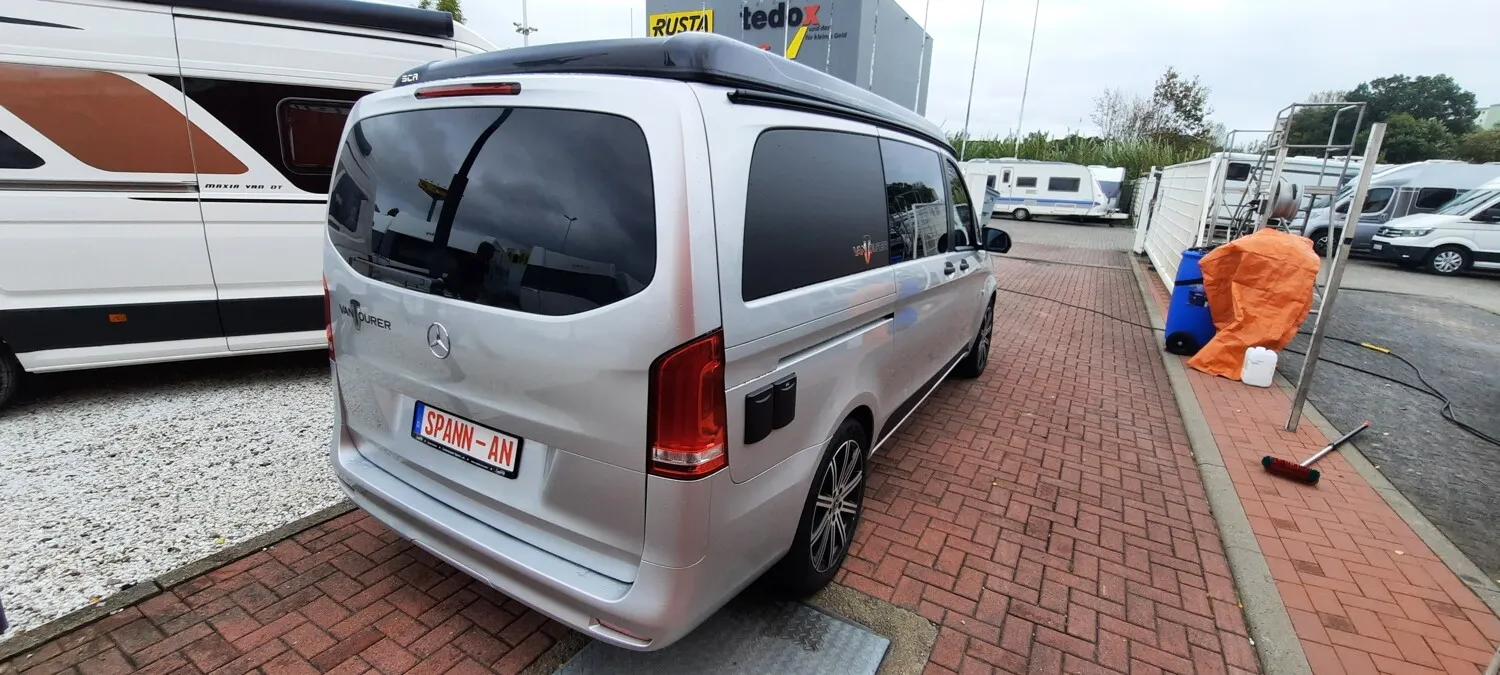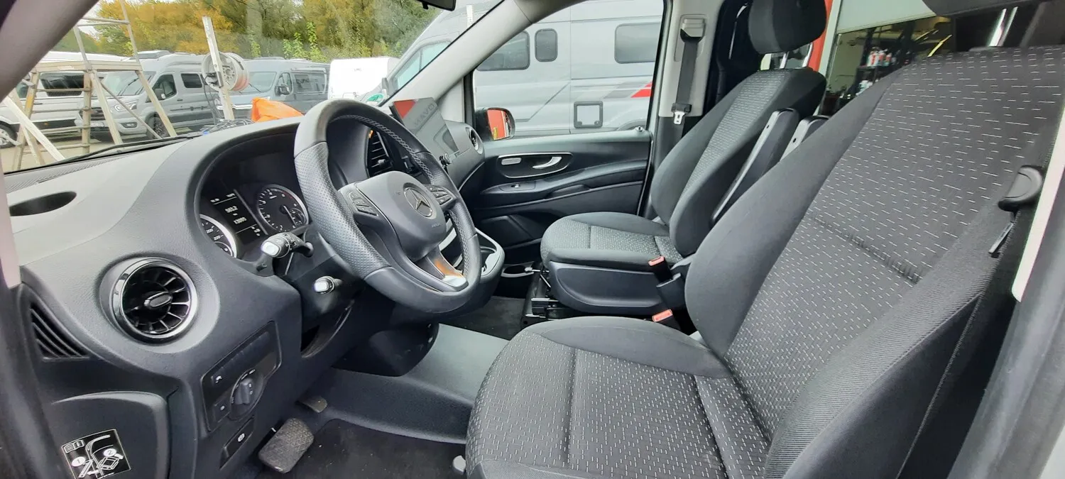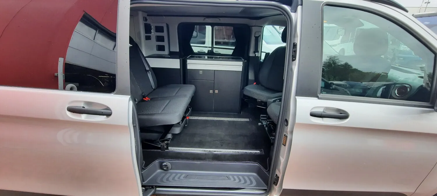 Audio-Navigationssystem Audio 40 (DAB+, Bluetooth, USB), Außenspiegel elektr. verstell-, heiz- und anklappbar, Batterie zusätzlich (verstärkt), Chrom-Paket, DAB-Tuner (Radioempfang digital), Einschaltautomatik für Fahrlicht, Fahrassistenz-Paket, Fenster im Lade-/FG-Raum: - schiebbar, vorn links, Generator 250 A, Getränkehalter vorn (doppelt), Intelligent Light System LED, Kraftstofftank: vergrößert, Kühlergrill verchromt, LM-Felgen 8x19 (10-Speichen, schwarz, glanzgedreht), Metallic-Lackierung, Rückfahrkamera, Scheibenwischer mit Regensensor, Schiebetür Lade-/Fahrgastraum links, Sitzausstattung Schnellverriegelung für Sitzschienen-System, Sitzheizung vorn, Komfortsitze vorn drehbar mit Armlehen, Tempomat mit Abstandsregelung / Distronic Plus, Trennrelais bei Batterie zusätzlich, Verglasung hinten abgedunkelt / Schwarzglas, Wärmeschutzverglasung, Zweiwege Lautsprecher vorn