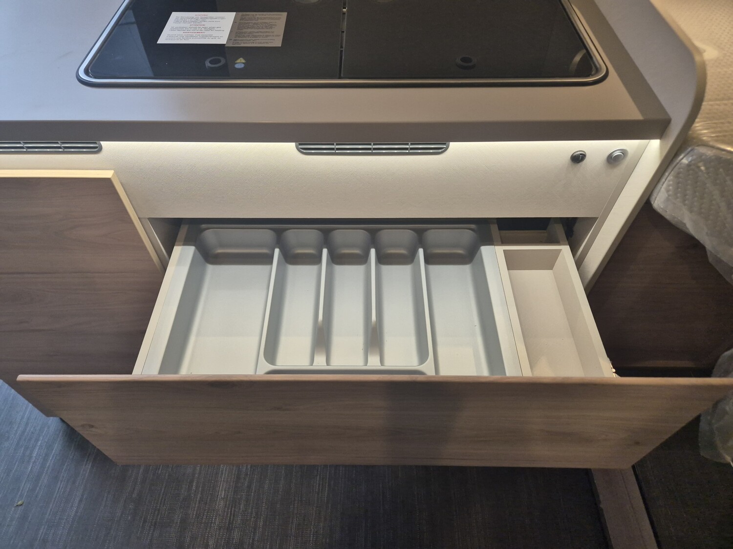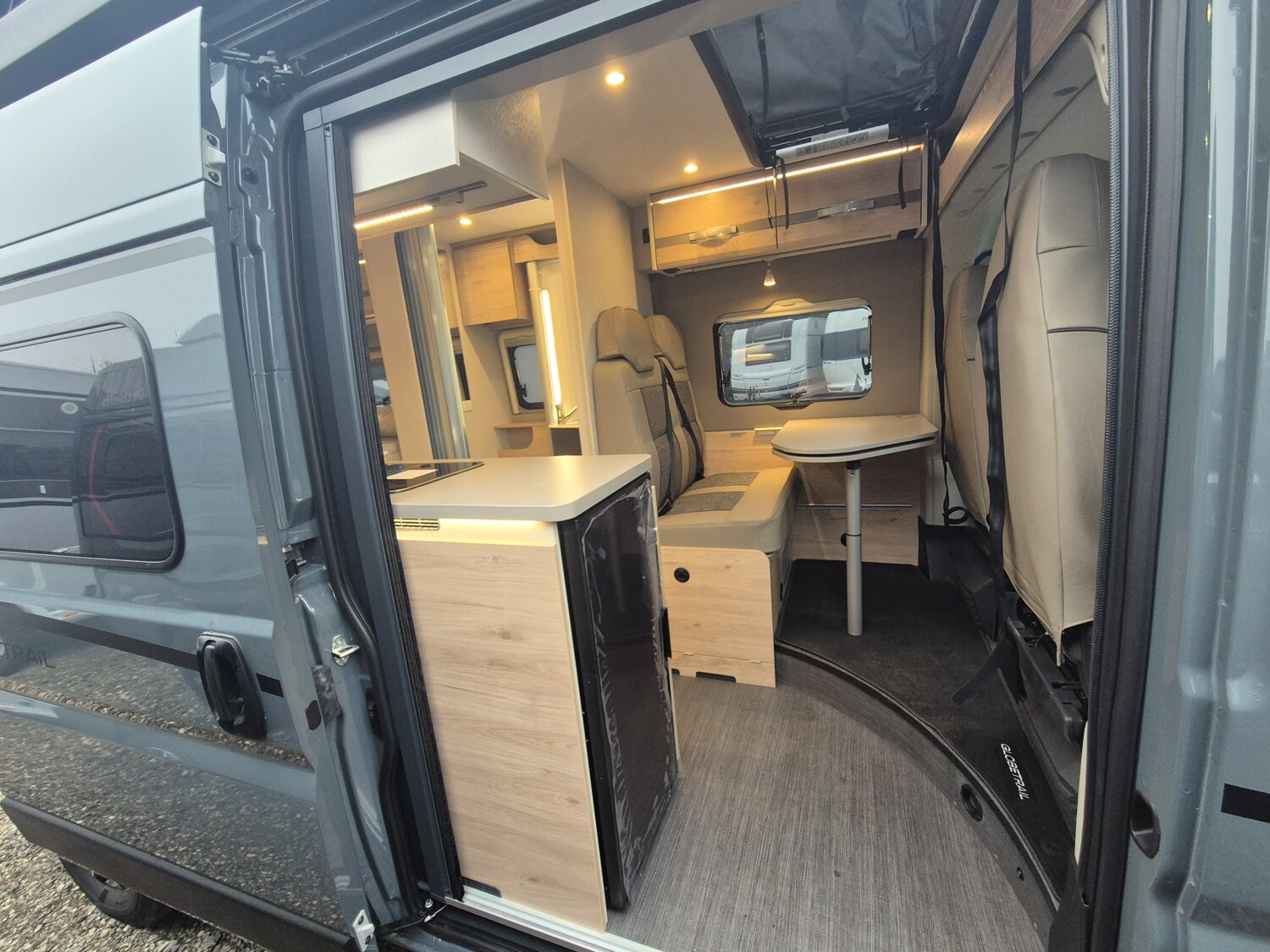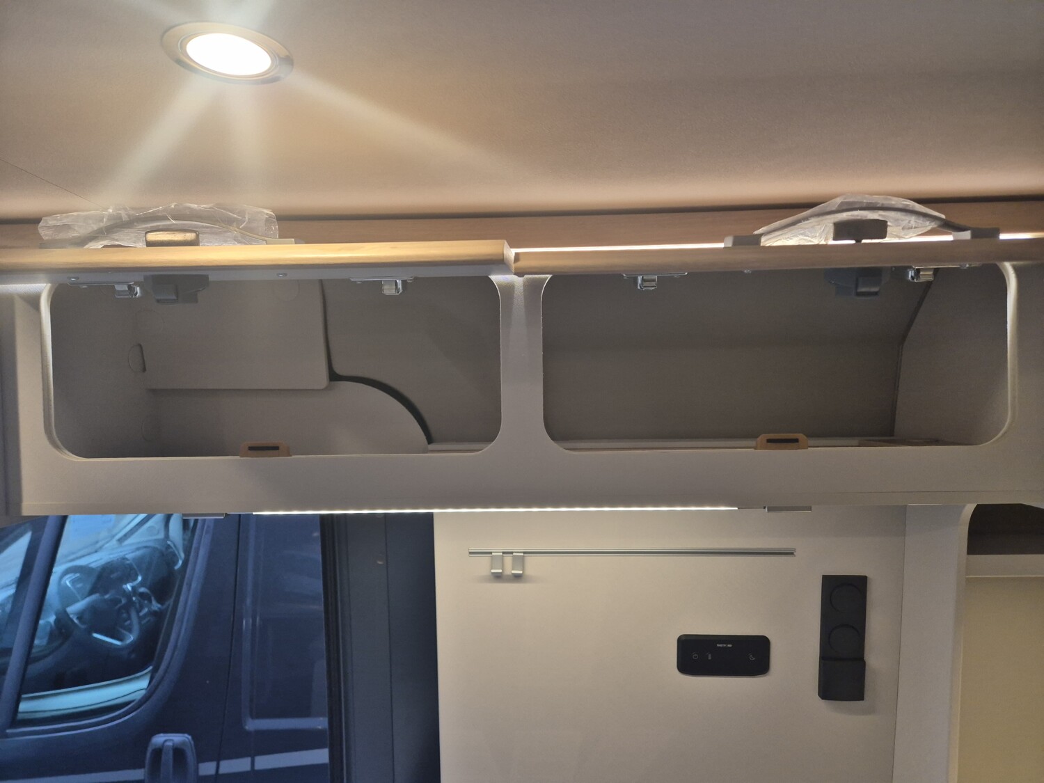 - Elektro Paket (Zusätzliche Doppel-USB-Steckdose im Bug links, 12-V-Steckdose im Heckbereich links unten, 230-V-Steckdose im Oberschrank Bug links (Sitzgruppe), Indirekte Beleuchtung, LED-Lichtröhre in der Küche, Vorbereitung Solarmodule)