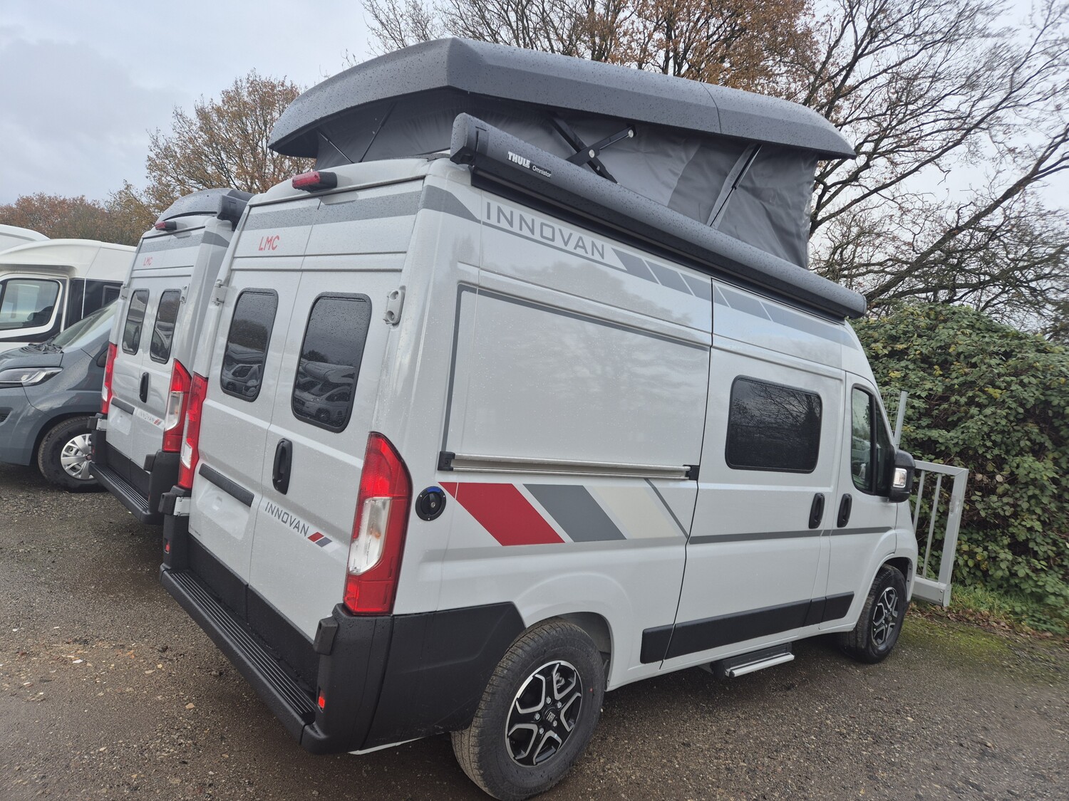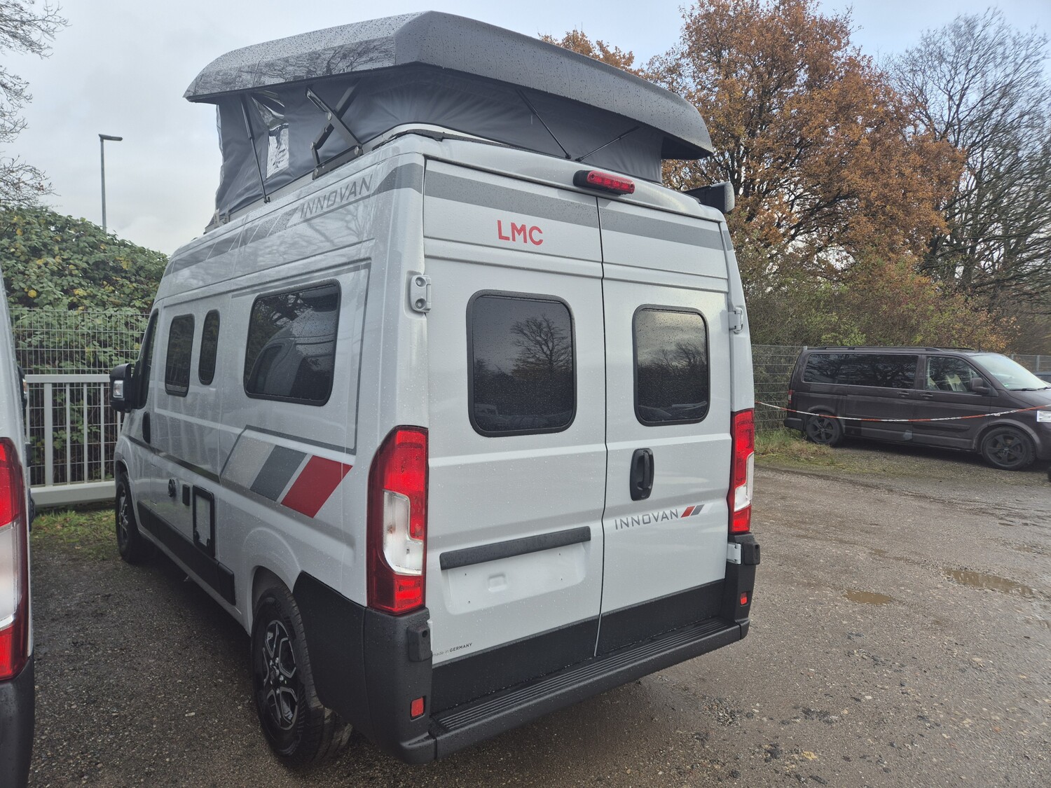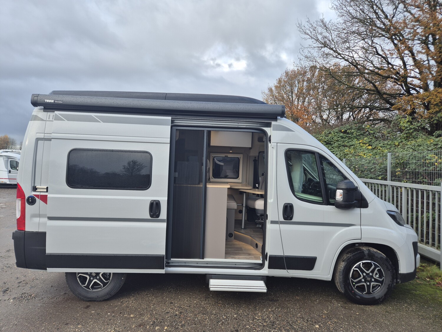 - Innovan Fiat Paket (Breite Einstiegsstufe (Elektrisch), Markise Anthrazit, Rückfahrkamera in 3ter Bremsleuchte, Duschwanneneinlage aus Holz, Dachhaube Klarglas 700x5000mm inkl. Verdunklungsrollo und Insektenschutz über der Sitzgruppe, Duschausstattung (Brausekopf ausziehbar, Duschvorhang, Führungsschiene, Brausehalter, Duschwanne), Fahrerhausverdunklung (Plissees), Insektenschutztür, Drehplatte für Tischerweiterung, TV-Vorbereitung, Mittelsitzgruppe umbaubar zum Bett mit Zusatzpolster, Klappbare Wäschestange im Toilettenraum/Dusche, Abwassertank isoliert und manuell elektrisch beheizt, Ausstellfenster Bad (Milchglas) inkl. Verdunklungsrollo und Insektenschutz)