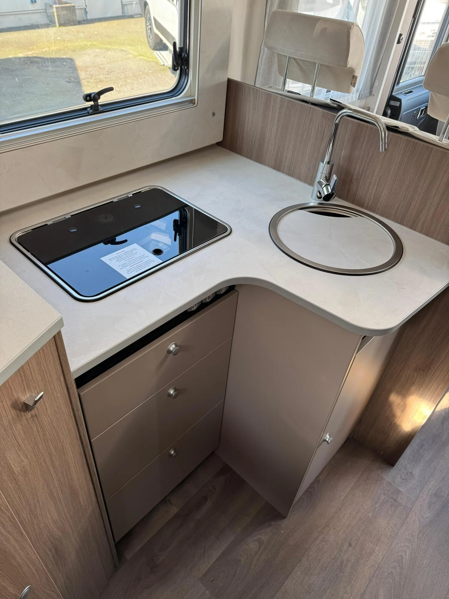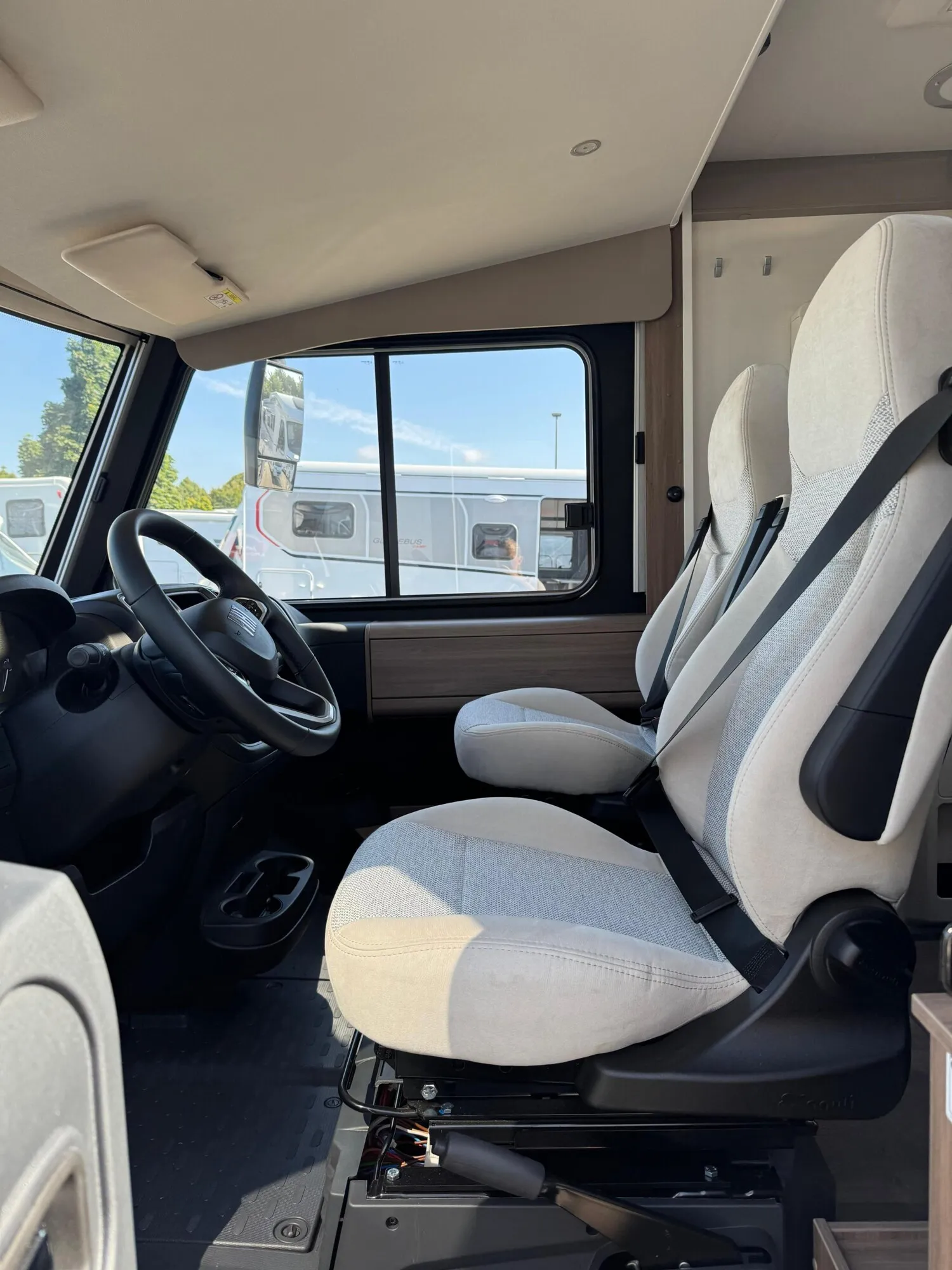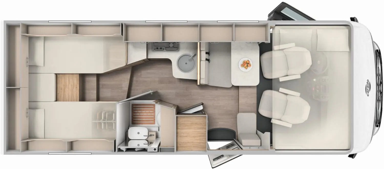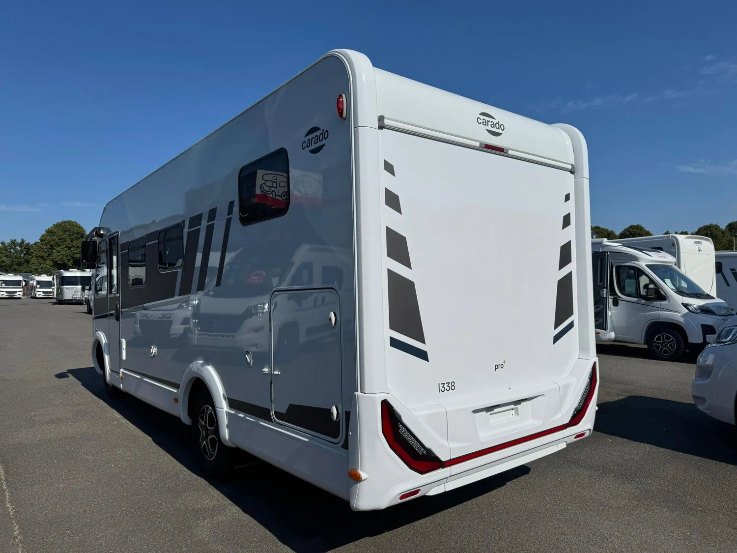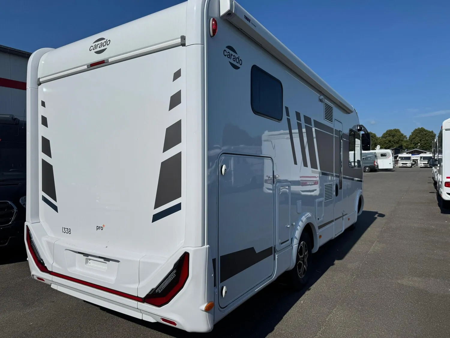 - Carado 2025 Ausstattungshighlights des pro+ Paket I338 (Fiat Ducato // Optik Paket 2: Lenkrad & Schaltknauf in Lederausführung, Armaturentafel mit Applikationen (Techno-Trim), 16" Alufelgen Bi-Color // Basic Paket: Panoramadachhaube 70 x 50 cm, Klarglasdachhaube 40 x 40 cm, Fliegengittertür (einteilig), Komfort-Eingangstür mit Fenster und Verdunkelung, Bridge Light // Großer Kühlschrank 156 l mit separatem Frosterfach 29 l // Abwassertank isoliert // Rahmenfenster // Markise 4,5 m // TV Paket (22" Smart-TV & Halter, Satantenne Flatsat Classic 65) // Design Applikation Heck // Zweite Außenstauraumklappe (Größe modellabhängig) // Beklebung pro+)