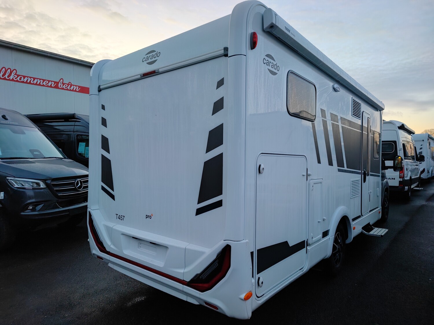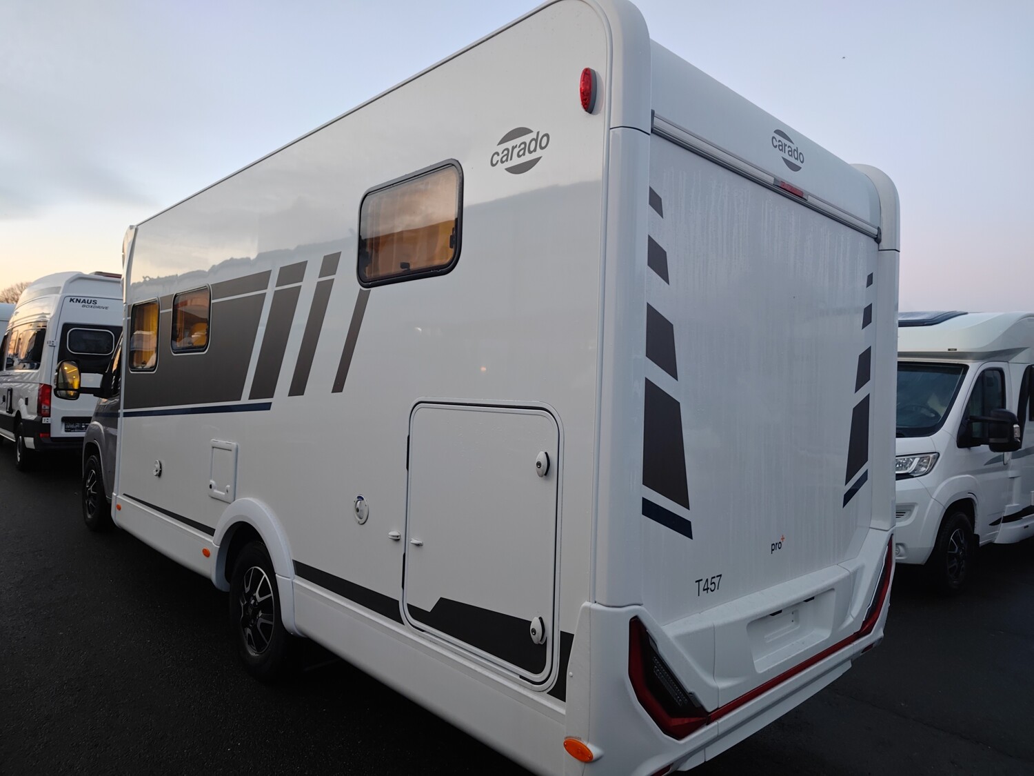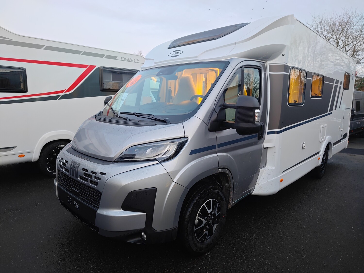 - Carado 2025 Ausstattungshighlights des pro+ Paket T447 & T448 & T457 (Fiat Ducato 3.500 kg - 2.2 Multijet - 103 kW / 140 PS Euro 6 - 6-Gang-Schaltgetriebe // Optik Paket 1: Stoßfänger lackiert, Skid-plate glänzend Schwarz, Nebelscheinwerfer // Optik Paket 2: Lenkrad & Schaltknauf in Lederausführung, Armaturentafel mit Applikationen (Techno-Trim), 16" Alufelgen Bi-Color // Chassisfarbe Artense Grau Metallic // Basic Paket: Panoramadachhaube 70 x 50 cm, Klarglasdachhaube 40 x 40 cm, Fliegengittertür (einteilig), Komfort-Eingangstür mit Fenster und Verdunkelung, Bridge Light // Faltverdunkelung Fahrerhaus // Fenster in Fronthaube // Großer Kühlschrank 156 l mit separatem Frosterfach 29 l // Abwassertank isoliert // Markise 4,5 m // TV Paket (22" Smart-TV & Halter, Satantenne Flatsat Classic 65) // Rahmenfenster // Design Applikation Heck // Zweite Außenstauraumklappe (Größe modellabhängig) // Beklebung pro+)