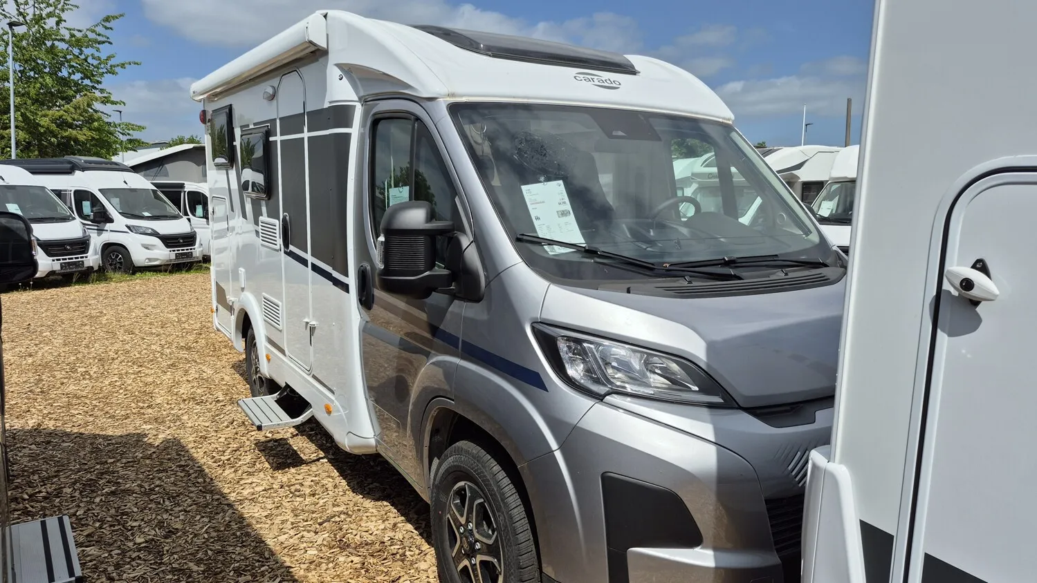 - Carado 2025 Ausstattungshighlights des pro+ Paket V132 (Citroën Jumper 3.500 kg - 2.2 Multijet - 103 kW / 140 PS Euro 6 // Chassisfarbe Artense Grau Metallic // Optik Paket 1: Stoßfänger lackiert, Skid-plate glänzend Schwarz, Nebelscheinwerfer // Optik Paket 2: Lenkrad & Schaltknauf in Lederausführung, Armaturentafel mit Applikationen (Techno-Trim), 16" Alufelgen Bi-Color // Basic Paket: Panoramadachhaube 70 x 50 cm, Klarglasdachhaube 40 x 40 cm, Spiegel mit Garderobenhaken, Bridge Light, Fliegengittertür (einteilig) // Faltverdunkelung Fahrerhaus // Fenster in Fronthaube // Sonderfarbe Dachstauschrankklappen und Türen in Cosy White // Beklebung pro+ // Markise 3,5 m // TV Paket (22" Smart-TV & Halter, Satantenne Flatsat Classic 65) // Abwassertank isoliert // Zweite Außenstauraumklappe (Größe modellabhängig) )