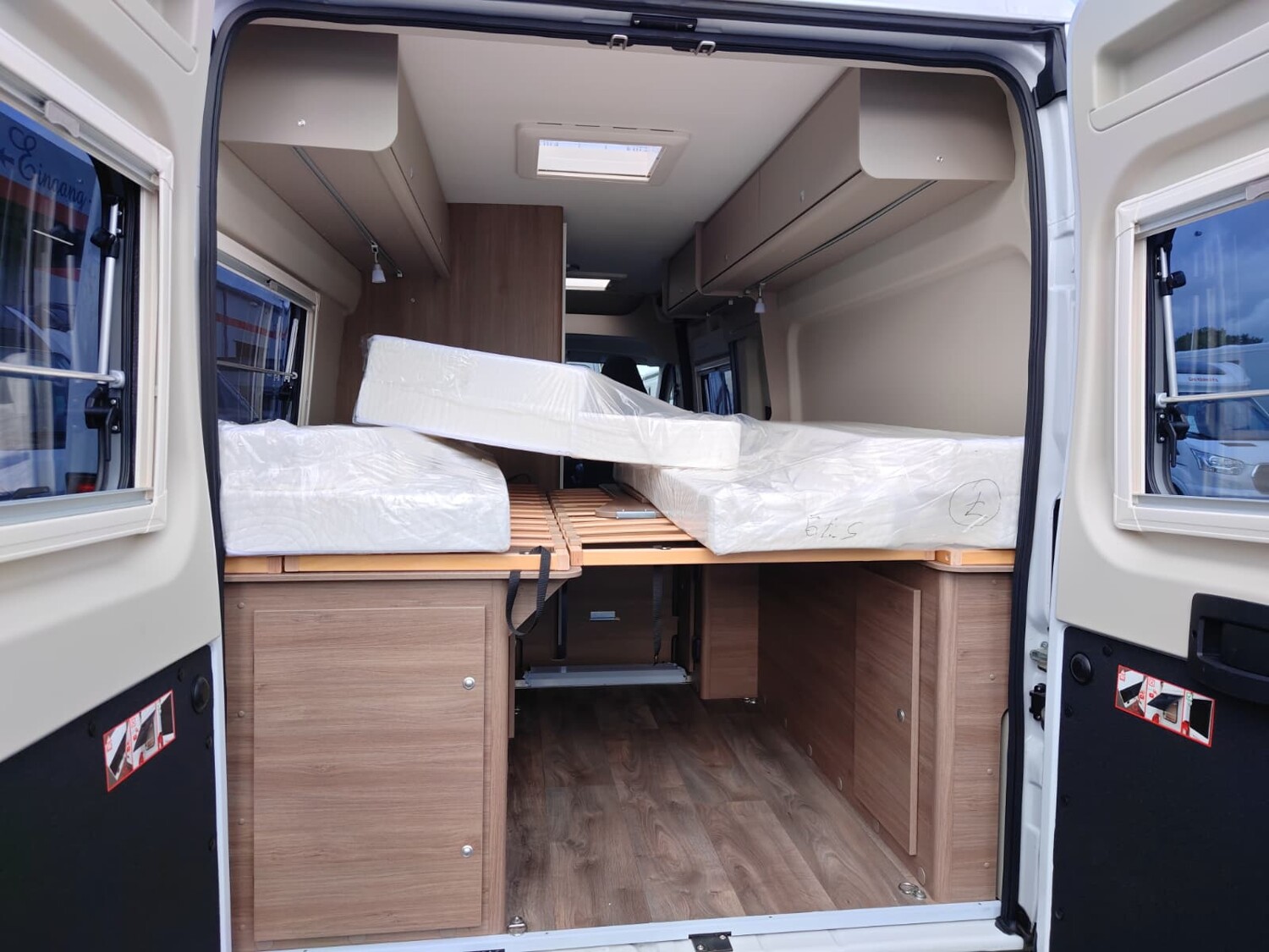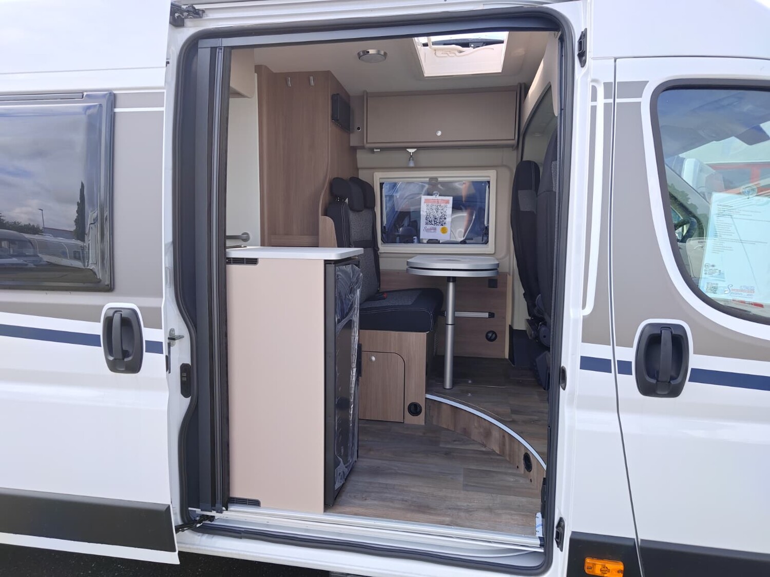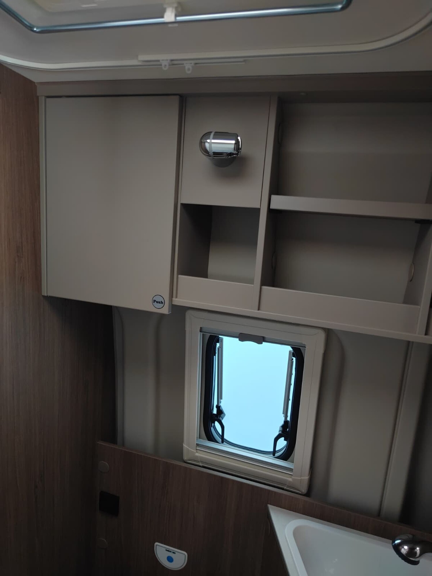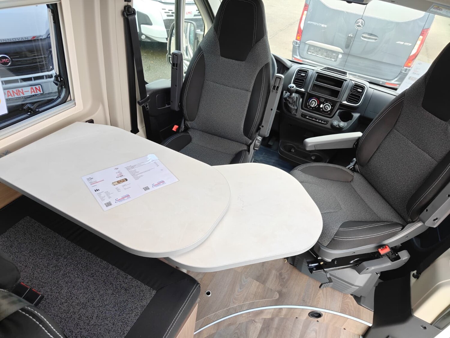 - Basic Paket (Dachhaube Midi Heki 70 x 50 cm über Sitzgruppe, Duschausstattung, Fenster im Bad, Kleiderstange in der Nasszelle, Breite Einstiegsstufe, Drehplatte für Tischerweiterung an der Sitzgruppe)