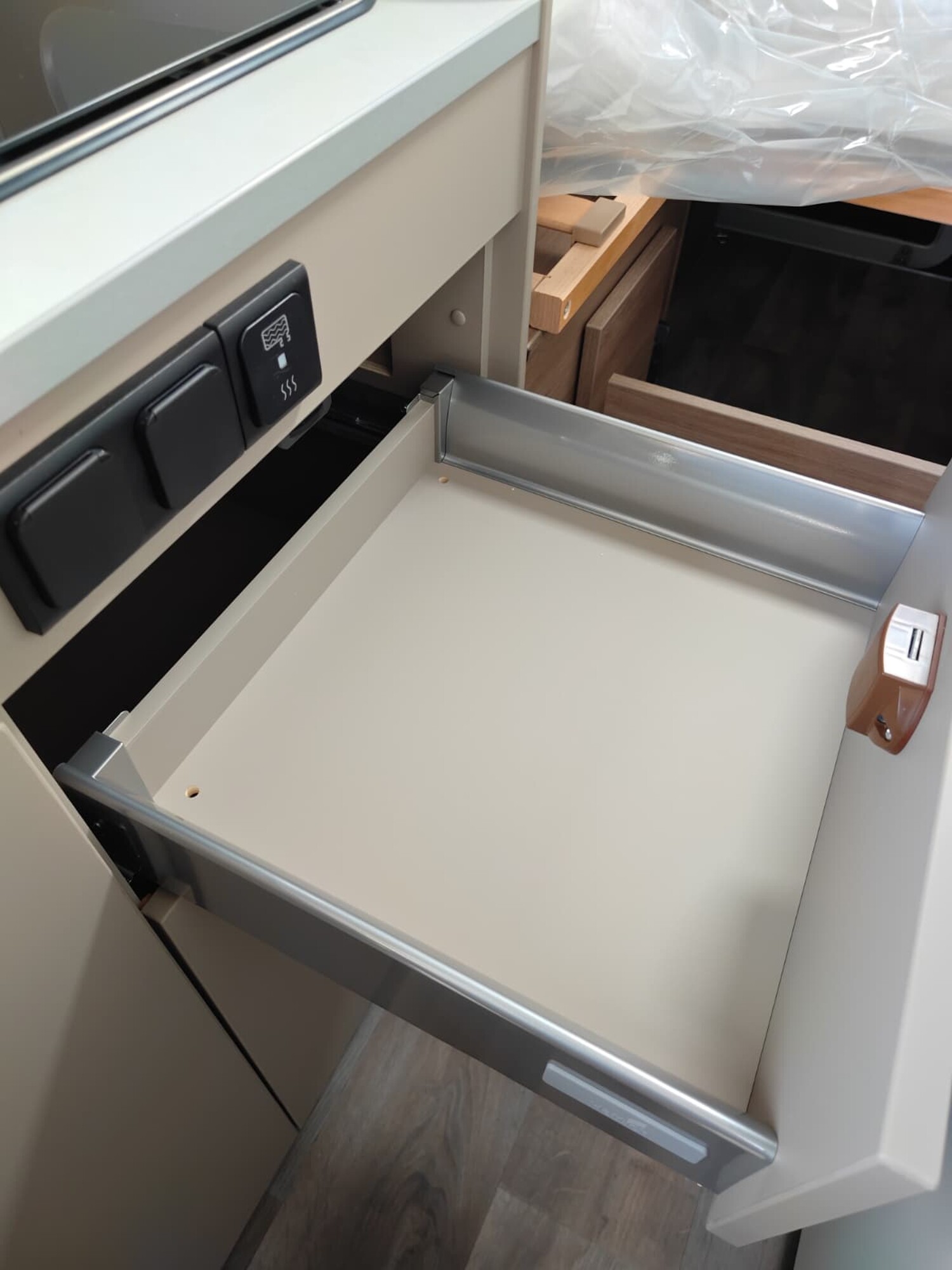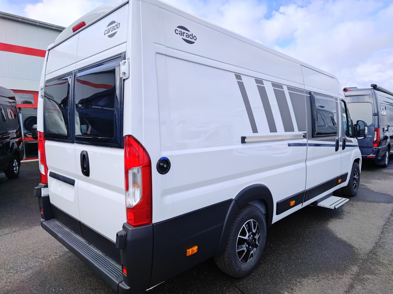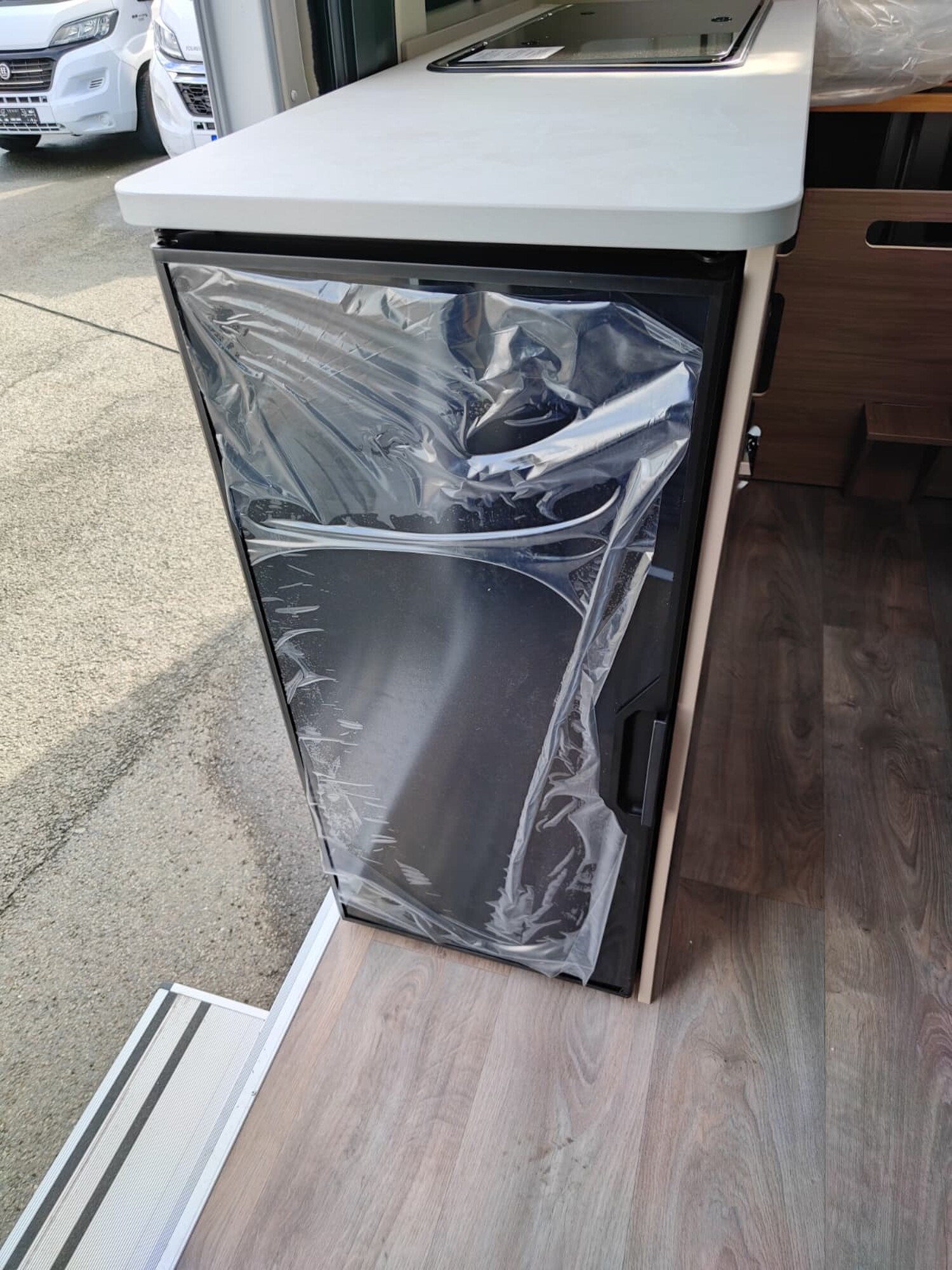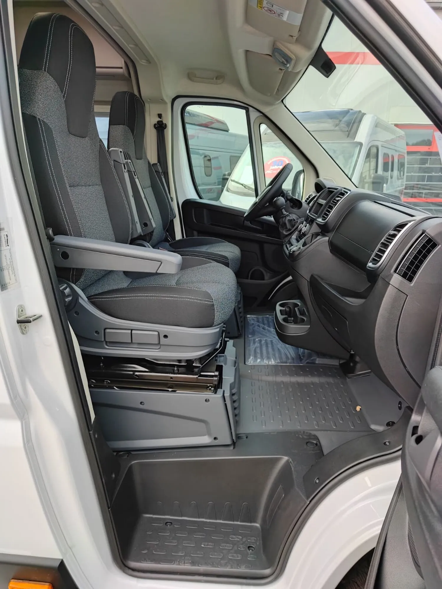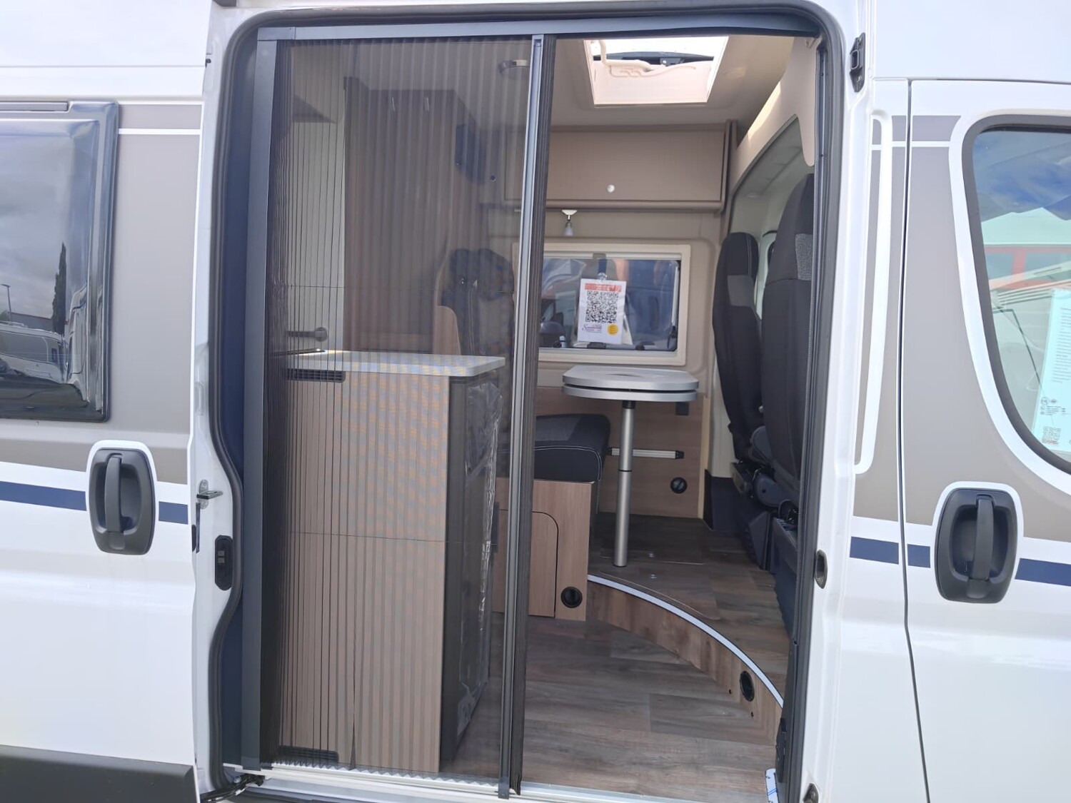 - Basic Paket (Dachhaube Midi Heki 70 x 50 cm über Sitzgruppe, Duschausstattung, Fenster im Bad, Kleiderstange in der Nasszelle, Breite Einstiegsstufe, Drehplatte für Tischerweiterung an der Sitzgruppe)