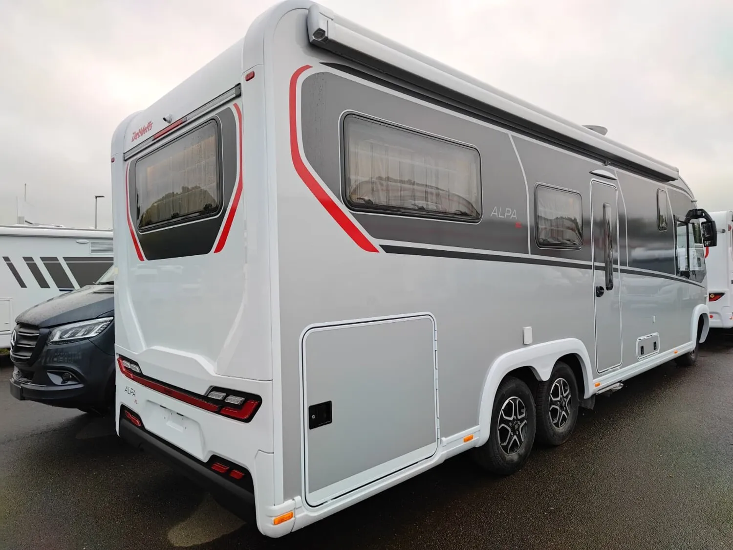 - GT Paket Silber ALPA I (Außendesign GT (Heckleuchtenträger mit schwarzem Diffusor, Kühlergrill mit Chromkeder, Skidplate "rot"), LED-Abblendlicht, Seitenwände in Titansilber Metallic, Hoher charakteristischer Dethleffs Exklusiv Heckleuchtenträger mit ShapeLine LED Rückleuchten und 3. Bremsleuchte)