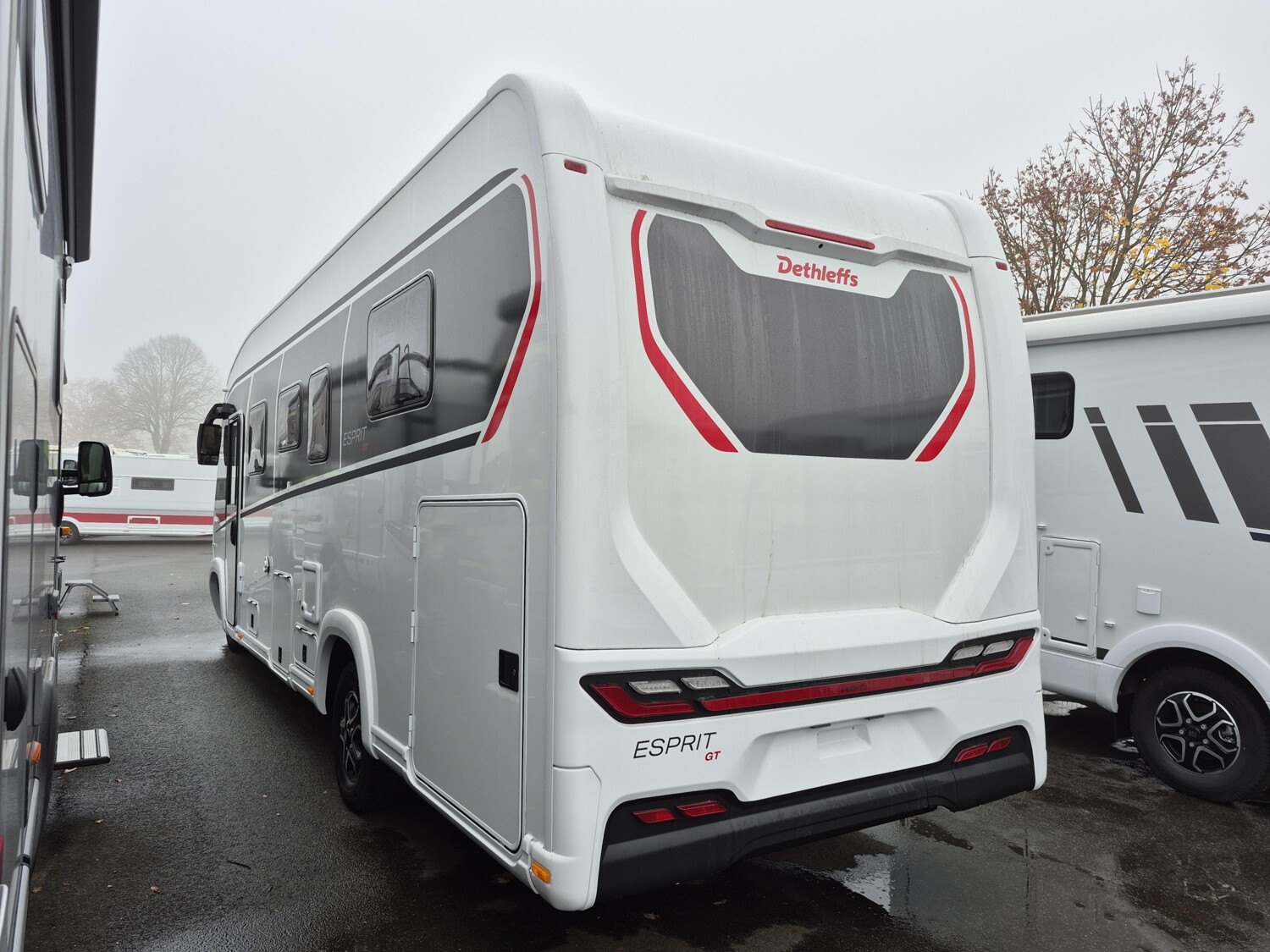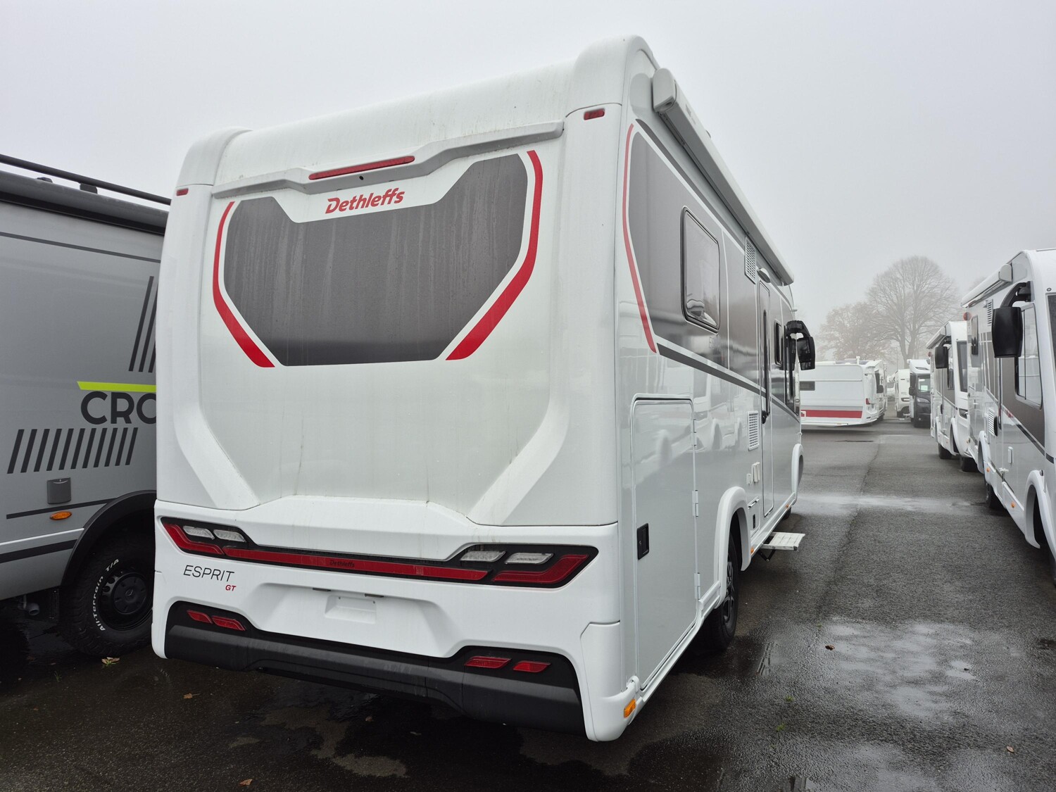 - Esprit GT Paket (LED-Abblendlicht, Sonnenblenden seitlich, als Rollo für Fahrer und Beifahrer, Panorama-Dachhaube 70 x 50 cm im Schlafraum, Innendesign GT inkl. erweiterter Küchenrückwand, Außendesign GT Advance (Heckleuchtenträger mit schwarzem Diffusor, lackierung I-Front teilweise schwarz, Kühlergrill mit Chromkeder, Skidplate "rot"), Hoher charakteristischer Dethleffs Exklusiv Heckleuchtenträger mit ShapeLine LED Rückleuchten, in Heckspoiler integrierter 3. Bremsleuchte und eingezogener Heckwand)