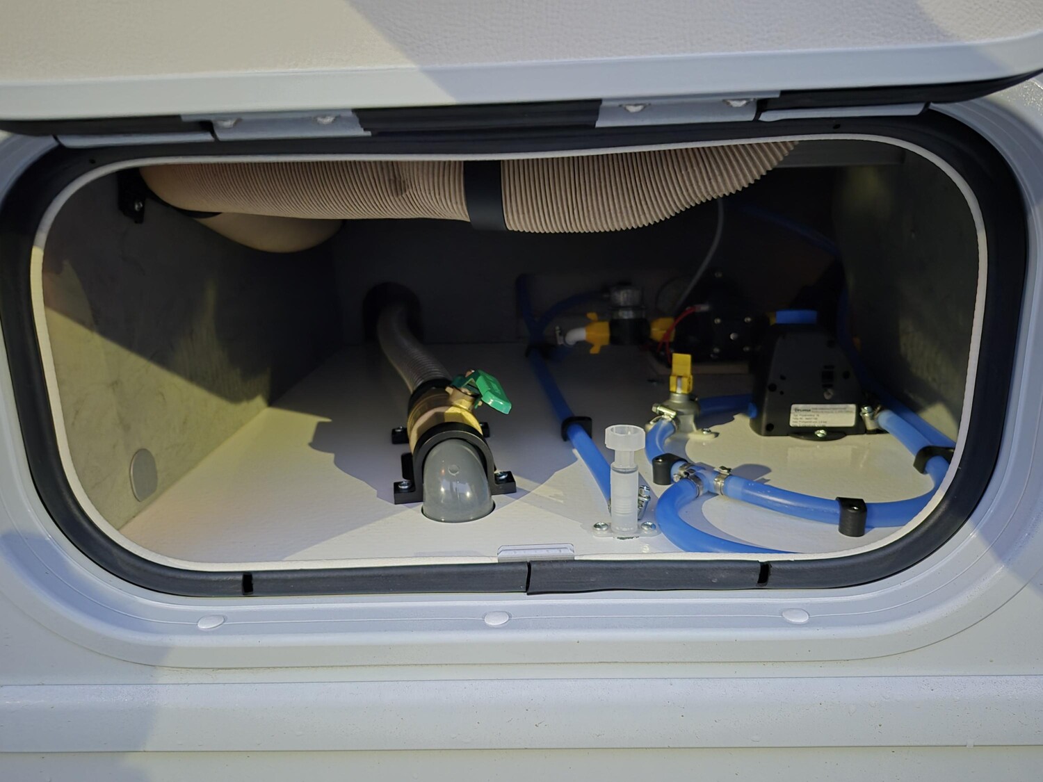 - Außendusche in Heckgarage installiert (Warm-/ Kaltwasser)