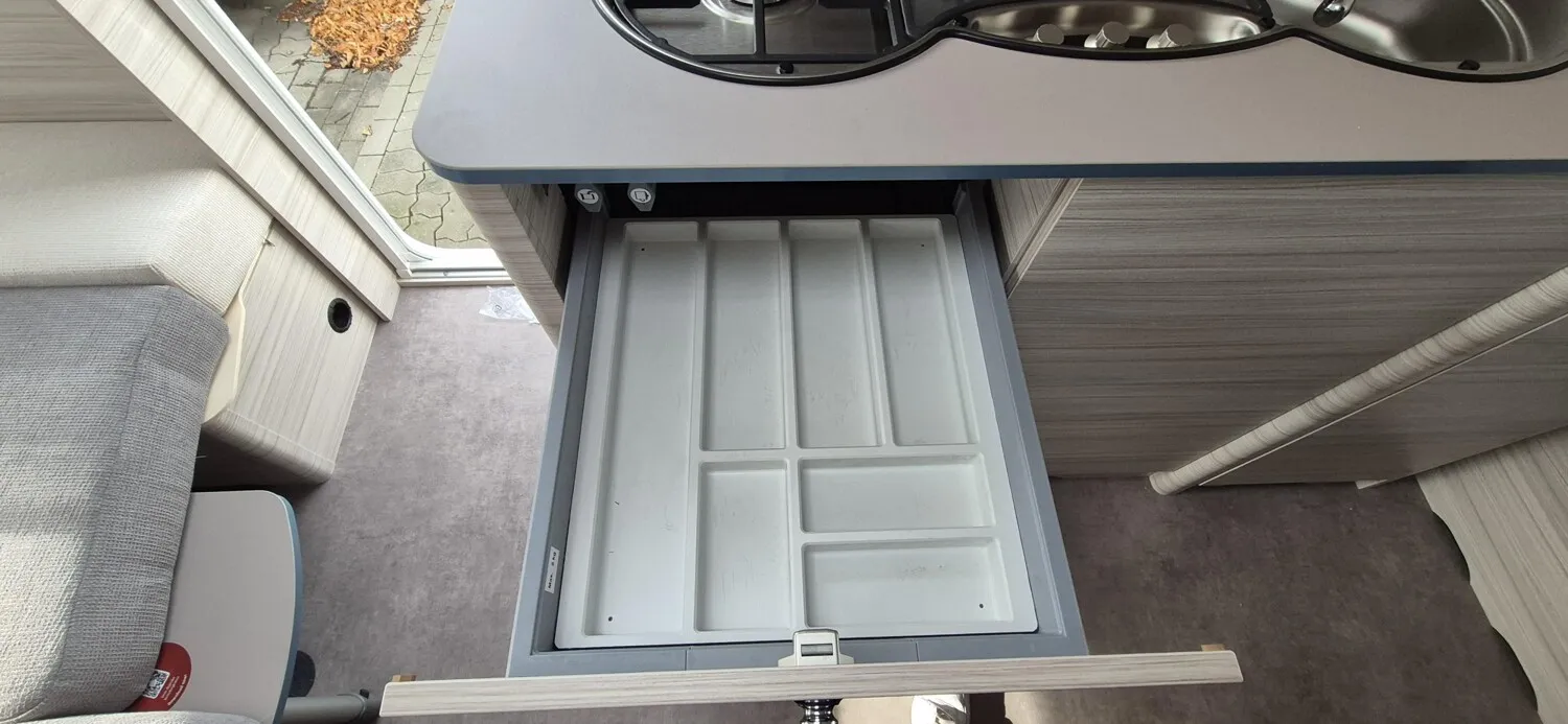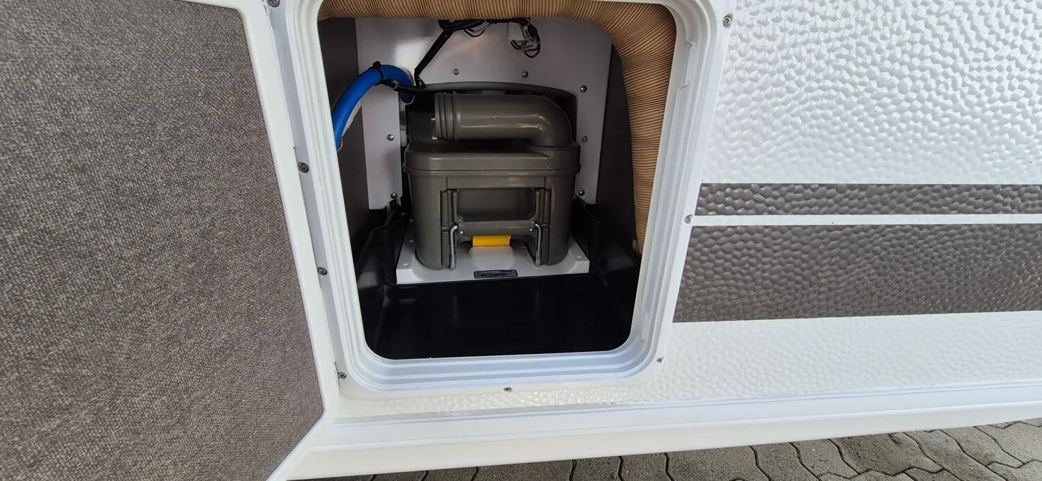 - Dynamik-Paket (Sicherheitskupplung, Stoßdämpfer, Großer 44 l Frischwassertank, Mobiler 22 l Abwassertank, Reserveradhalterung im Gasflaschenkasten, Stauraumklappe vorne rechts 750x300 mm)
