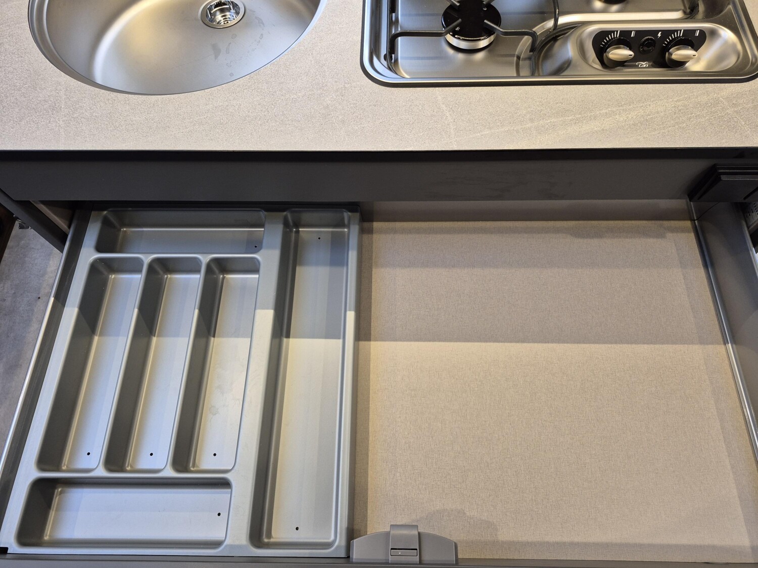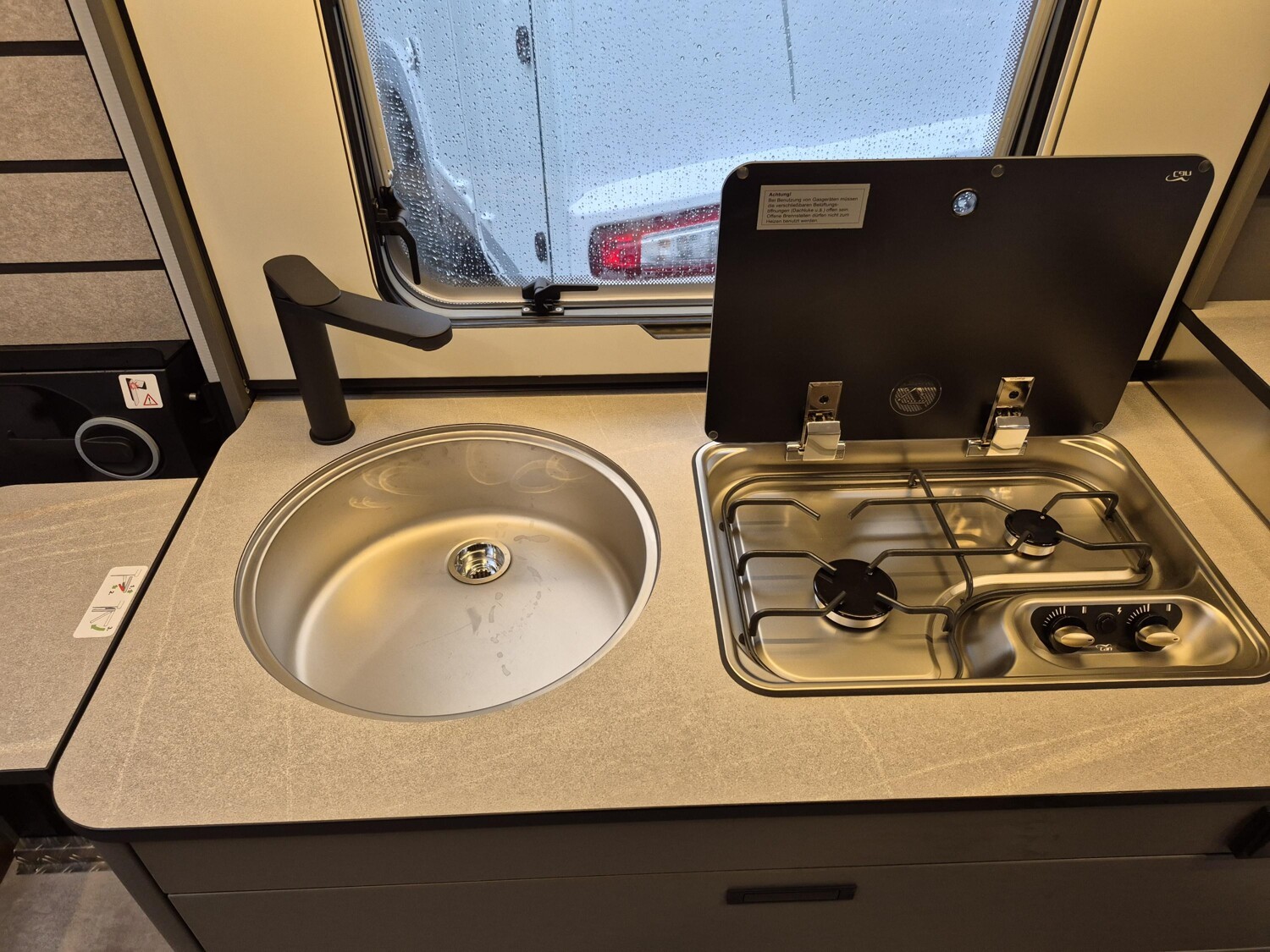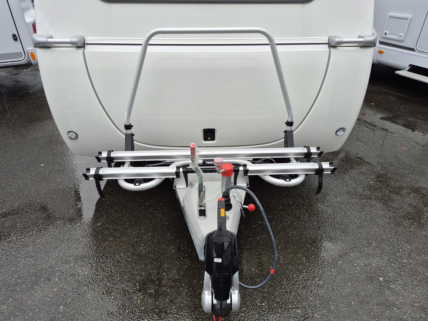 - Moving-Paket (Abstützfuß (4 Stk.) für Caravanstützen: Verhindert Einsinken oder Wegrutschen der Stützen, Deichsel-Fahrradträger Thule Caravan Superb Short für zwei Fahrräder, max. Traglast 60 kg (für E-Bikes geeignet), Fliegenschutz-Rolltür (gesamte Türhöhe), bedienfreundlich durch seitliche Führung, 22 l Abwassertank, rollbar (Unterbringung im Gaskasten), Steckdosenpaket (2 x 230 V Steckdosen in Wohnraum und Küche) und 1x USB-Doppelsteckdose (in Wohnraum), Abfalleimer in der Küche, Spülenabdeckung mit Schneidebrett)