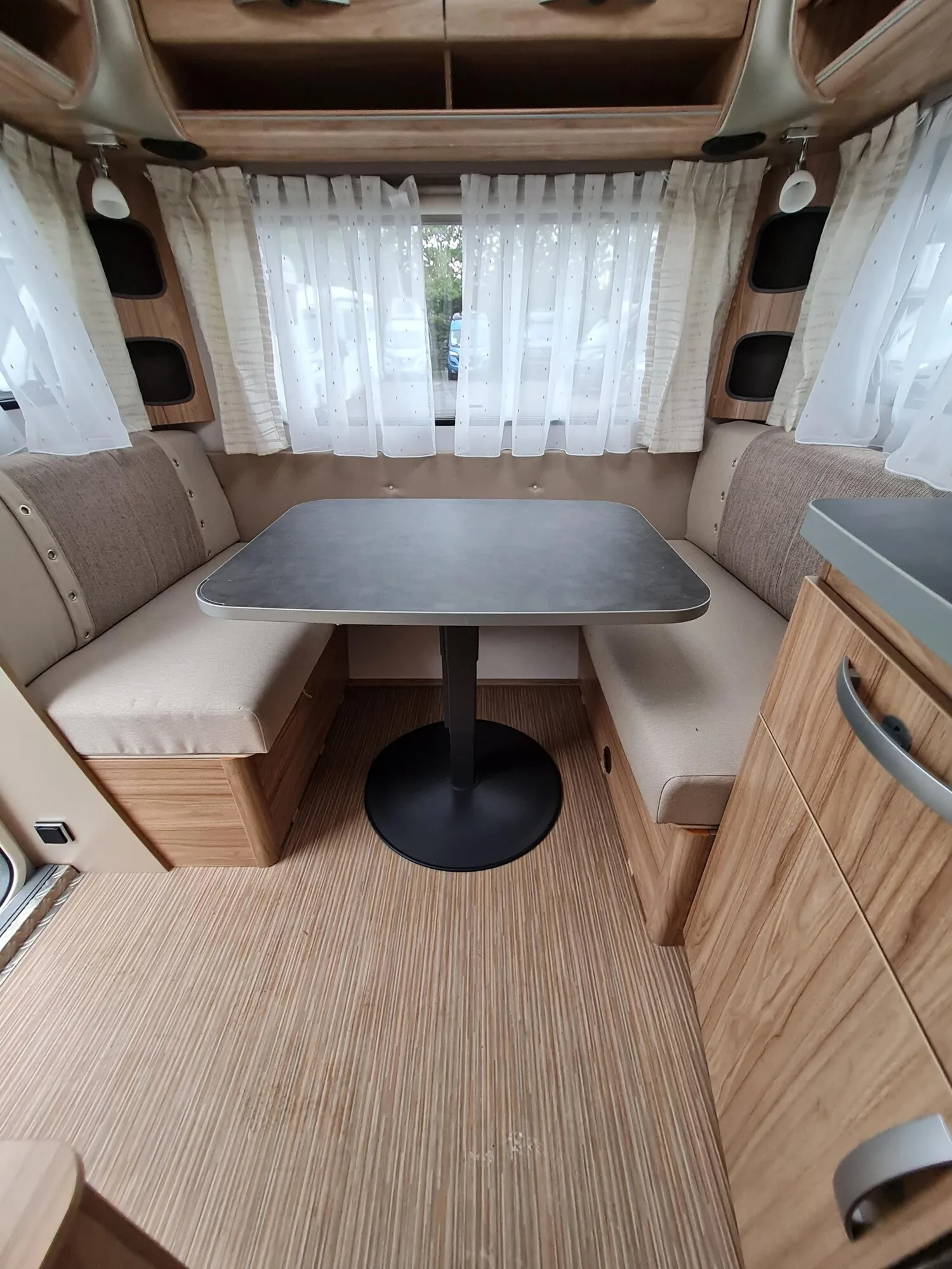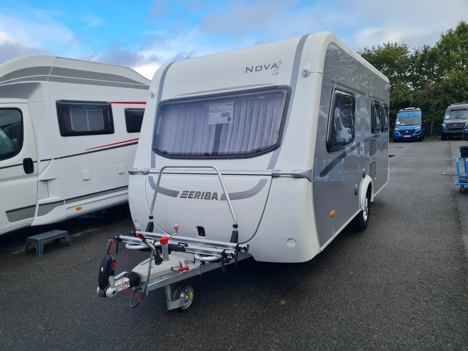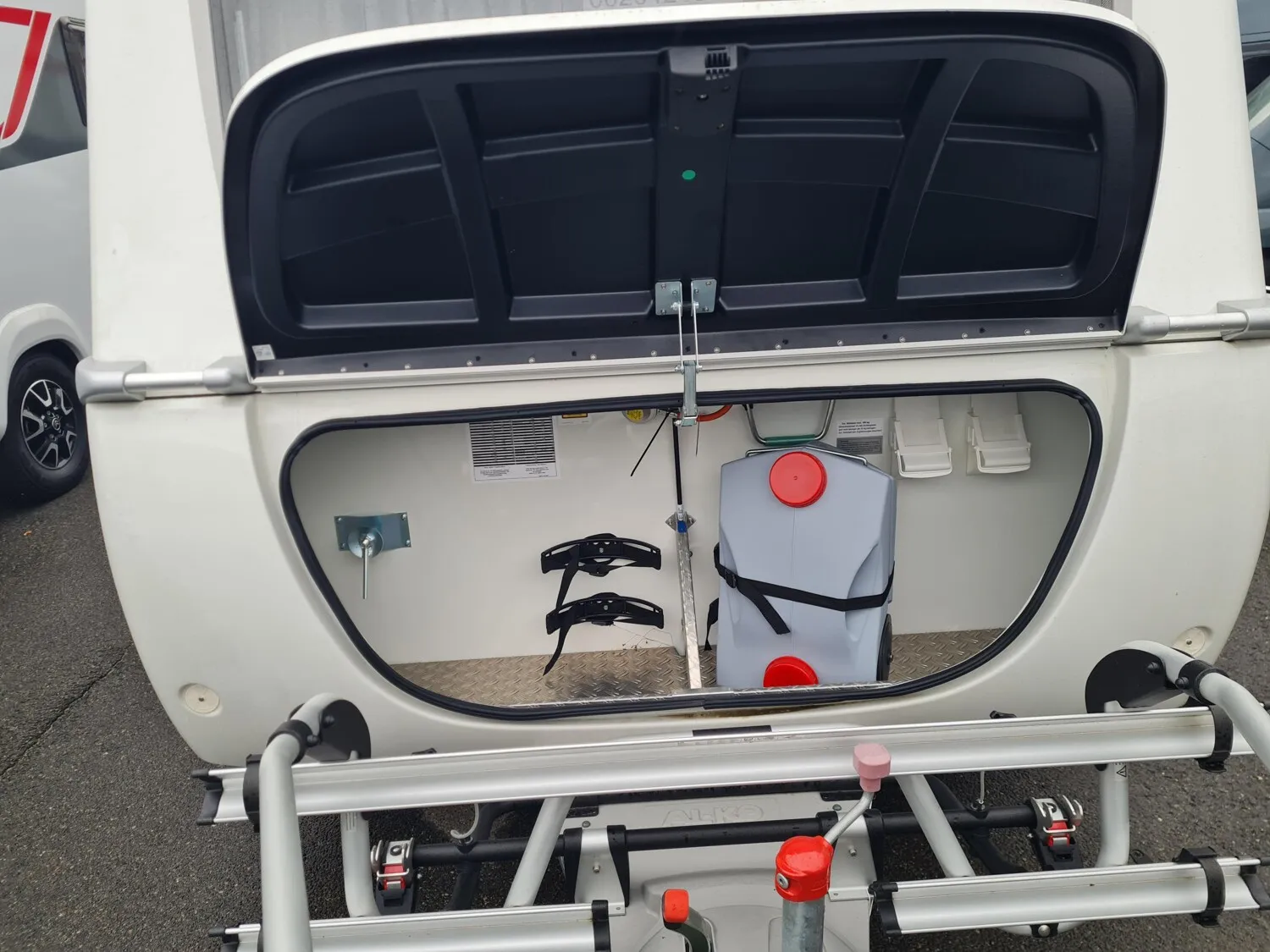 - Moving-Paket (Autarkpaket (95 Ah AGM-Aufbaubatterie, Ladegerät mit integriertem Booster), Fliegenschutz-Rolltür (gesamte Türhöhe), bedienfreundlich durch seitliche Führung, Deichsel-Fahrradträger Thule Caravan Superb Short für zwei Fahrräder, max. Traglast 60 kg (für E-Bikes geeignet), Abstützfuß (4 Stk.) für Caravanstützen: Verhindert Einsinken oder Wegrutschen der Stützen, Deichselstützrad mit integrierter Stützlastanzeige, 22 l Abwassertank, rollbar (Unterbringung im Gaskasten), Steckdosenpaket (2 x 230 V Zusatzsteckdosen in Wohnraum und Küche und 1x USB-Doppelsteckdose in Wohnraum))