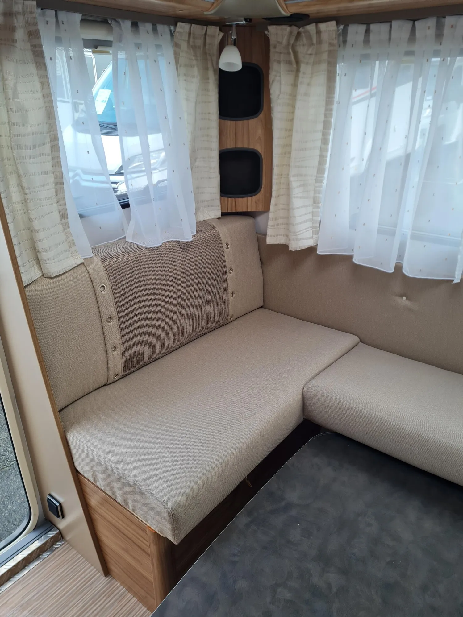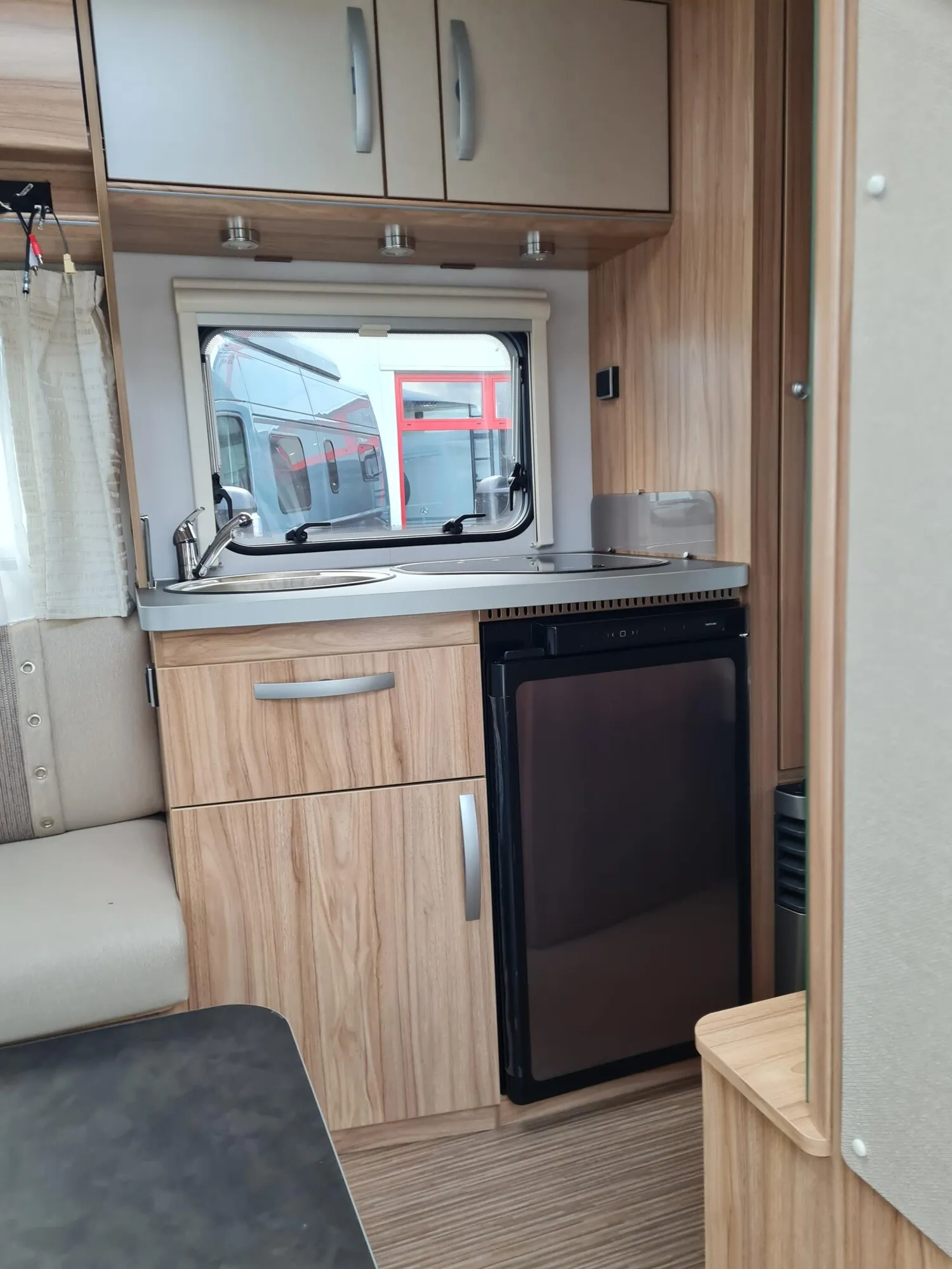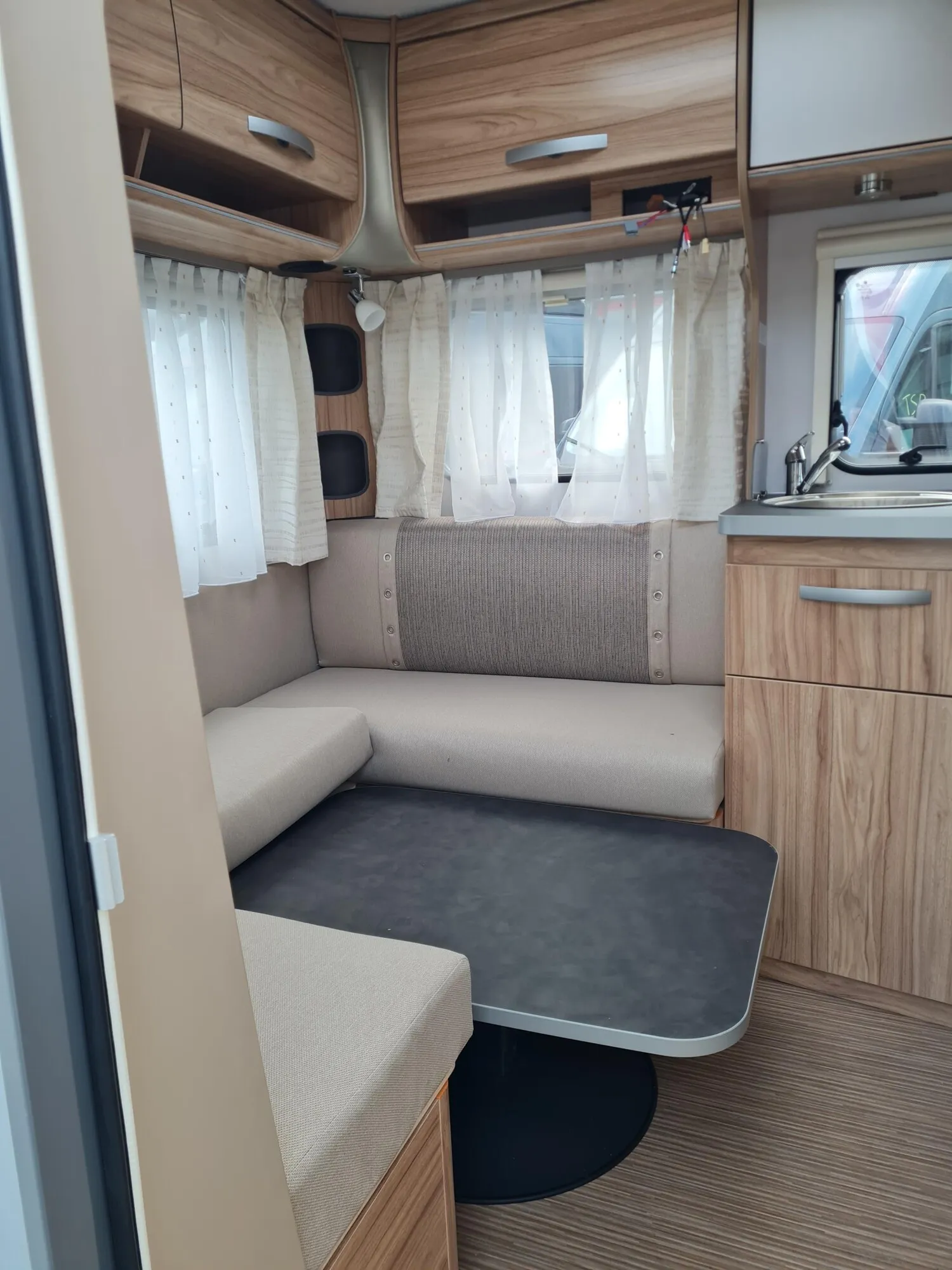 - Moving-Paket (Autarkpaket (95 Ah AGM-Aufbaubatterie, Ladegerät mit integriertem Booster), Fliegenschutz-Rolltür (gesamte Türhöhe), bedienfreundlich durch seitliche Führung, Deichsel-Fahrradträger Thule Caravan Superb Short für zwei Fahrräder, max. Traglast 60 kg (für E-Bikes geeignet), Abstützfuß (4 Stk.) für Caravanstützen: Verhindert Einsinken oder Wegrutschen der Stützen, Deichselstützrad mit integrierter Stützlastanzeige, 22 l Abwassertank, rollbar (Unterbringung im Gaskasten), Steckdosenpaket (2 x 230 V Zusatzsteckdosen in Wohnraum und Küche und 1x USB-Doppelsteckdose in Wohnraum))