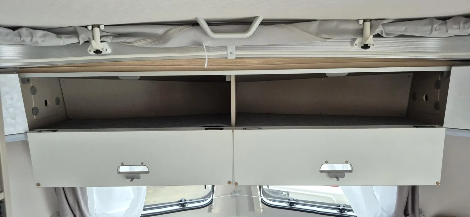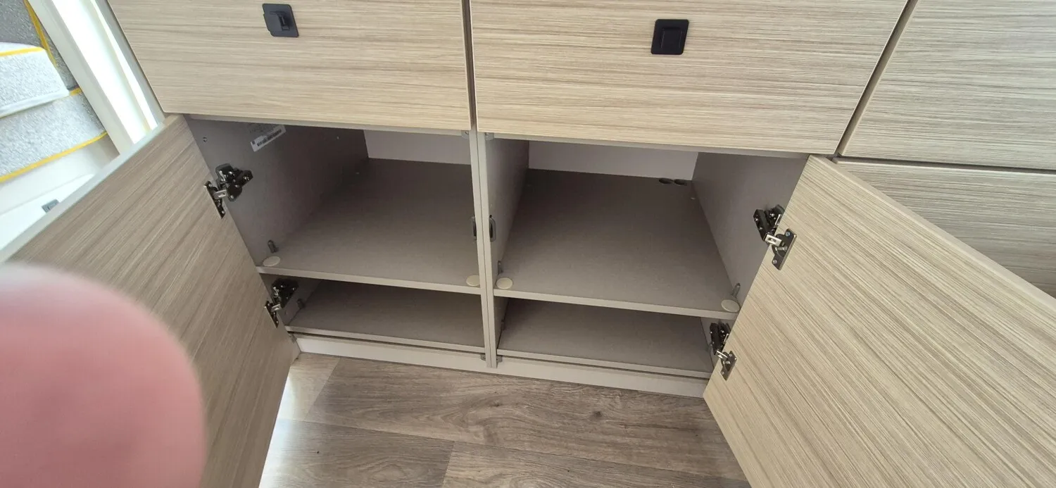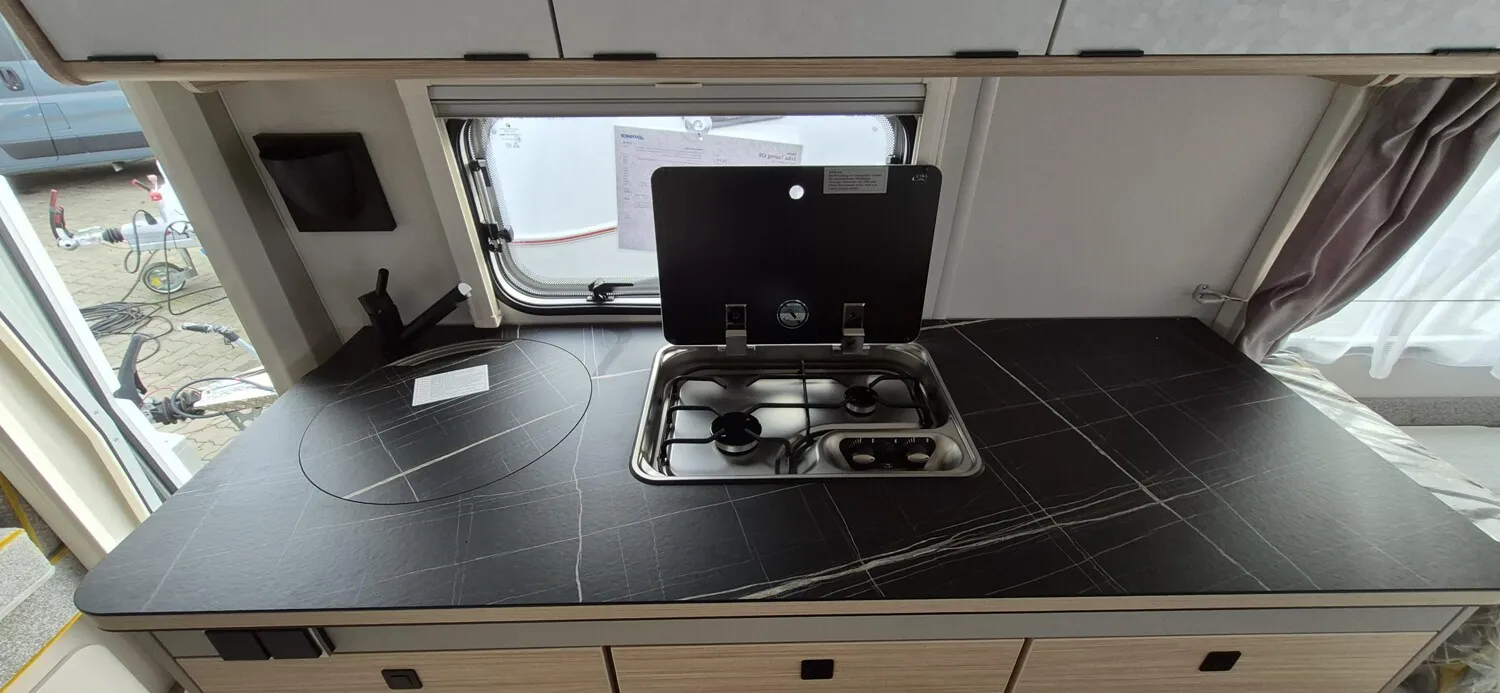 - Komfort-Paket (Fliegenschutz-Rolltür (gesamte Türhöhe), bedienfreundlich durch seitliche Führung, Komfort-Plissee-Rollos, Steckdosenpaket (2 x 230 V Steckdosen und 1 x USB-Doppelsteckdose), Abfalleimer in Eingangstür integriert, Spülenabdeckung mit Schneidebrett für Edelstahlspüle, Zusätzlicher Vergrößerungsspiegel mit Magnethalterung)