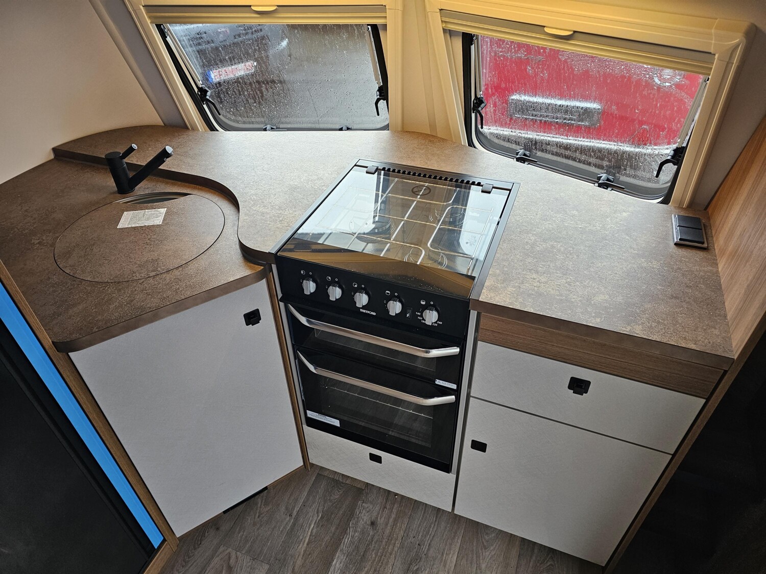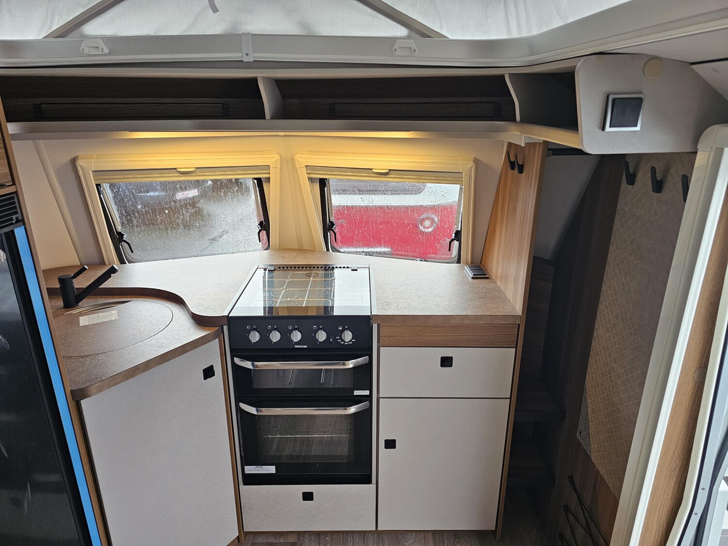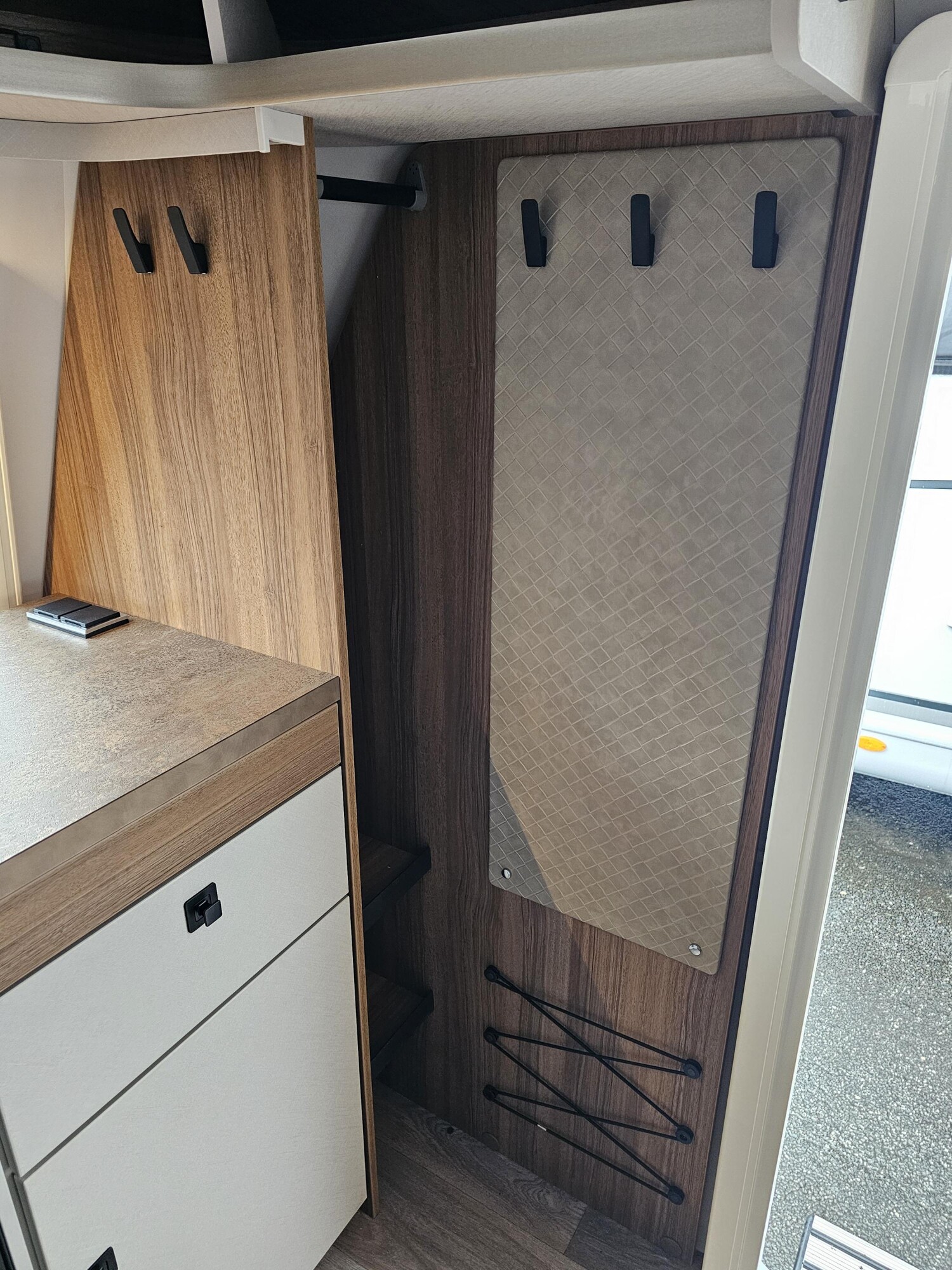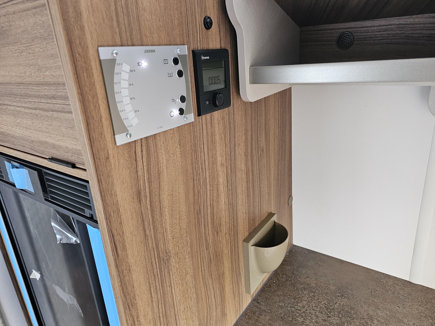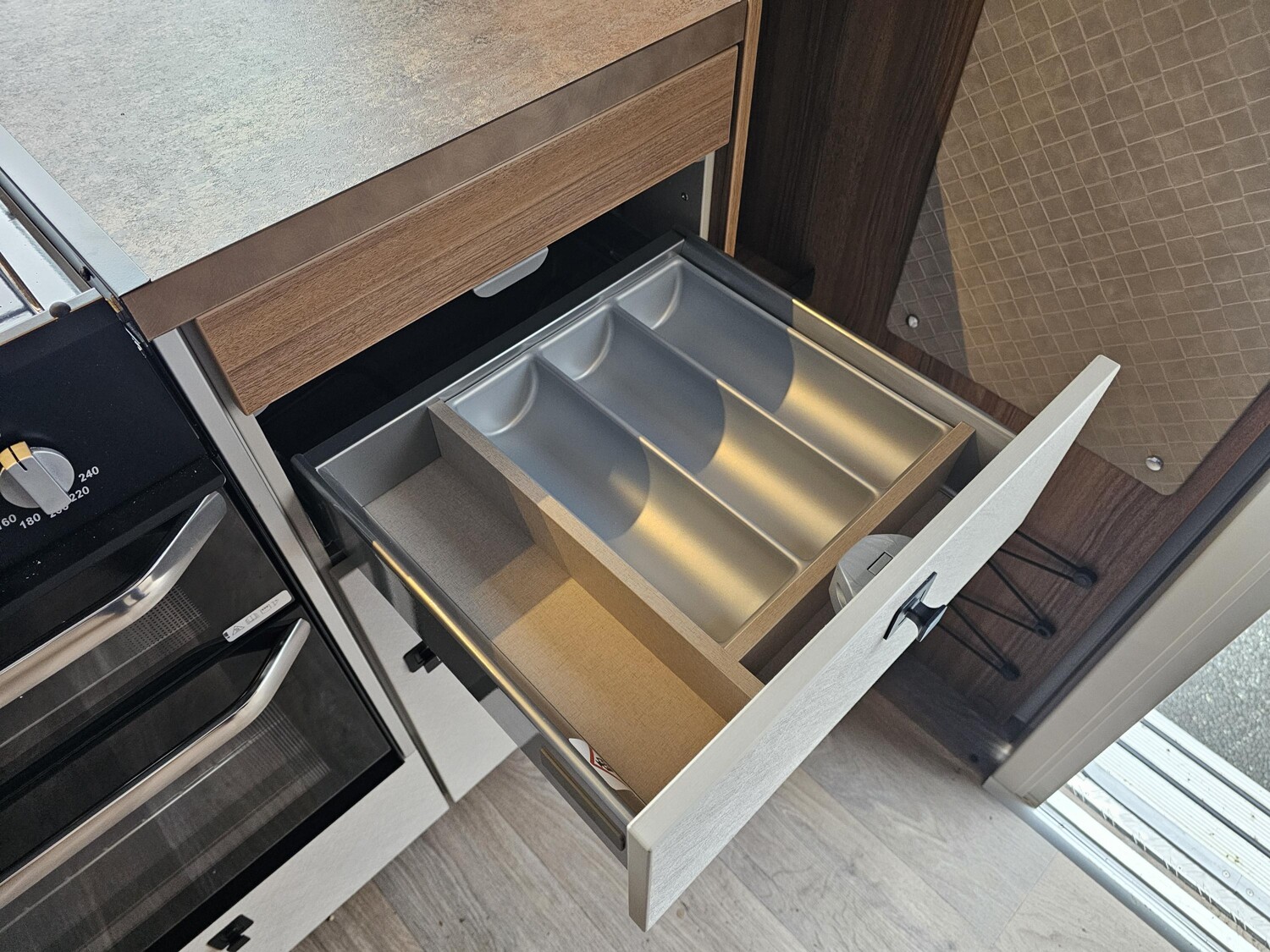 - Komfort-Paket (Fliegenschutz-Rolltür (gesamte Türhöhe), bedienfreundlich durch seitliche Führung, Komfort-Plissee-Rollos, Steckdosenpaket (2 x 230 V Steckdosen und 1 x USB-Doppelsteckdose), Abfalleimer in Eingangstür integriert, Spülenabdeckung mit Schneidebrett für Edelstahlspüle, Zusätzlicher Vergrößerungsspiegel mit Magnethalterung)