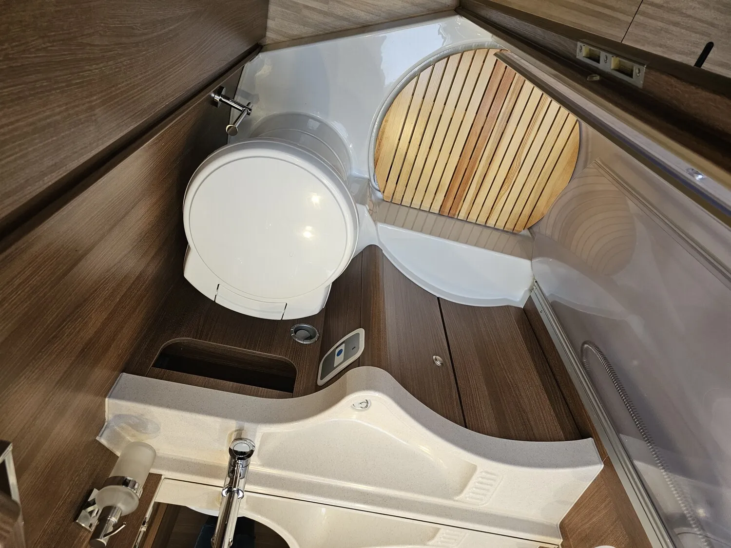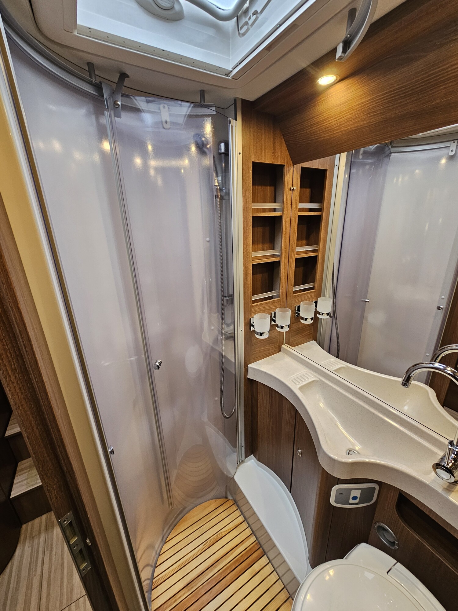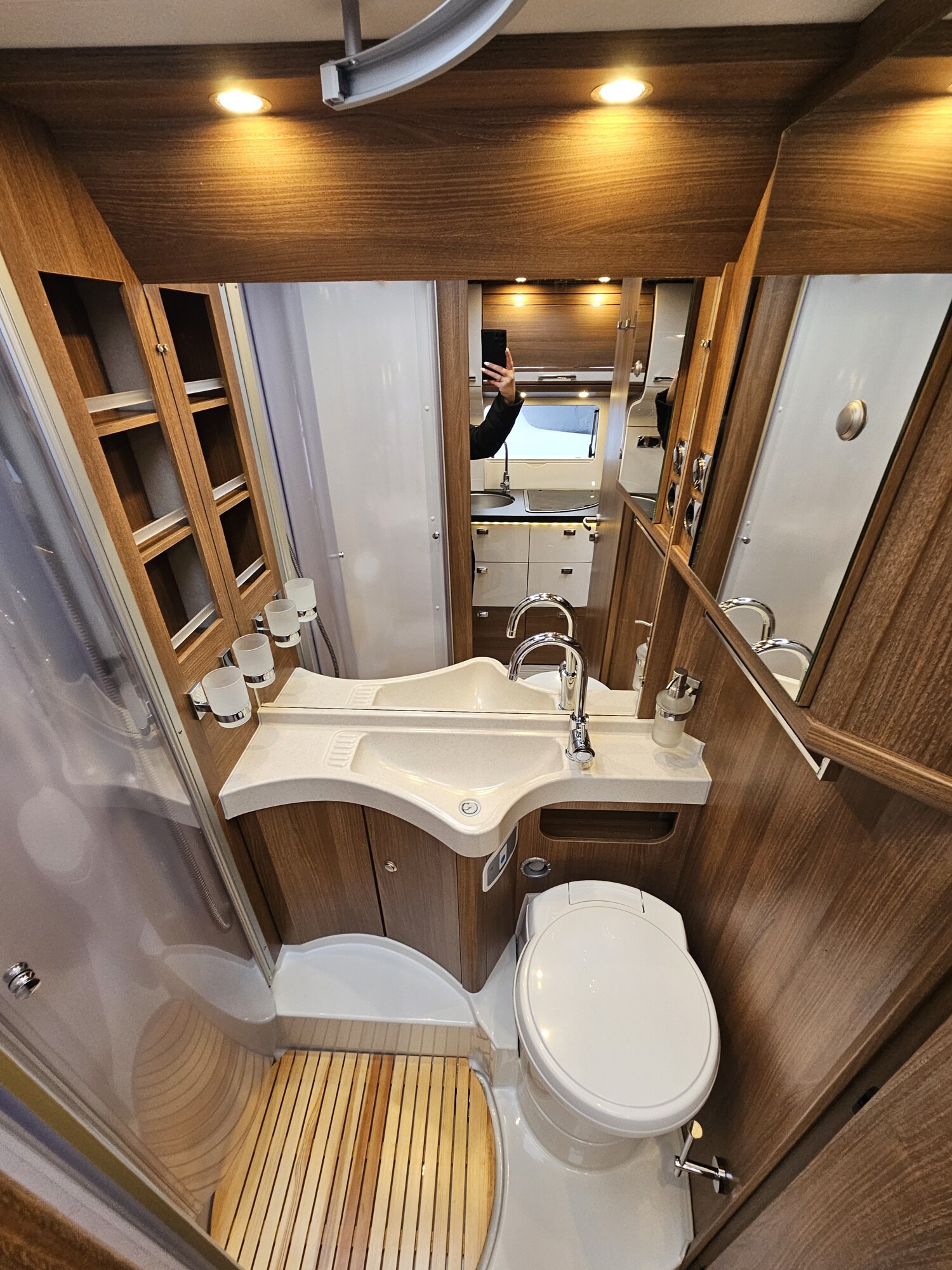 - Nasszelle mit einer Duschkabine inkl. Holzrost, einem Waschbecken, einem Spiegel, Stauschränke und einer Thetford Cassettentoilette