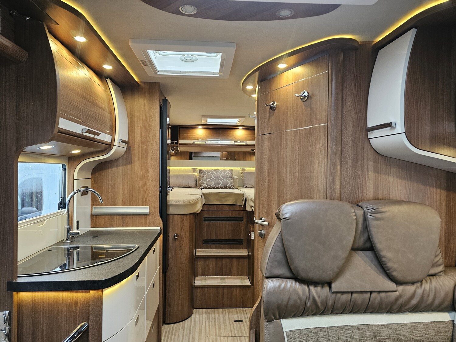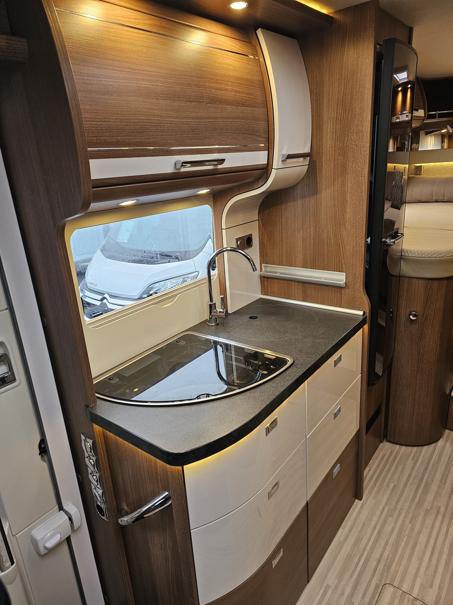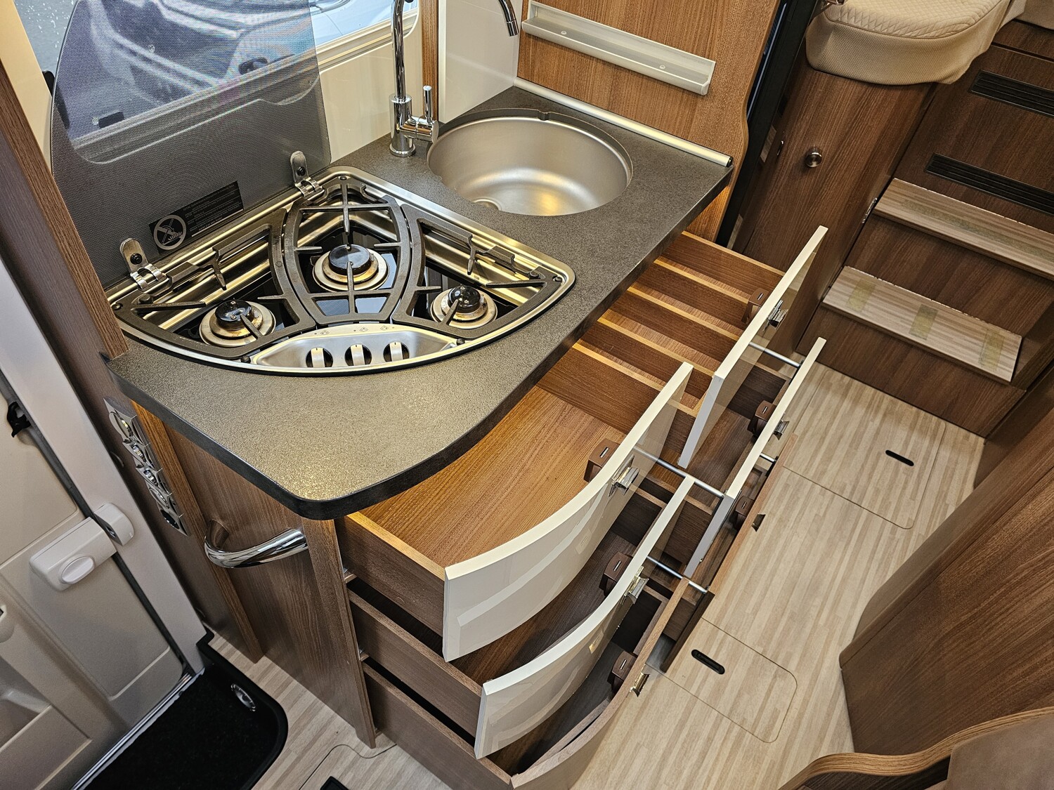 - Küchenzeile mit einem 3-Flammkocher und einer Spüle inkl. Abdeckungen, großzügigen Schubladen und einem Dometic Kühlschrank