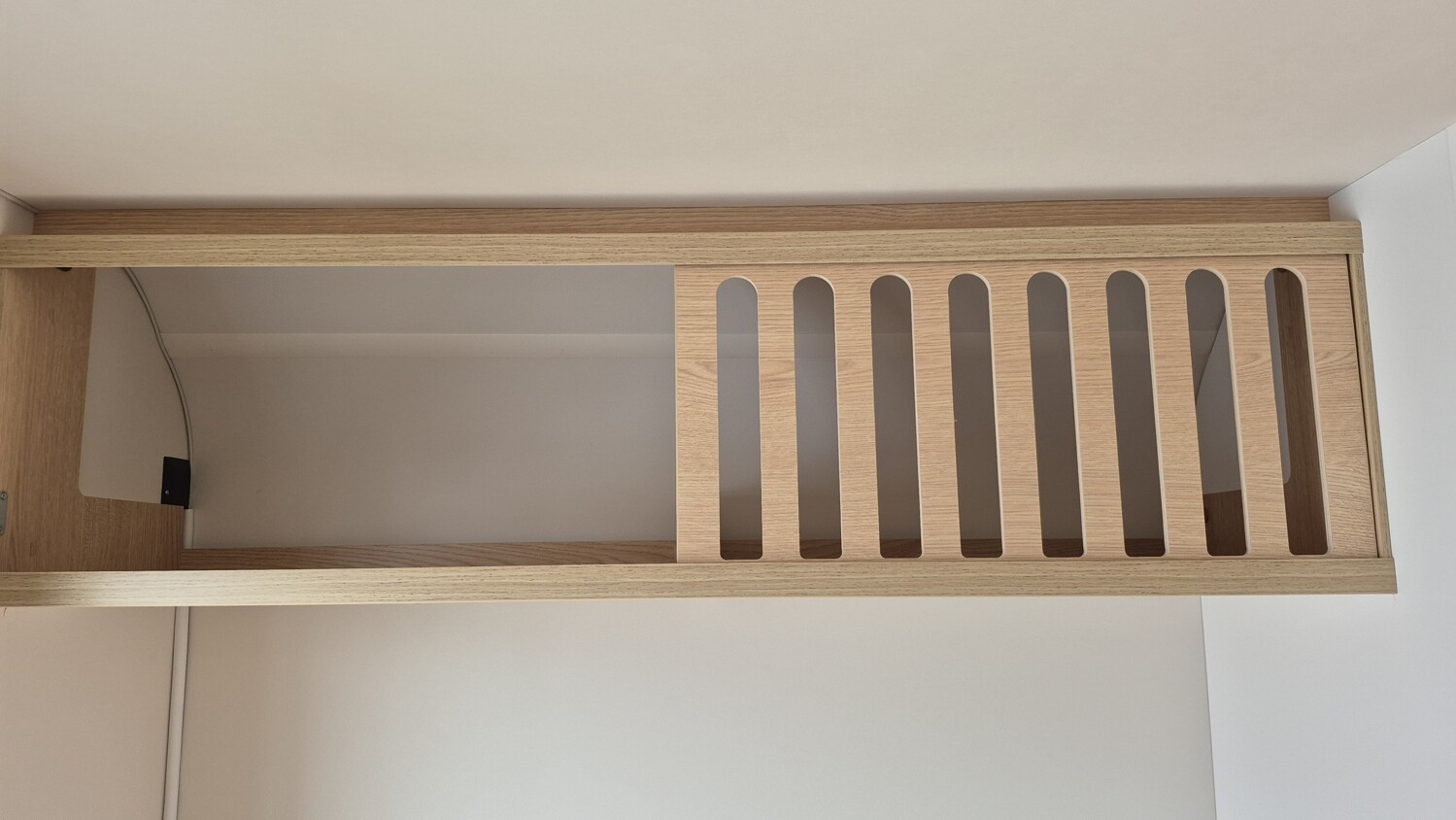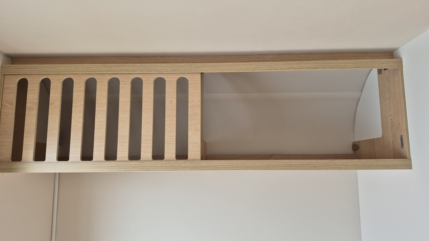- Clever gestaltete Stauraumlösungen wie das moderne Schieberegal bieten reichlich Platz für persönliche Gegenstände.