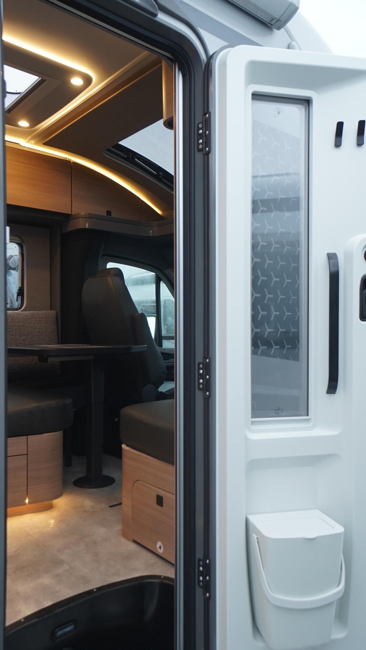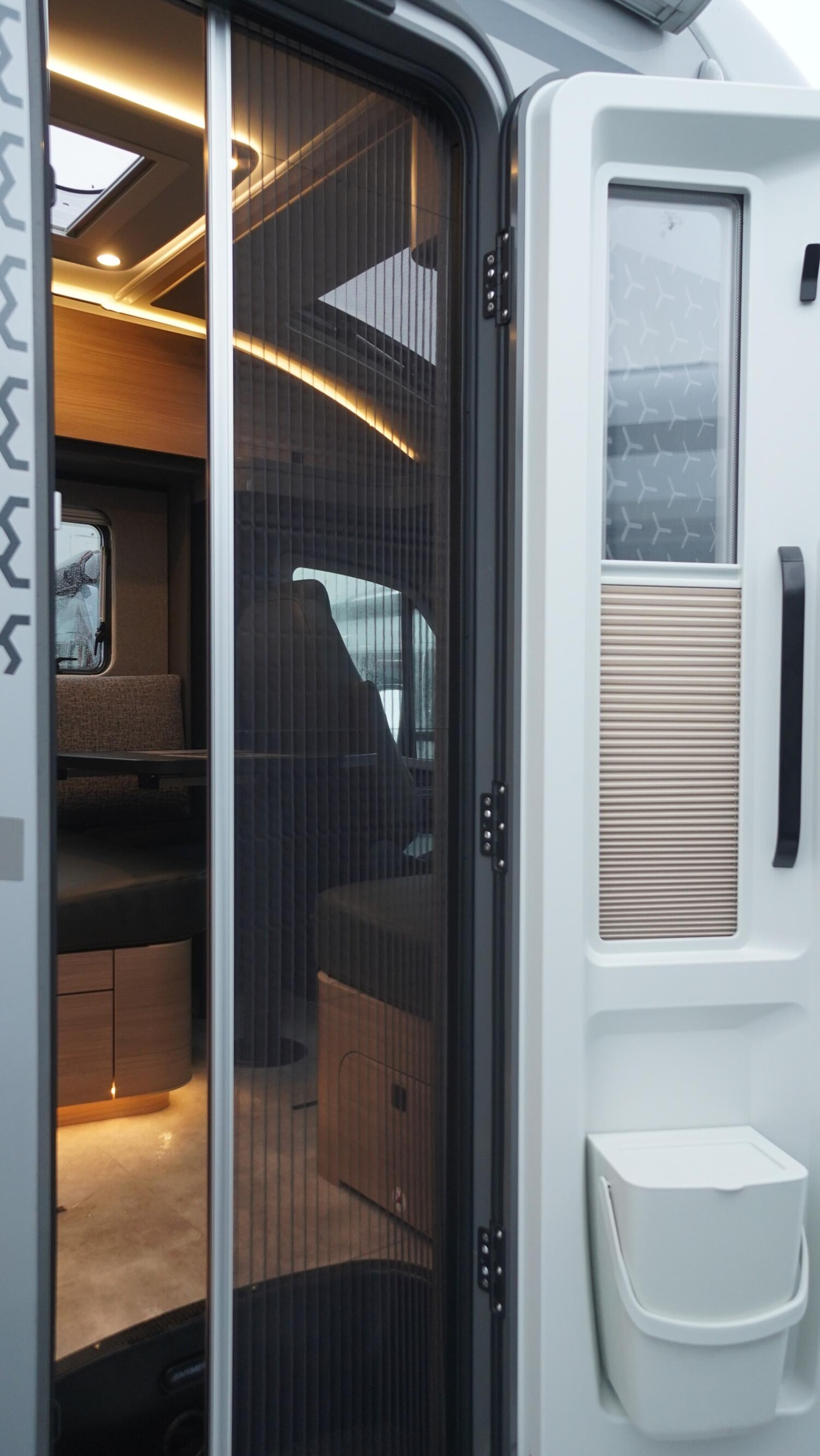 - Komfort-Eingangstür mit Fenster, Verdunkelungsrollo, integriertem Mülleimer und 2-fach Verriegelung