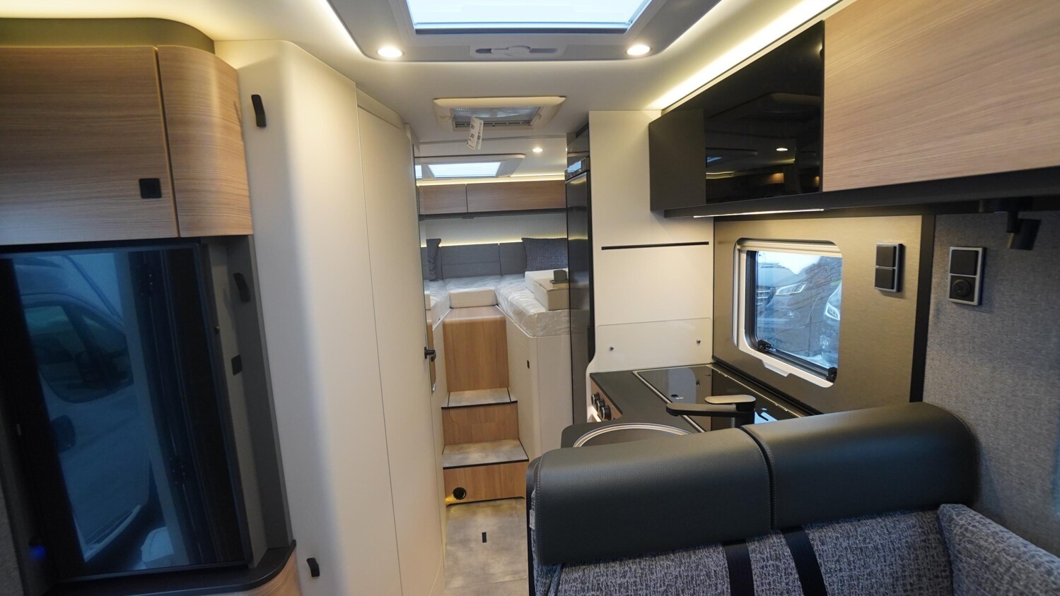 - Wohnkomfort-Paket (Filzverkleidung in Heckgarage, Spannbettlaken nach Maß für Heckbetten individuell an Matratzen angepasst, 4 Kissen mit Bezug, Ambient-Light-System: Mehr-Ebenen Lichtsystem mit dynamischer und individueller Steuerung der Beleuchtung (inkl. Lichttemperatur) sowie stimmungsvoller Sockelbeleuchtung, 4 x 230 V / 2 x Doppel-USB Zusatzsteckdosen)