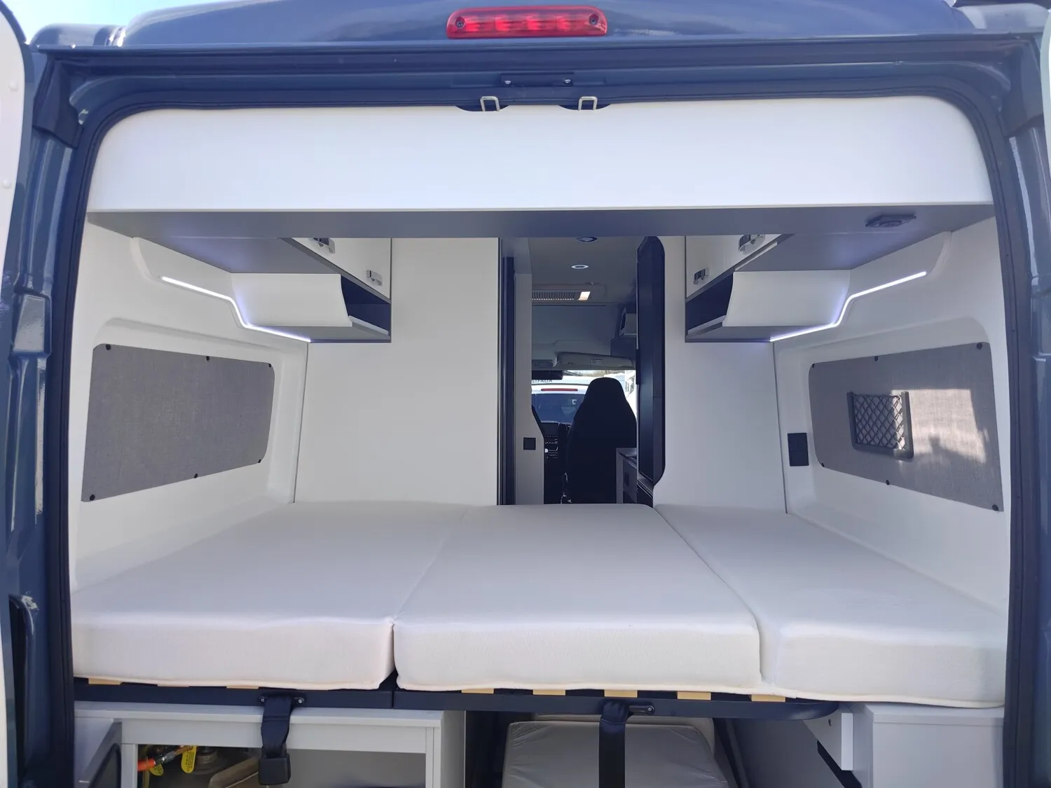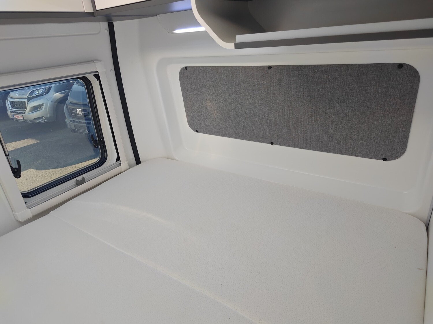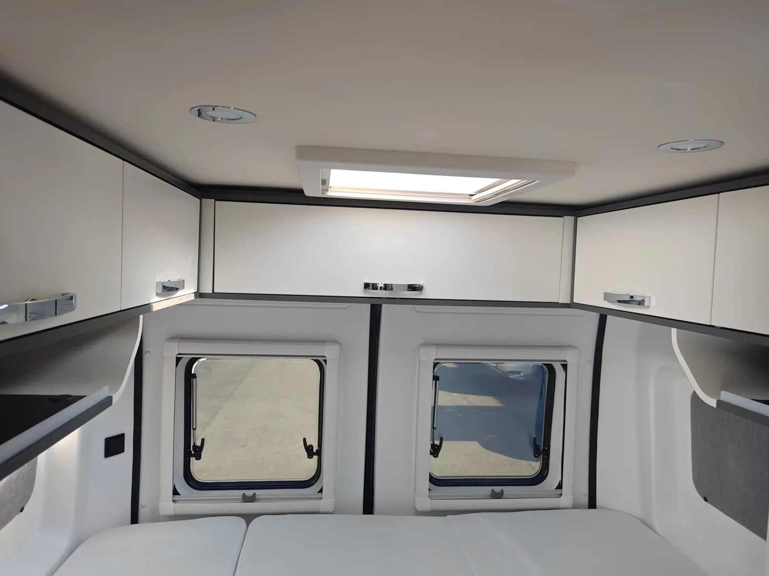 - Doppelbett im Heck mit Stauraum darunter, Dachstauschränken und Ablagefächer
