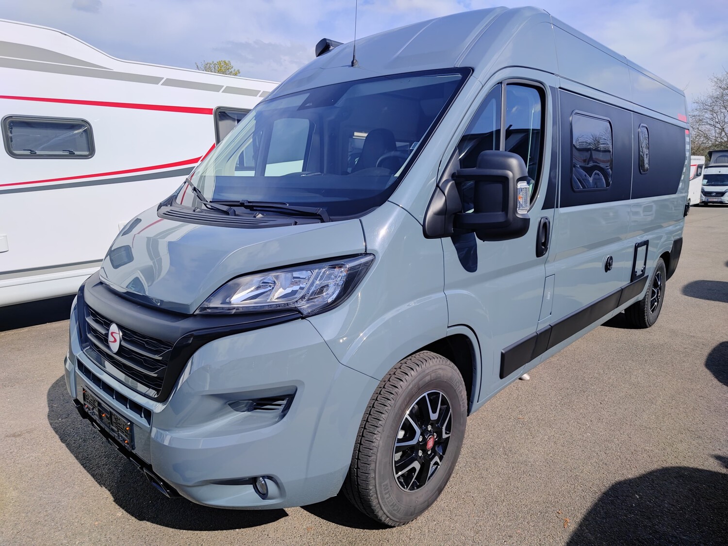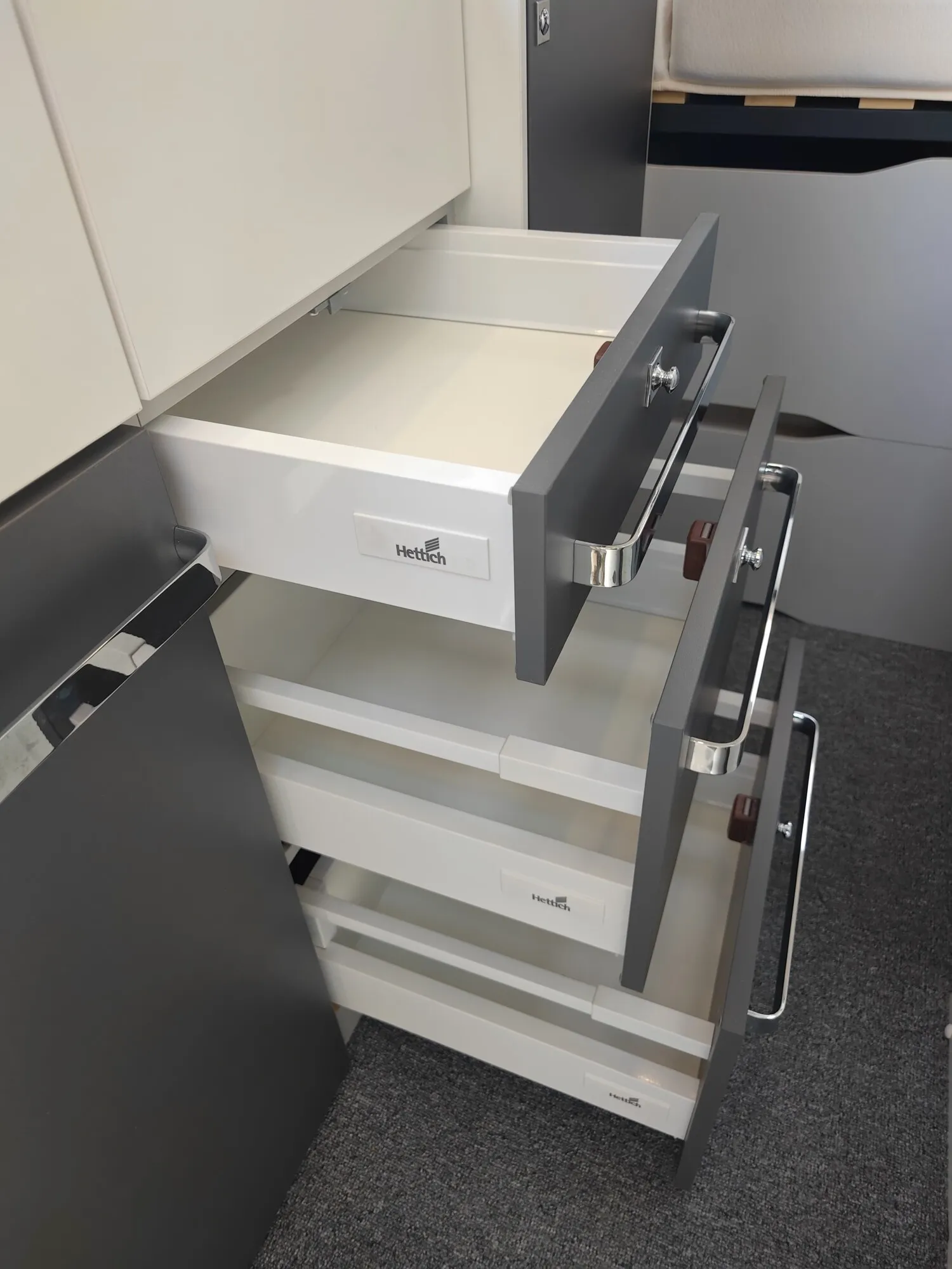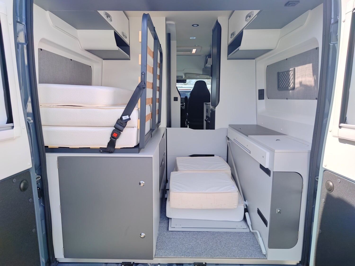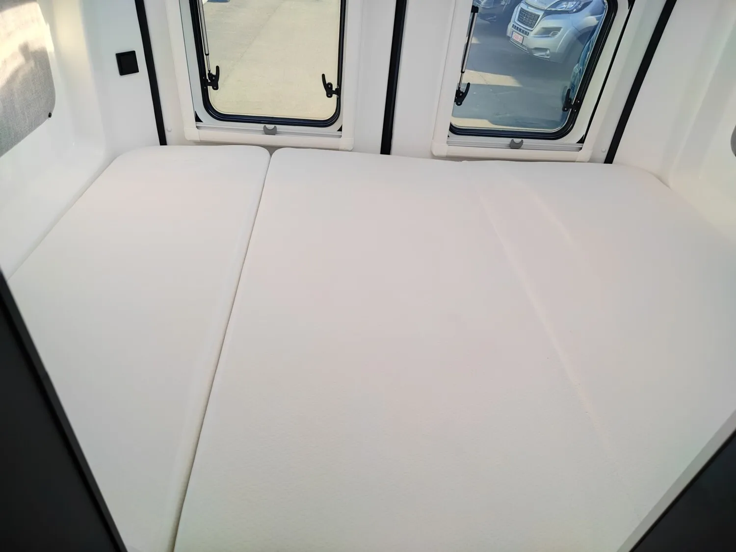 - Doppelbett im Heck mit Stauraum darunter, Dachstauschränken und Ablagefächer