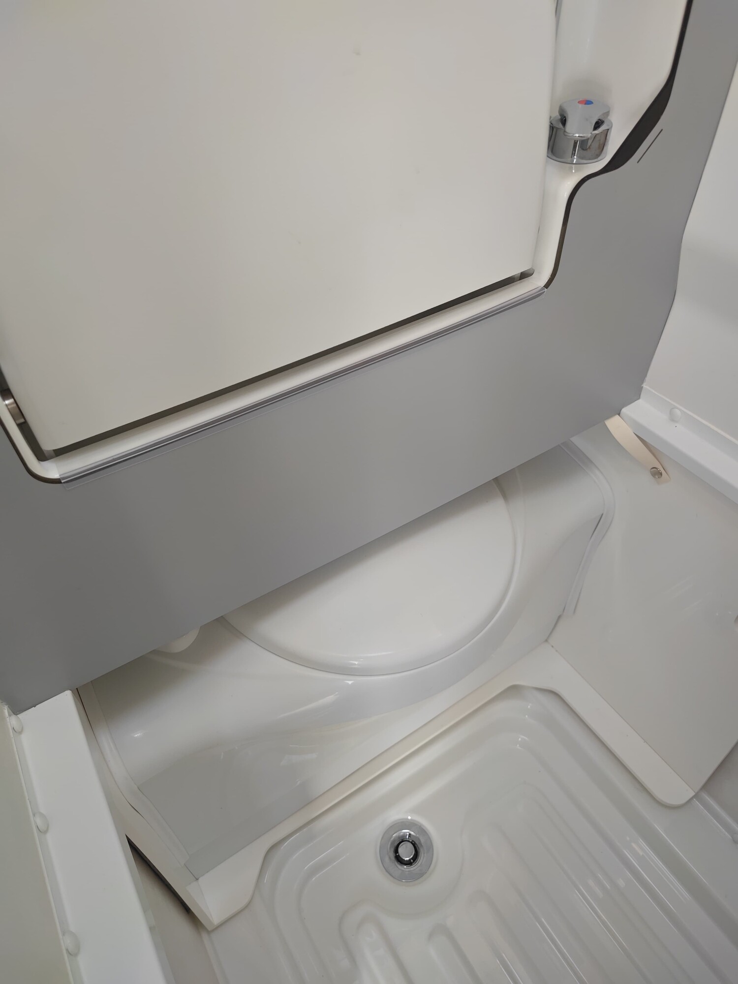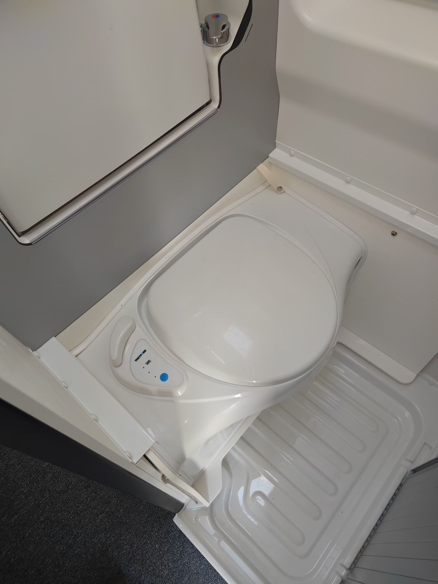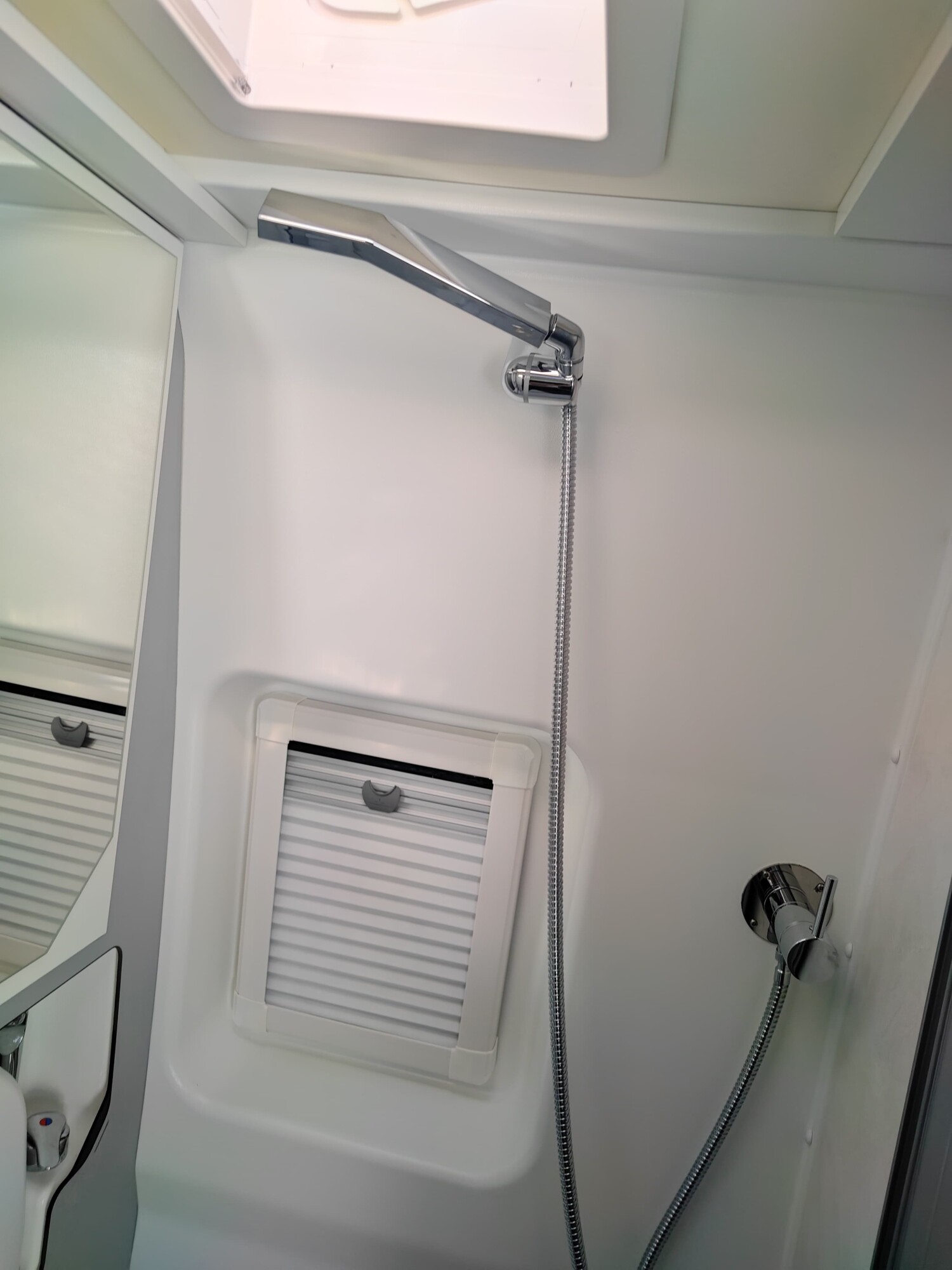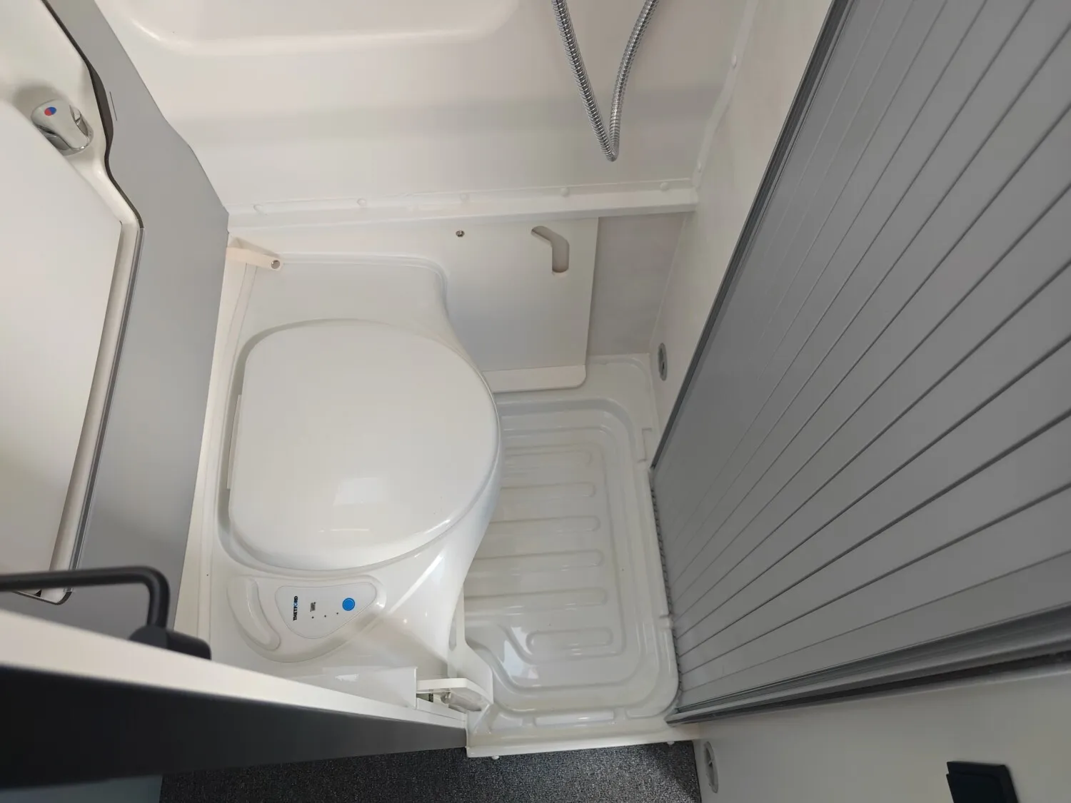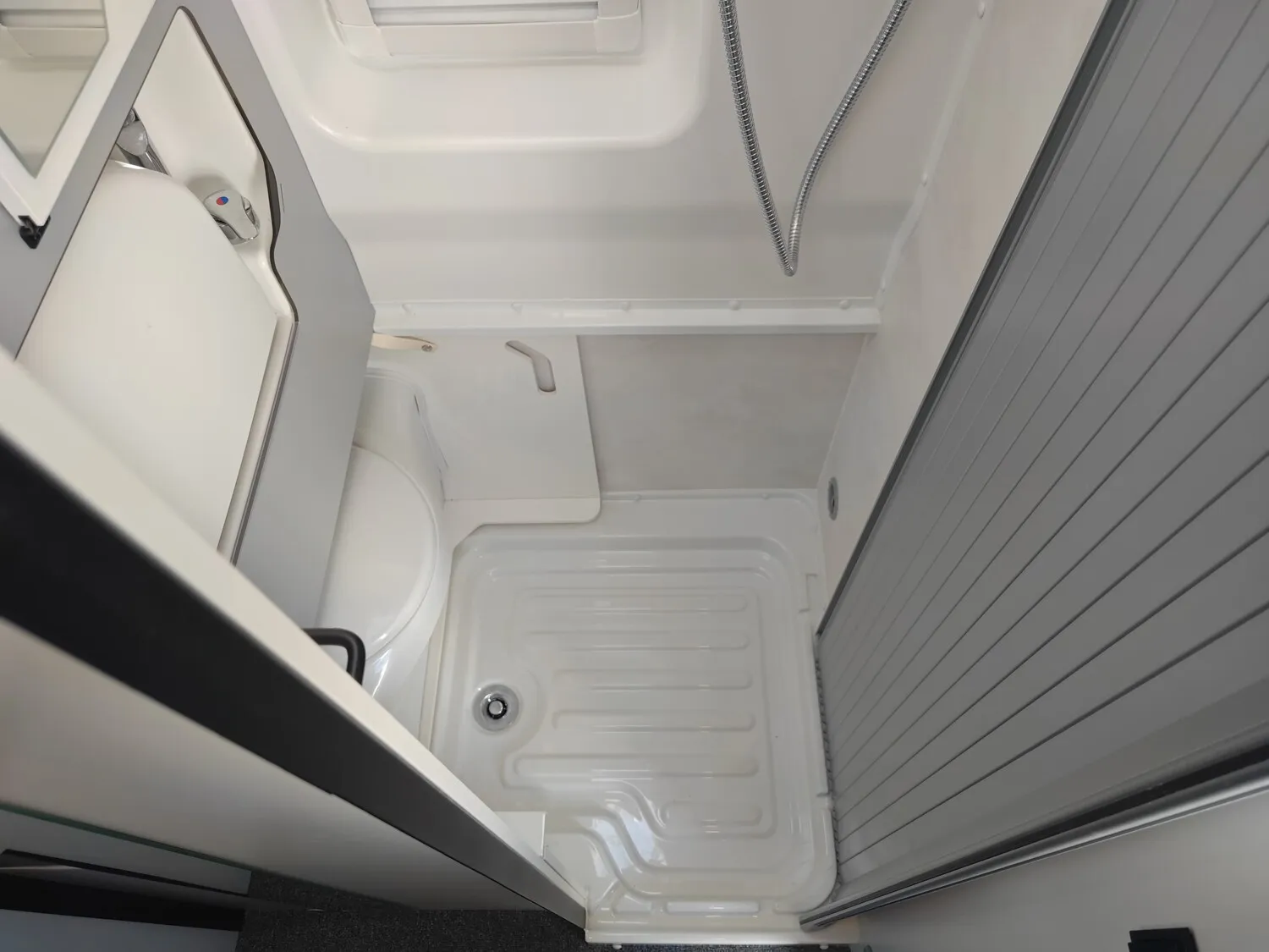 - Nasszelle mit einer ausziehbaren Banktoilette, einem klappbaren Waschbecken, einem Spiegelschrank, einem Seitenfenster und einer Duschausstattung