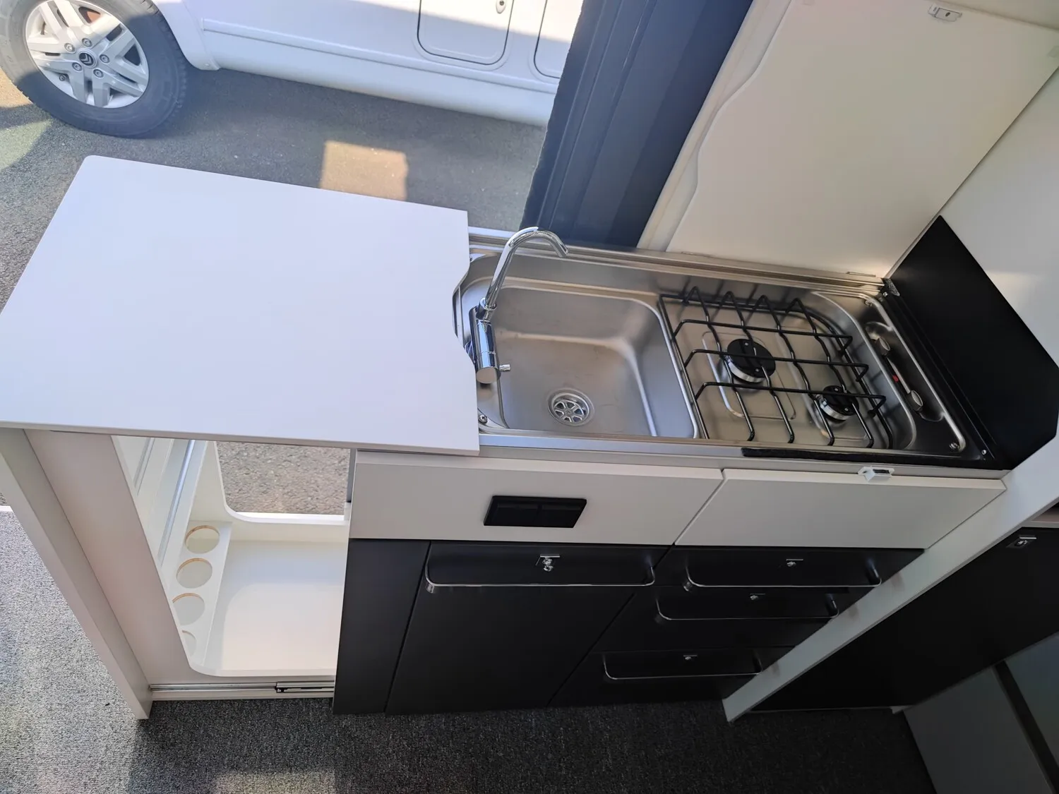 - Küchenzeile mit einem 2-Flammenkocher inkl. klappbarer Abdeckung, einer Spüle und einem seitlichen Schrank, der bei Herausziehen als Arbeitsflächenerweiterung dient, beim reinschieben dient er als Spülenabdeckung, Schubladen und Stauschränken