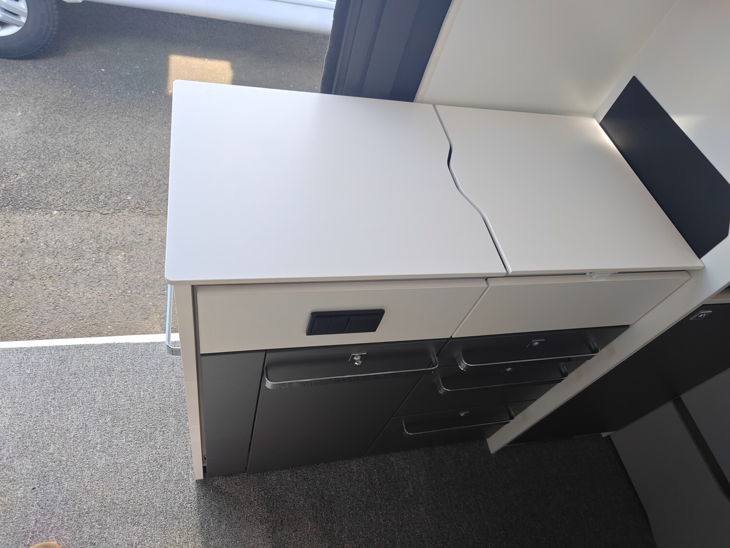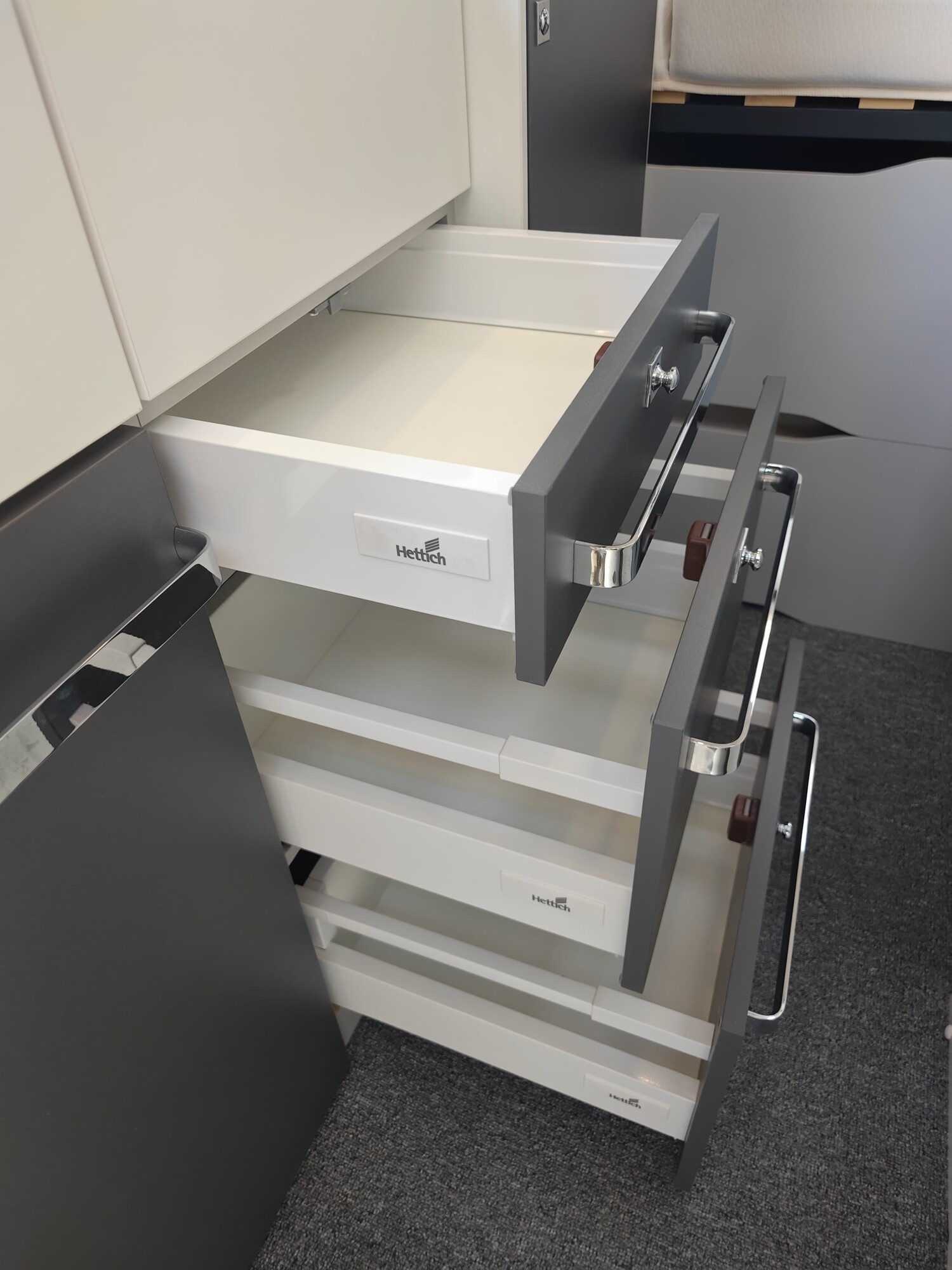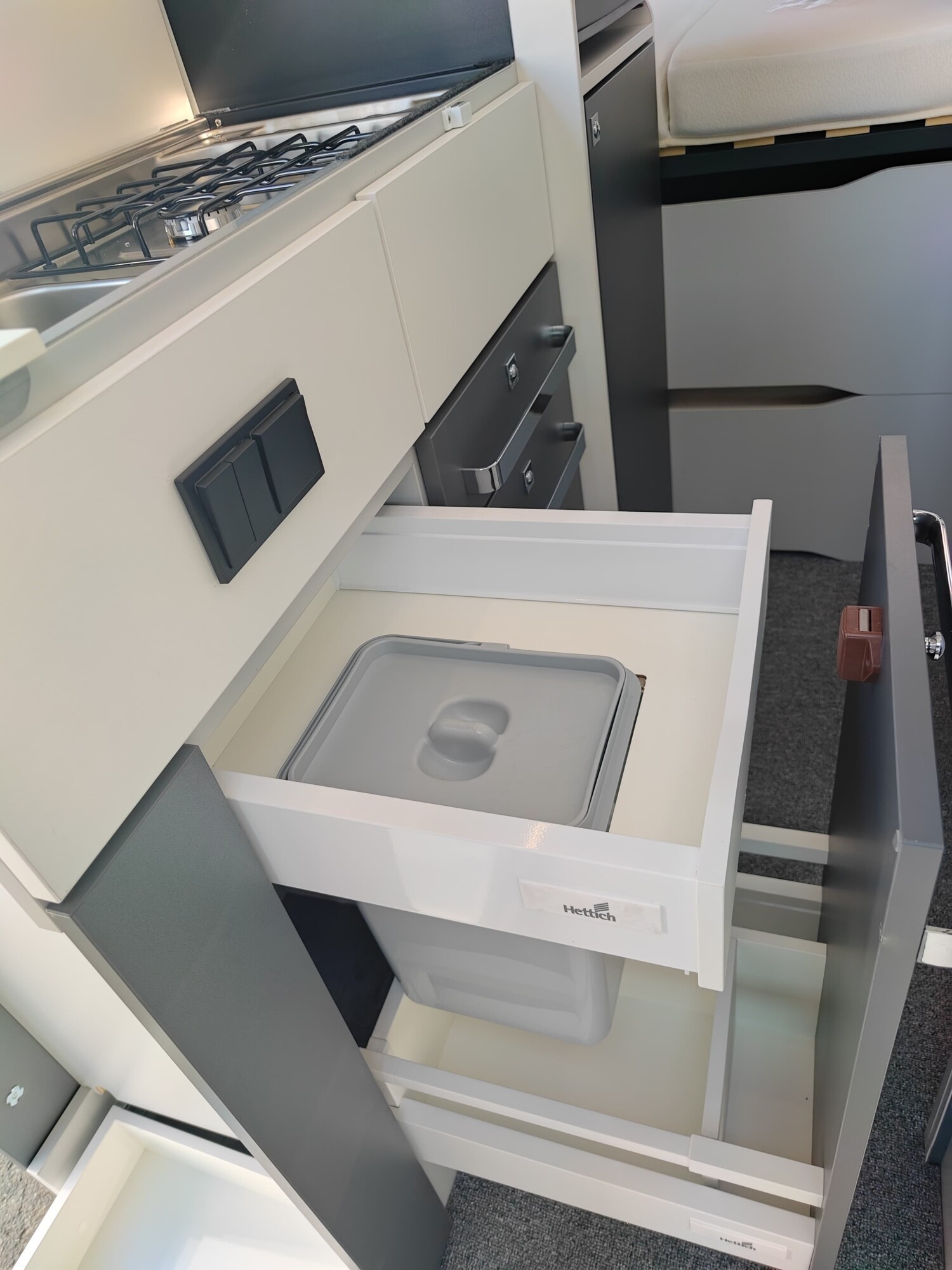 - Küchenzeile mit 2-Flammenkocher inkl. klappbarer Abdeckung, Spüle und seitlichen Schrank, der beim Herausziehen als Arbeitsflächenerweiterung dient, beim reinschieben dient er als Spülenabdeckung, Schubladen und Stauschränken