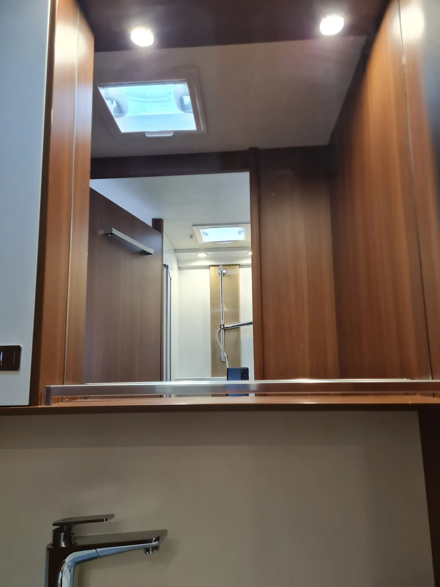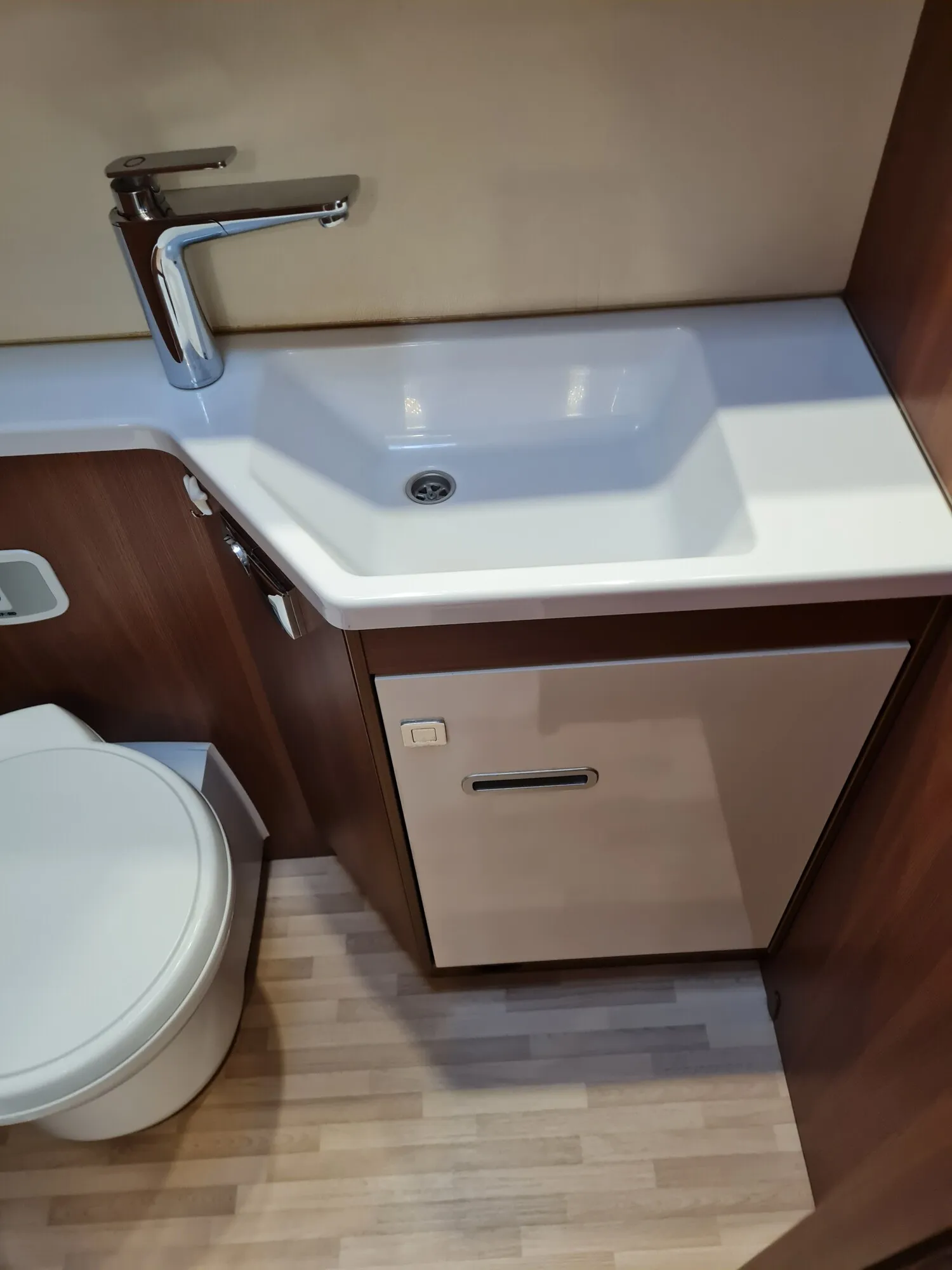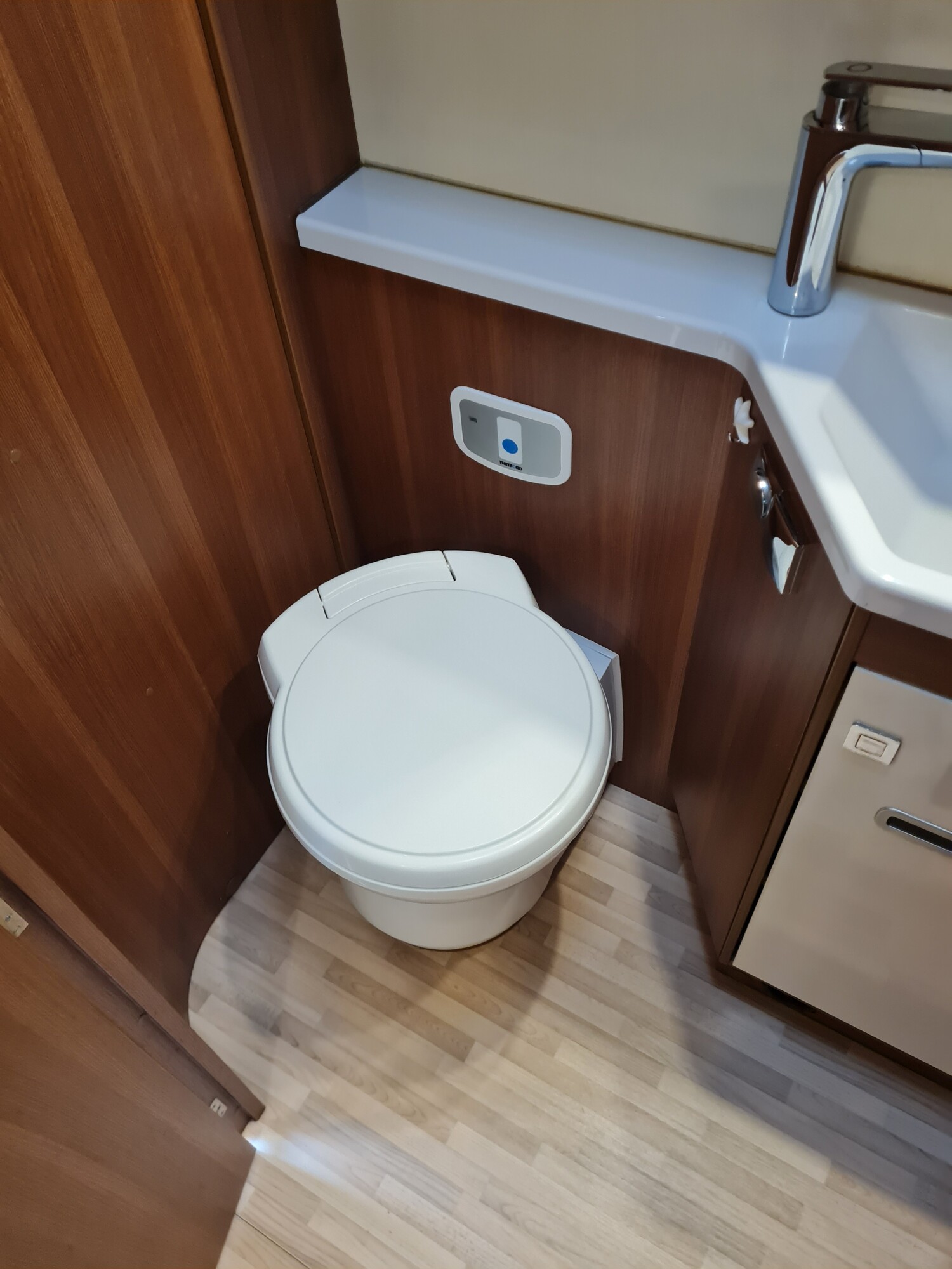 - Nasszelle mit einer Cassettentoilette von Dometic, einem Waschbecken, einem Spiegel und Staufächern