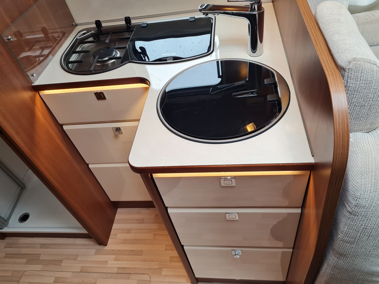 - Küchenzeile mit einem 3-Flammenkocher und einer Spüle inkl. Glasabdeckung, Schubladen und Dachstauschränken