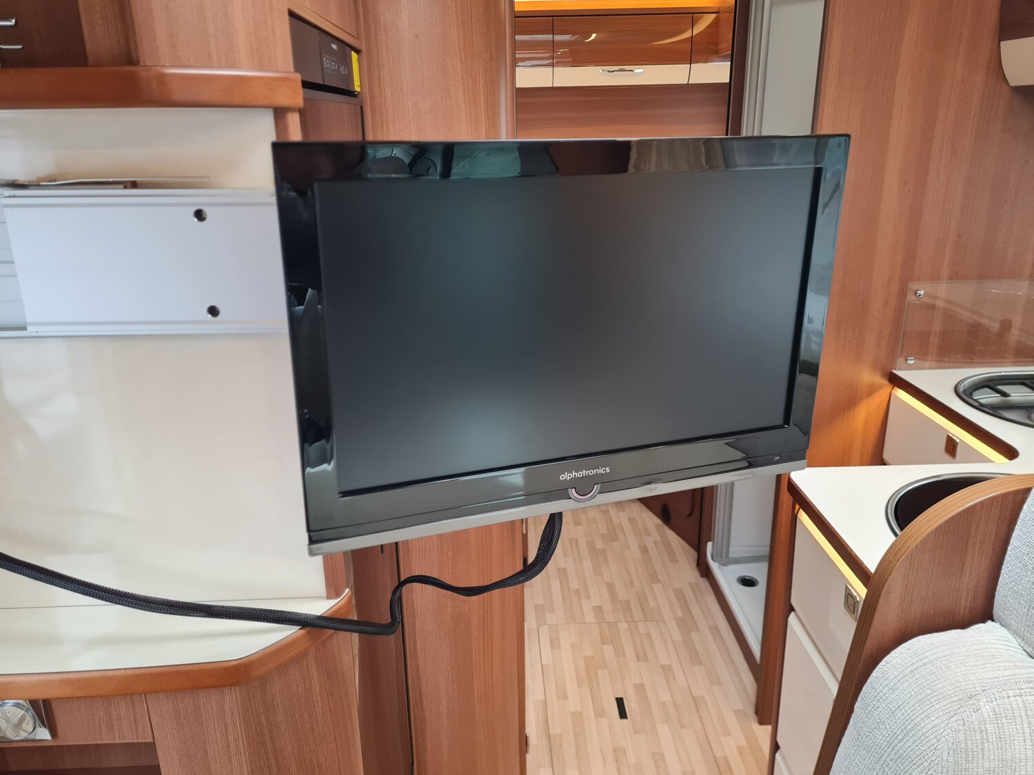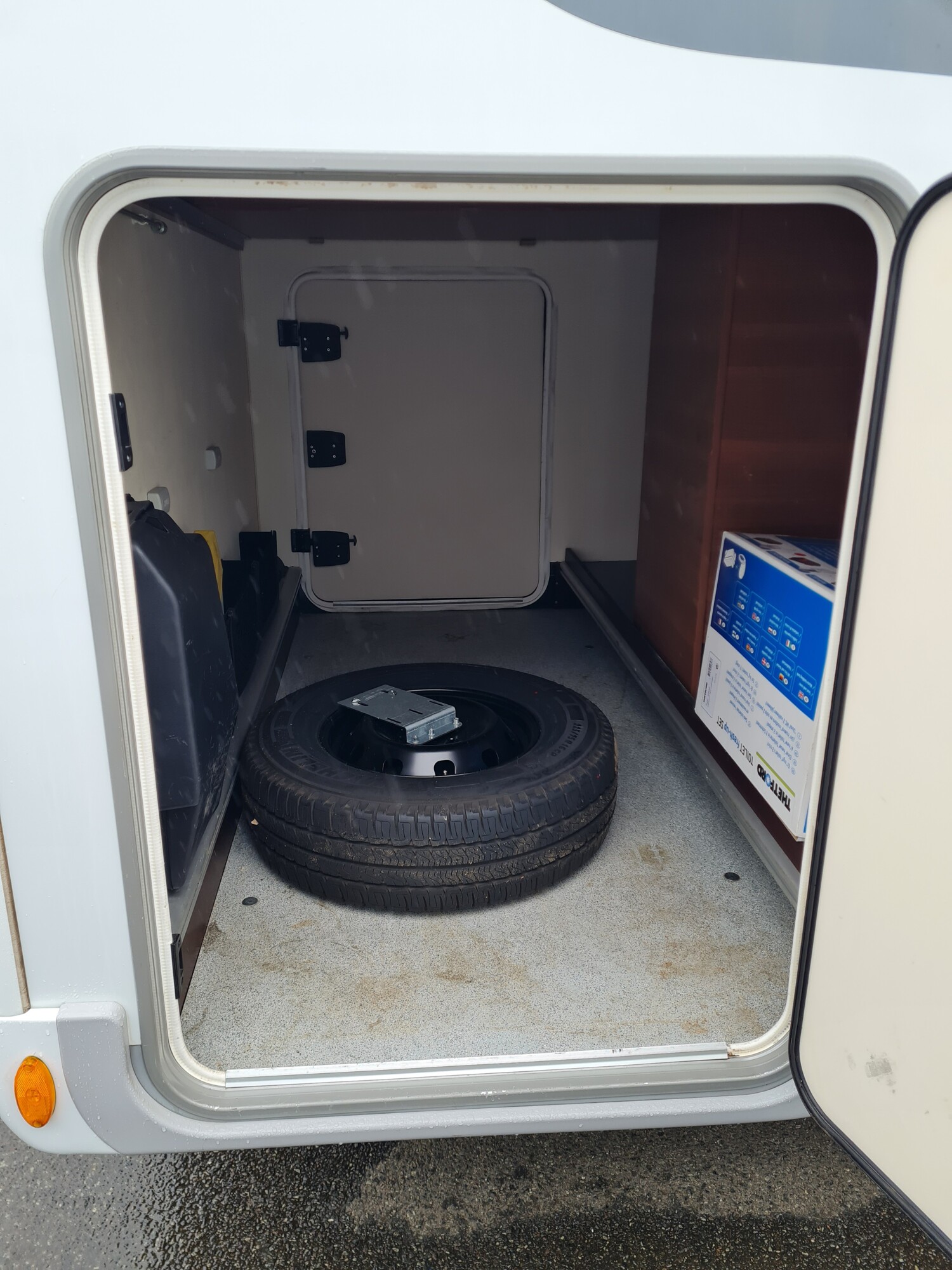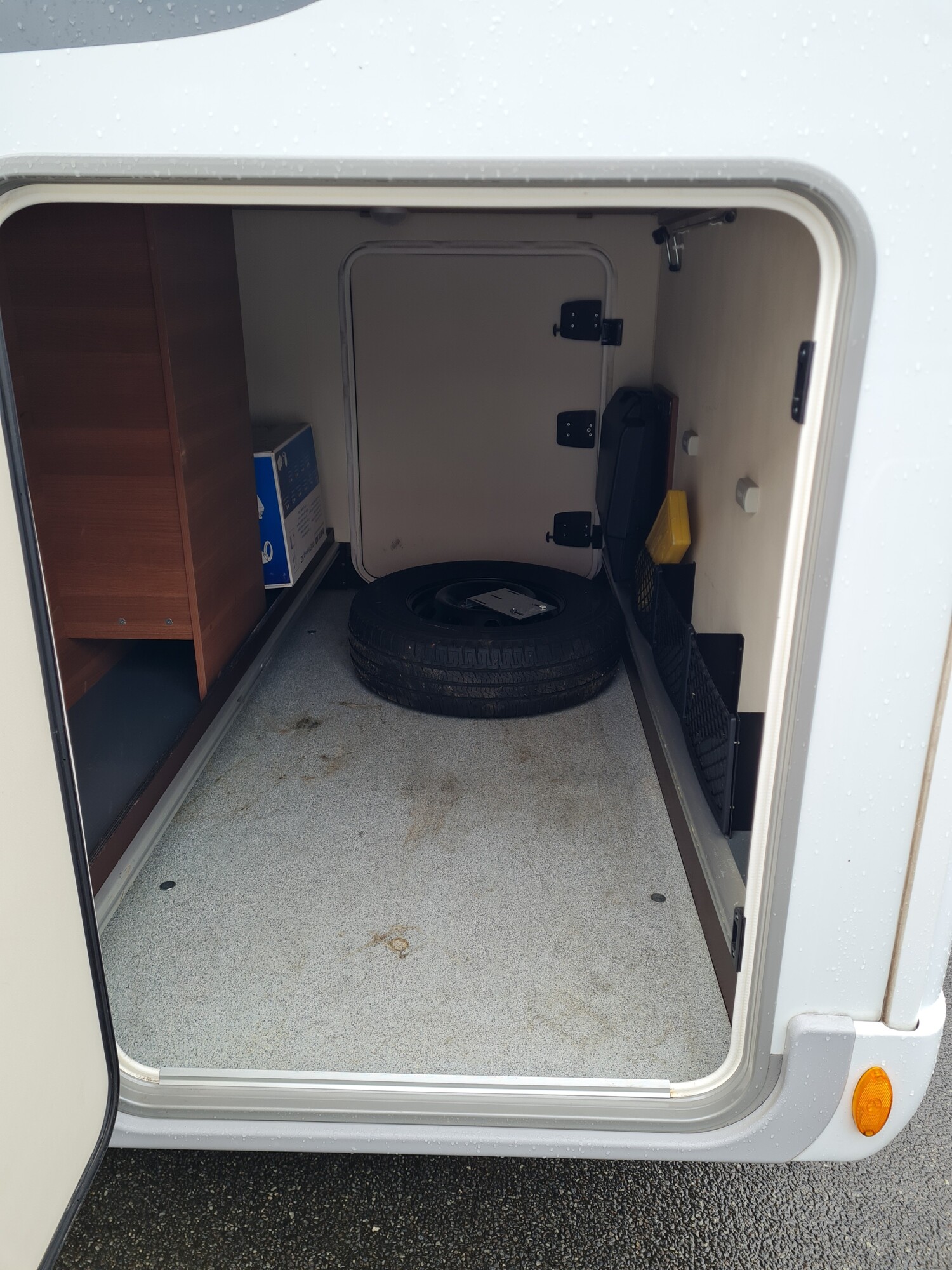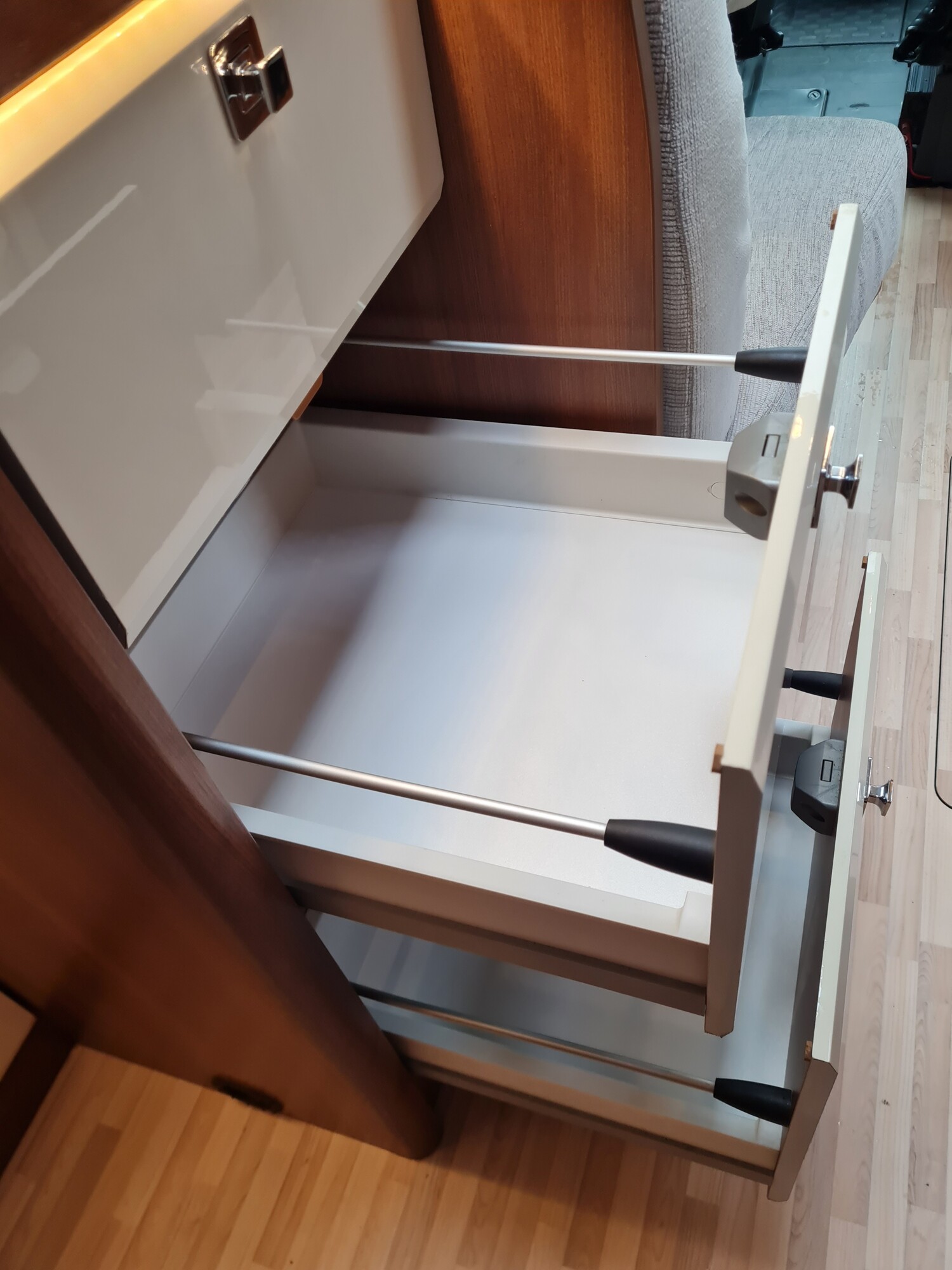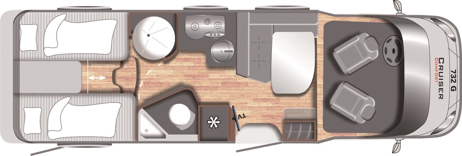 - Einzelbetten im heck inkl. Bettverbreiterung mit einem Ausziehbaren Schrank unter dem Bett links, Dachstauschränken, Leselampen und einem Kleiderschrank unter dem Bett rechts