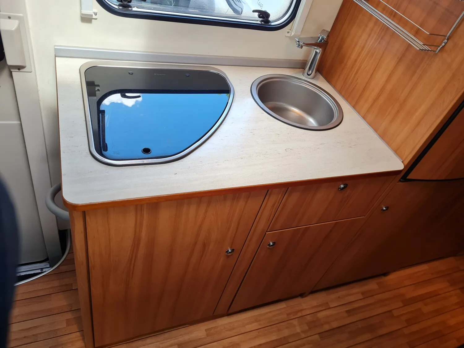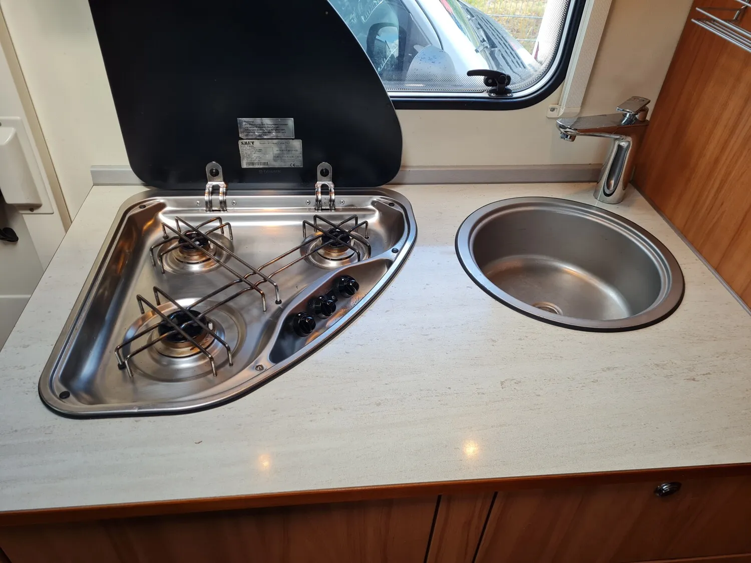 - Küchenzeile mit einem 3-Flammenkocher inkl. Glasabdeckung, einer Spüle inkl. Holzabdeckung, einer Schublade und Stauschränken