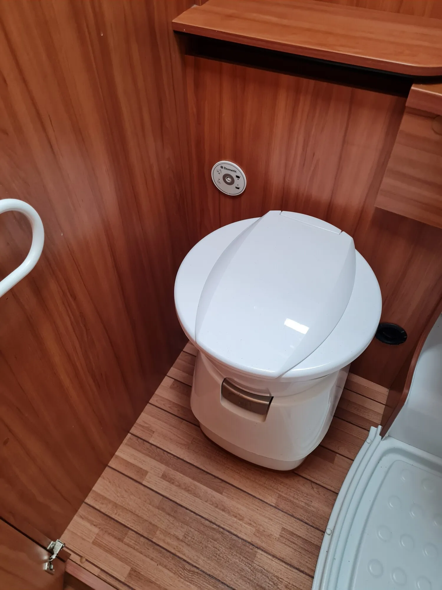 - Nasszelle mit einer Cassettentoilette von Dometicm einem schiebbaren Waschbecken, einem Spiegel und einer Duschausstattung