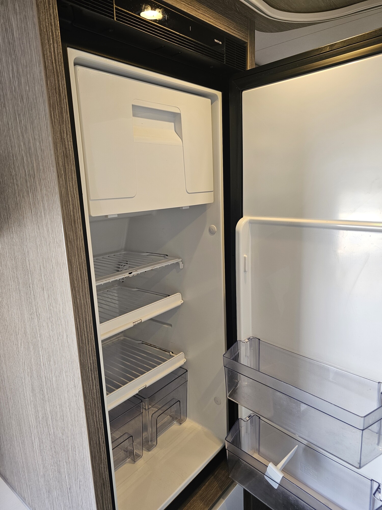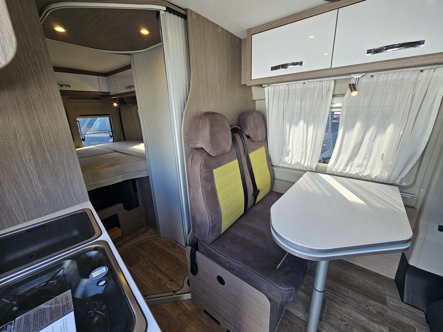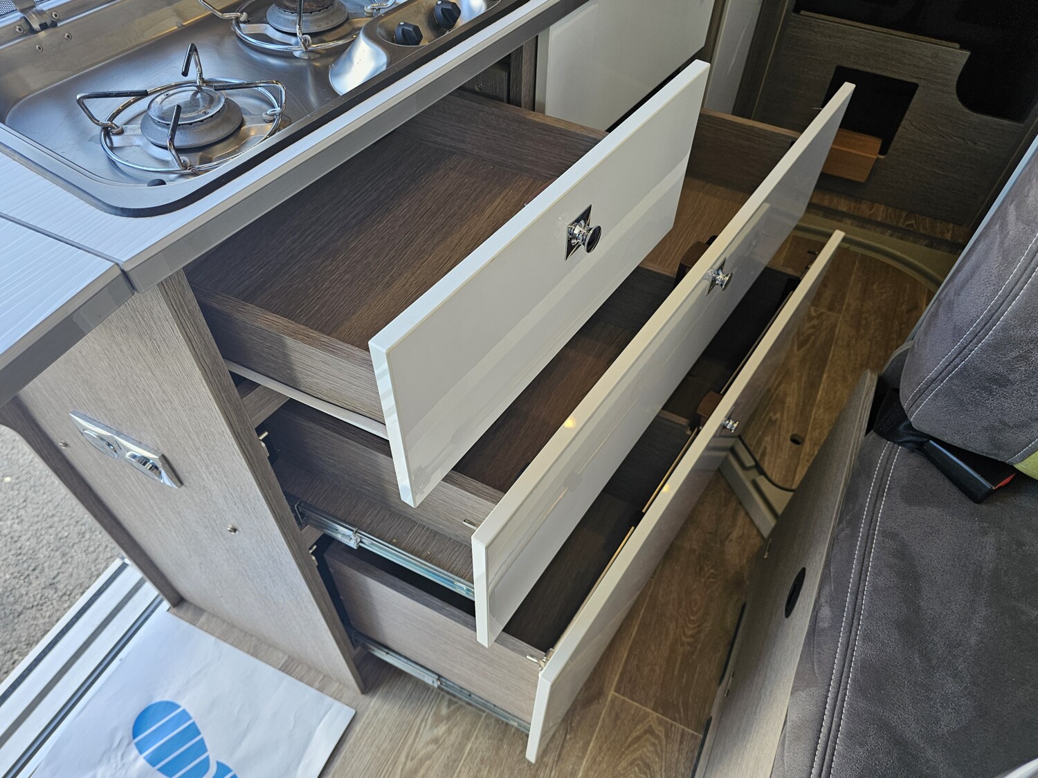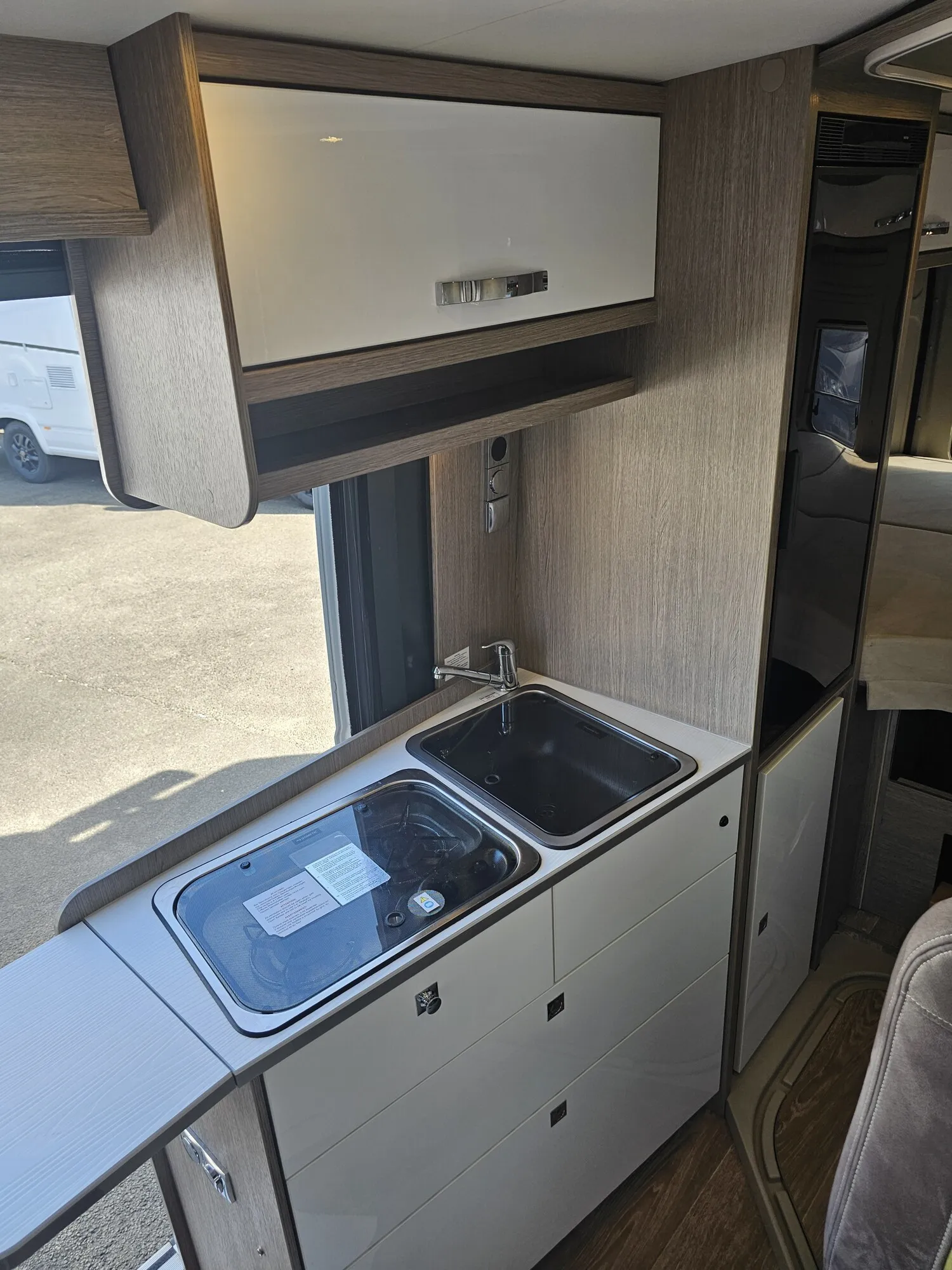 - Küchenzeile mit einem 2-Flammenkocher und einer Spüle inkl. Glasabdeckung, Schubladen, Arbeitsplattenerweiterung und einem Thetford Kühlschrank