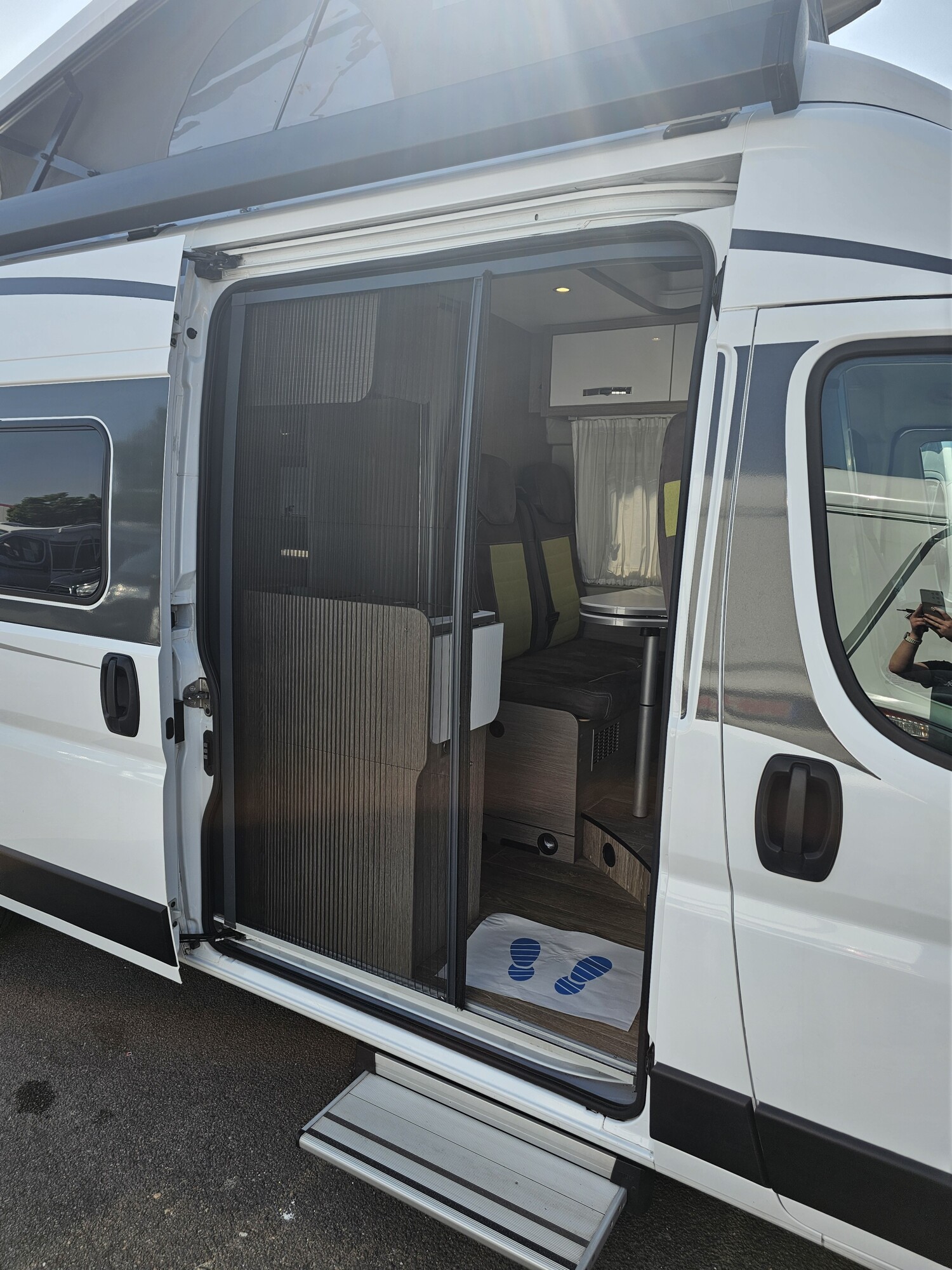 - Schiebetür mit einem Fliegenschutz und einer elektrischen Trittstufe